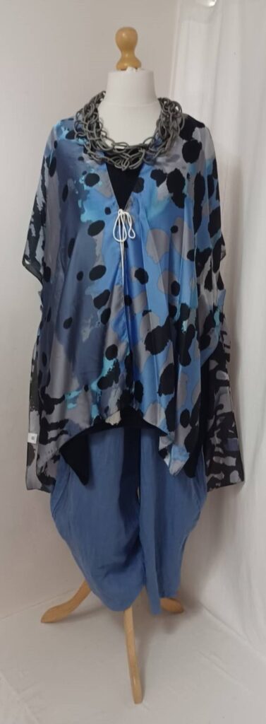 In this outfit, a blue & black, silk-blend kimono provides a light layer over the a black tunic and cornflower blue, linen, harem pants. A grey, rubber-chain necklace finishes the look off.
