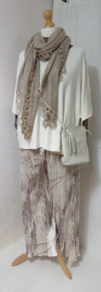 In this outfit, a cream, soft-knit jumper is layered over the trousers from the 2-piece by Layers and the taupe, polo-neck top. A beige leather, cross-body bag and mocha, lace-edge scarf complete the look.