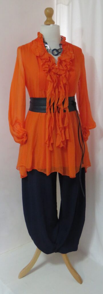 In this outfit, an orange, silk, tunic blouse, with a fabulous, ruffled front, is worn with a pair of navy blue, jersey, harem pants, by designer label Cover Up. The Irina belt, in navy blue, is used to define the waist and the look is finished off with a blue, resin-link necklace.
