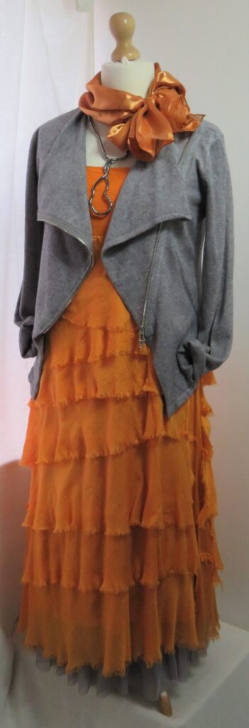 In this outfit, a grey, biker-style cardigan, in a super-soft knit, is layered over an orange, silk skirt-dress. A grey petticoat is worn underneath, to add volume, and the outfit is finished off with a silver necklace and an orange, silky scarf.