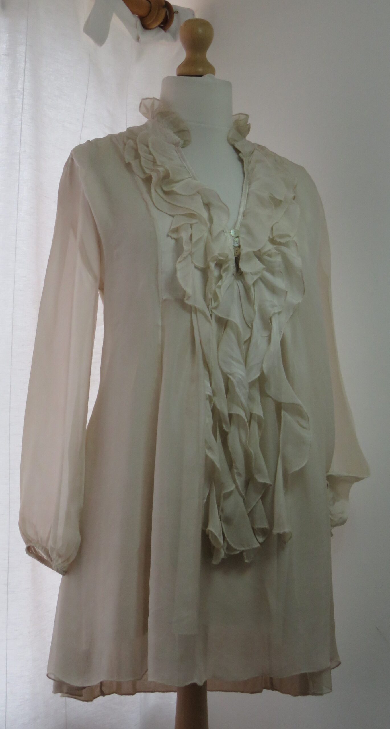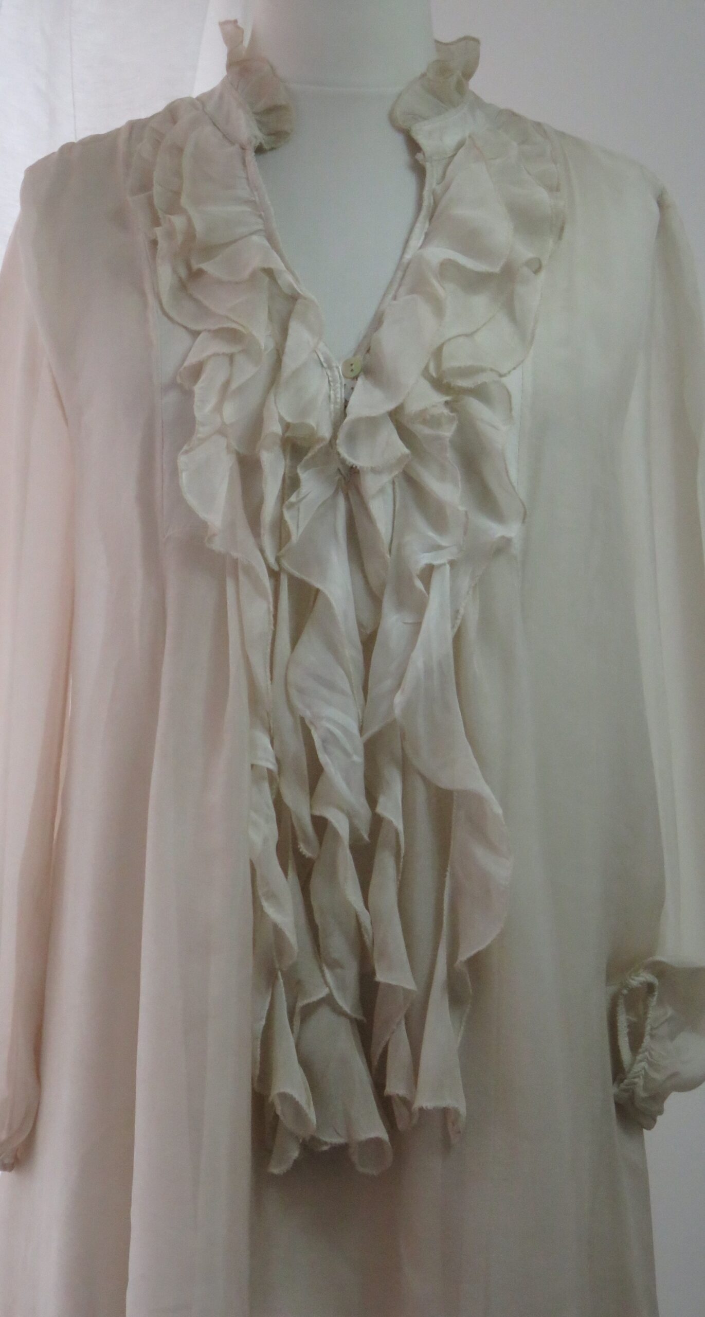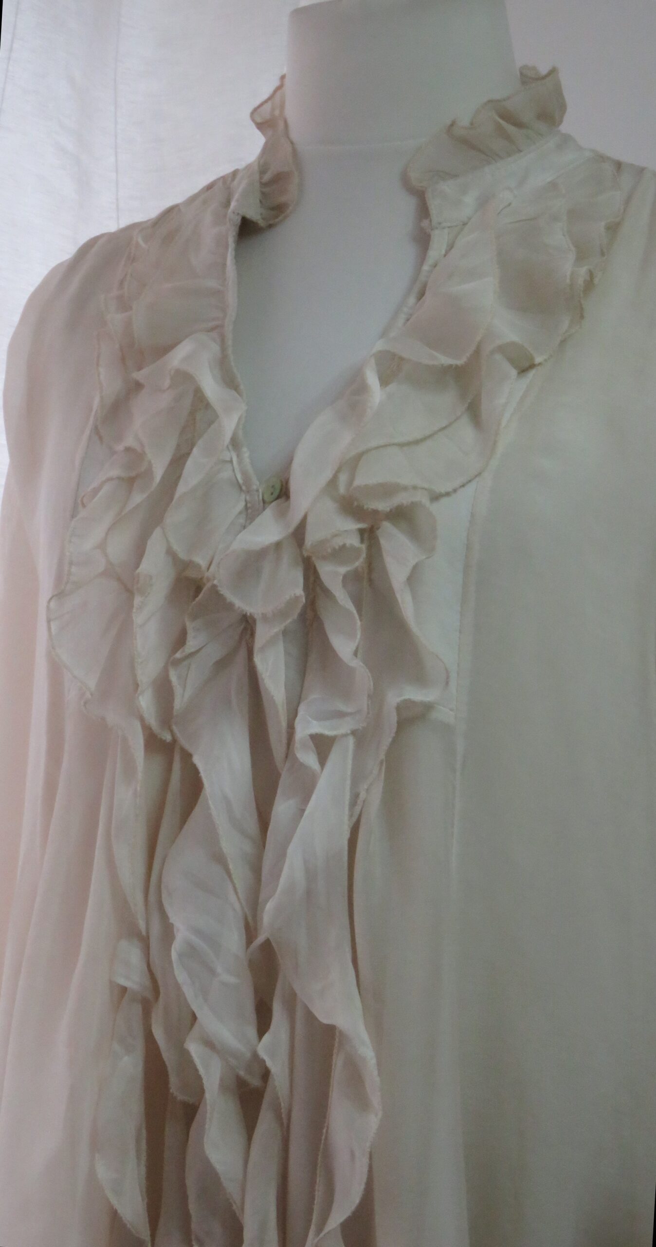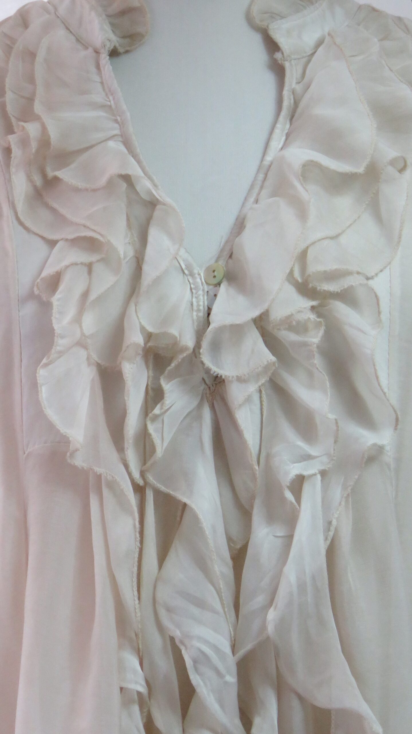 - Fabulous ruffled neckline and front, ending in long loose pieces