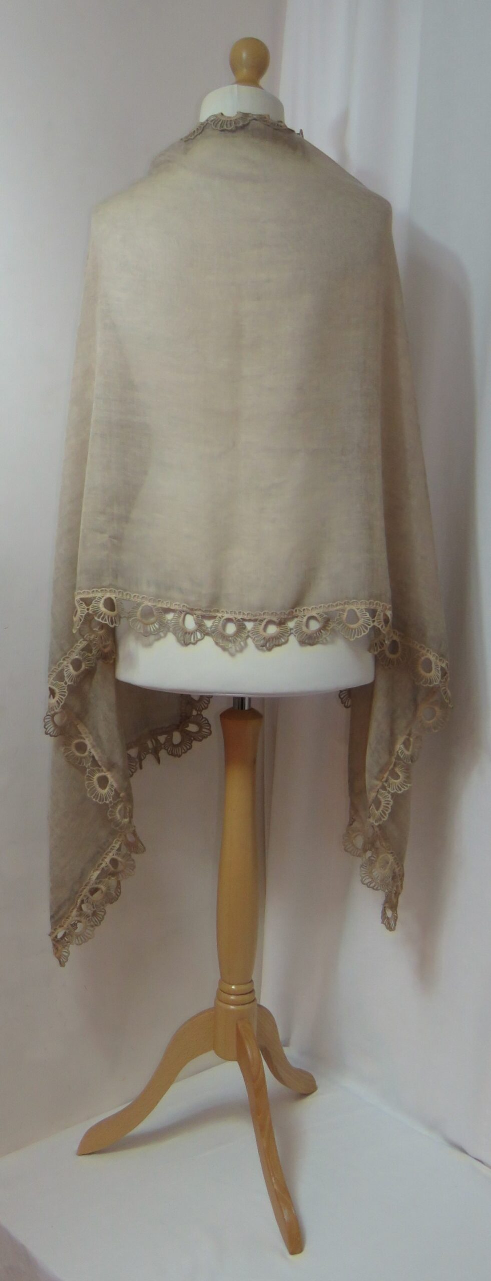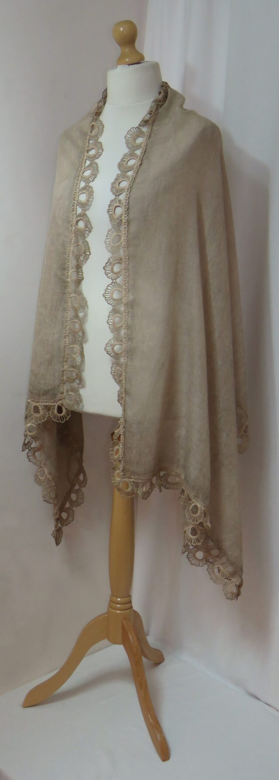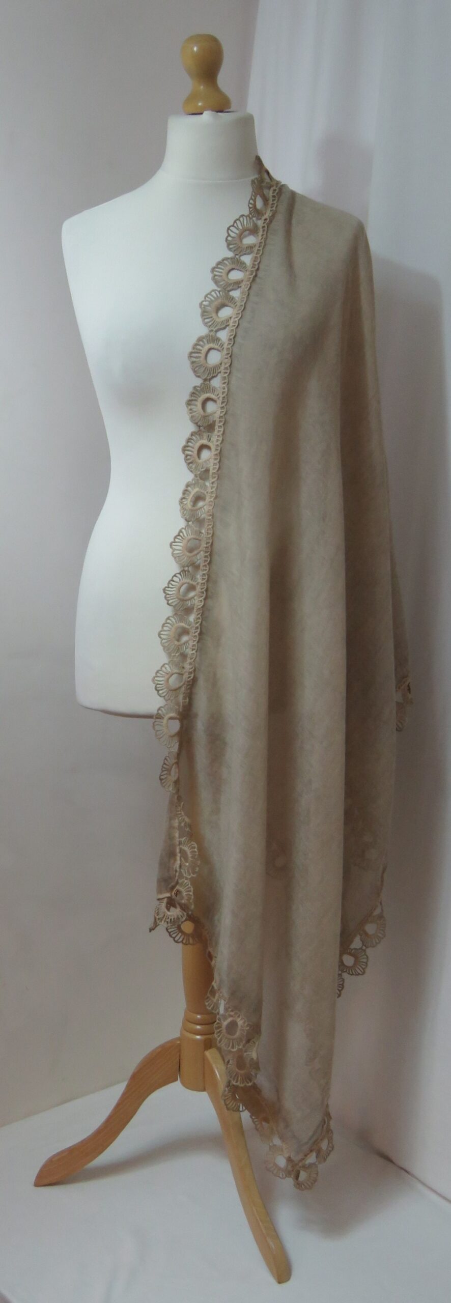 Beige, vintage-wash, lace-edged, large scarf