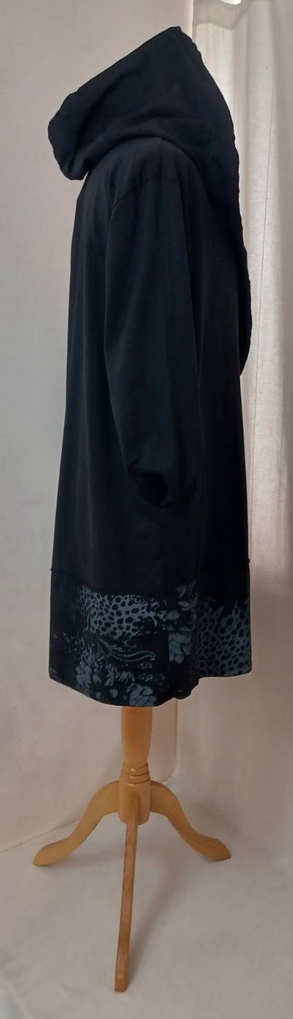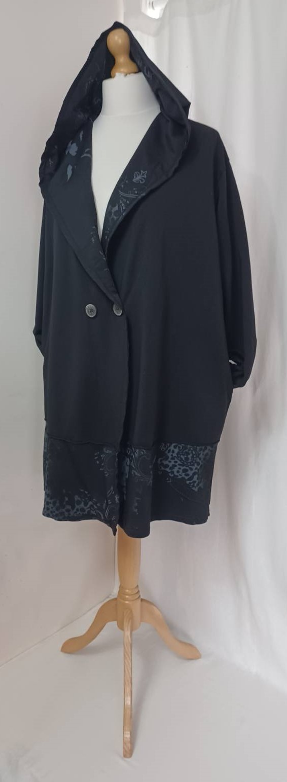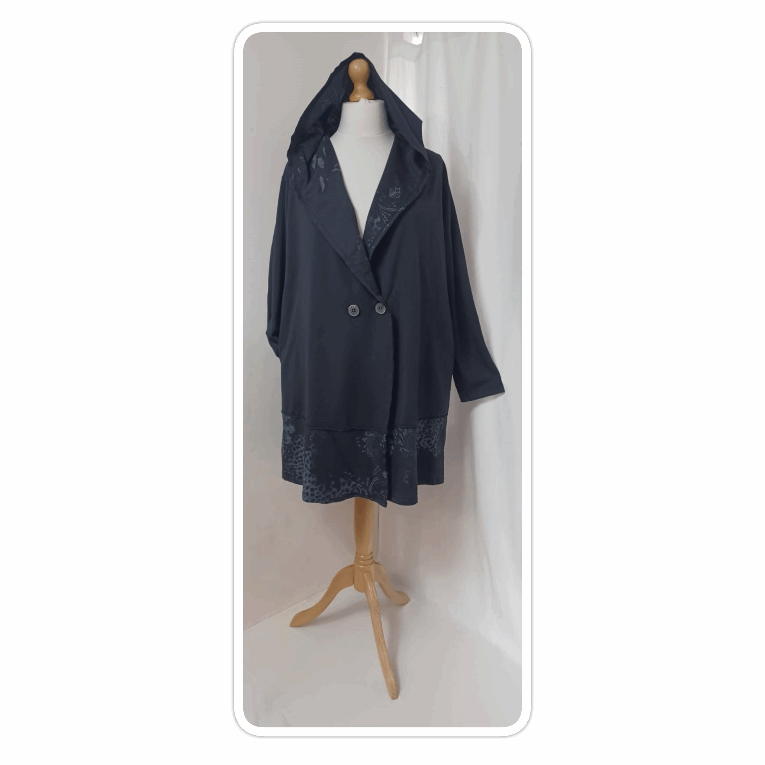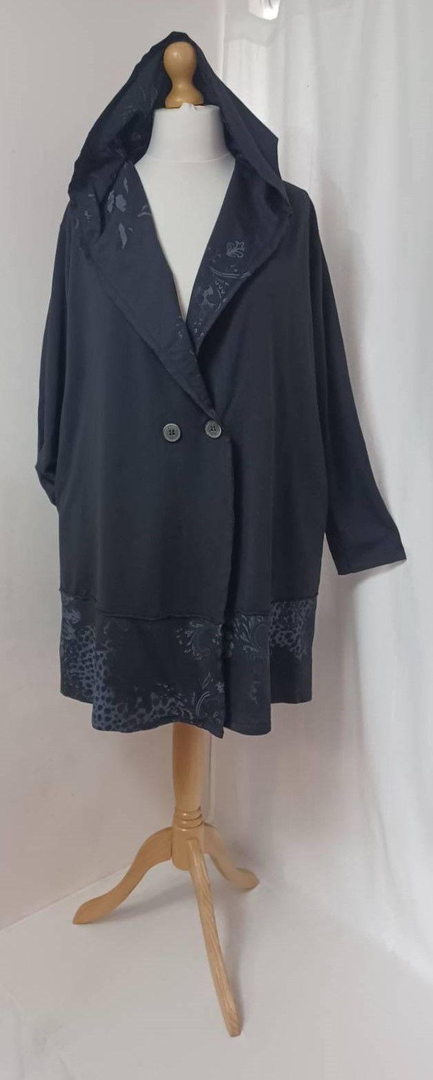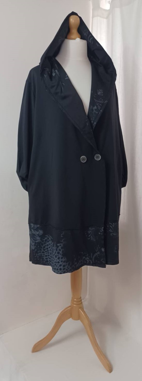 - Large, shawl collar – in a lovely floral/animal-print fabric – which falls into a fabulous hood at the back