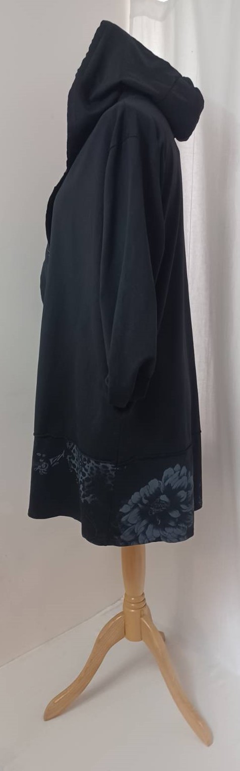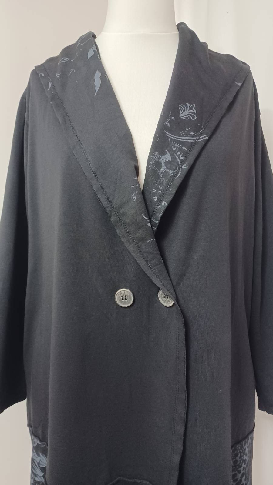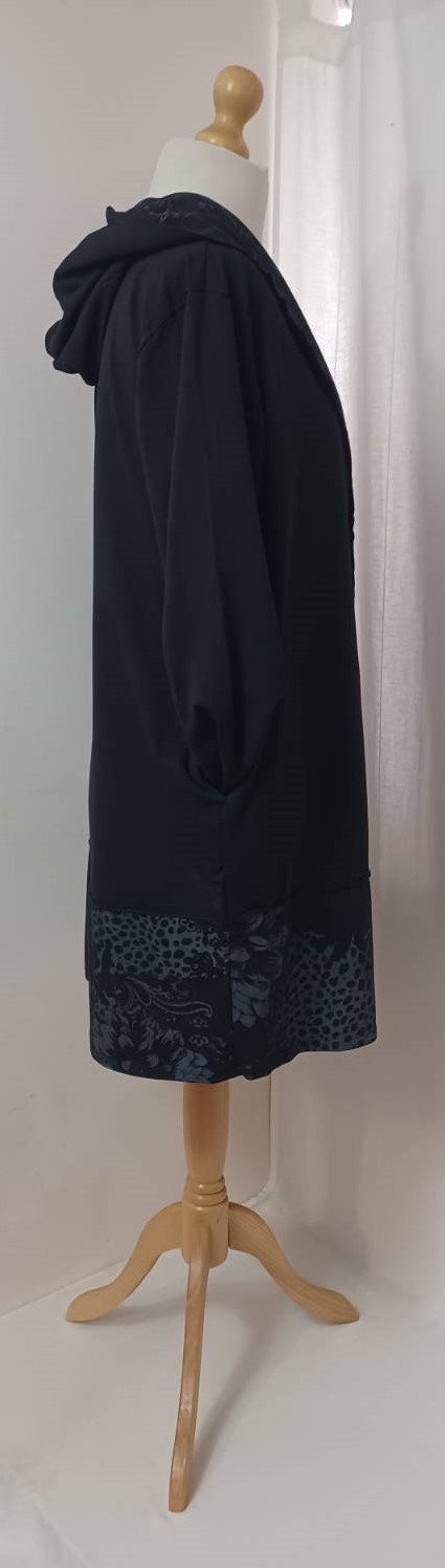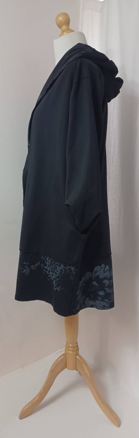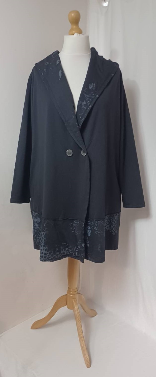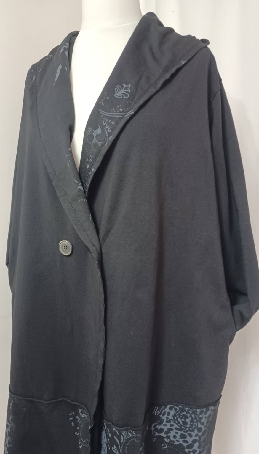 - Large, shawl collar – in a lovely floral/animal-print fabric – which falls into a fabulous hood at the back