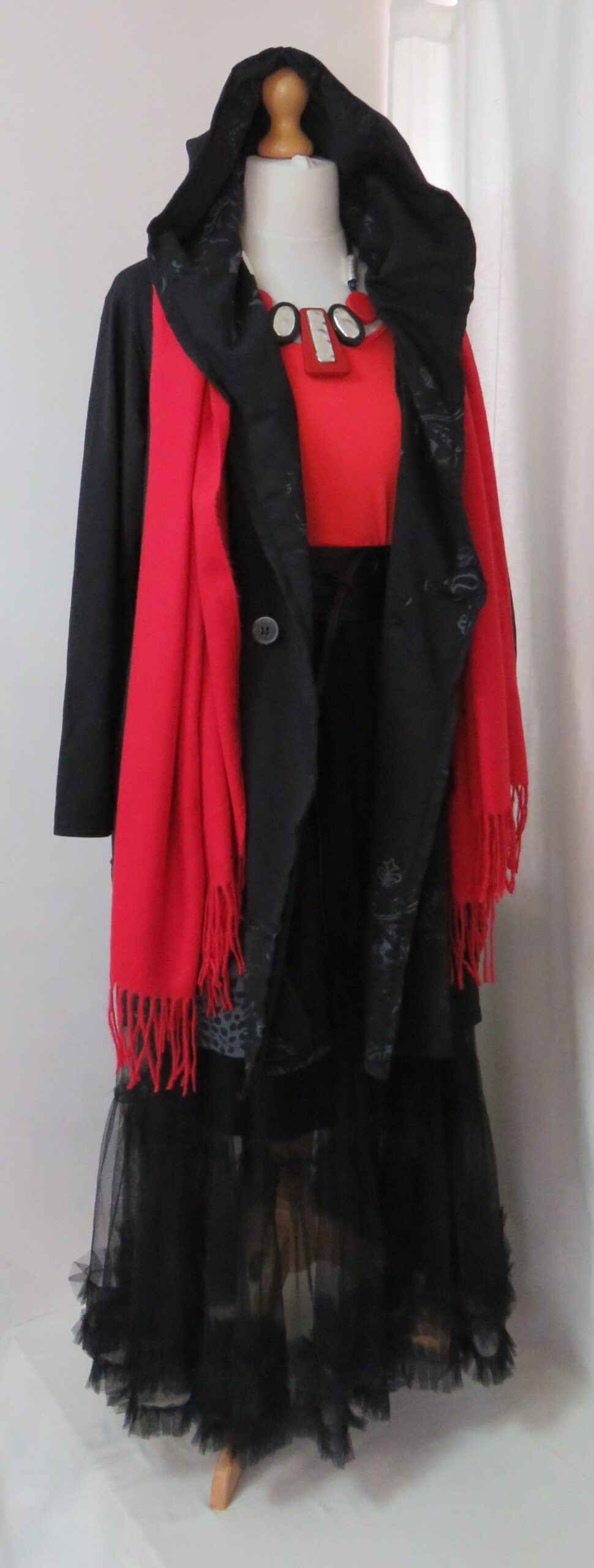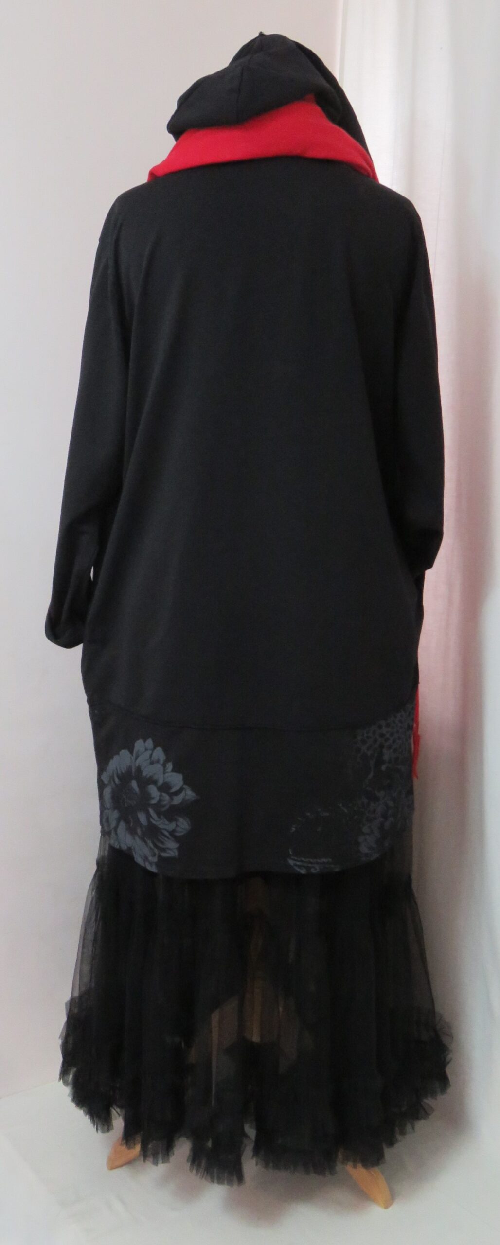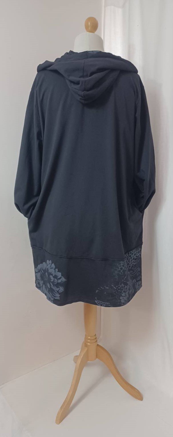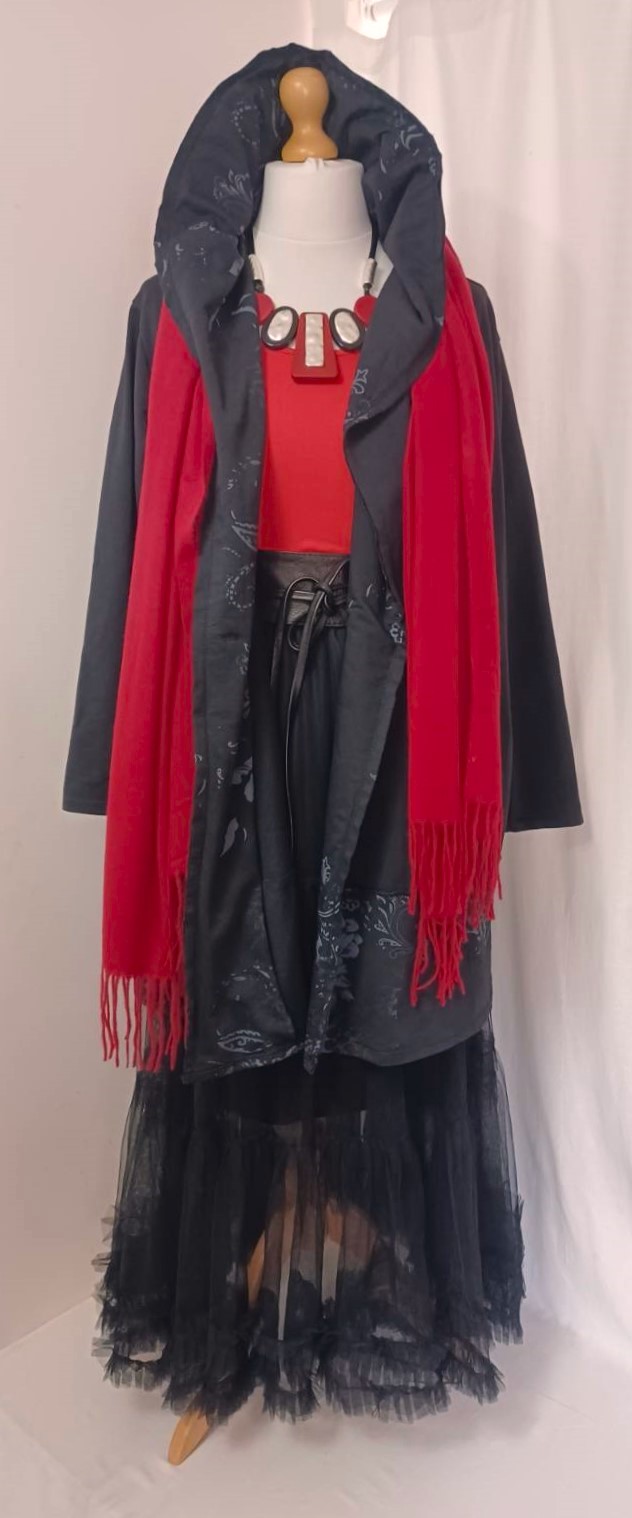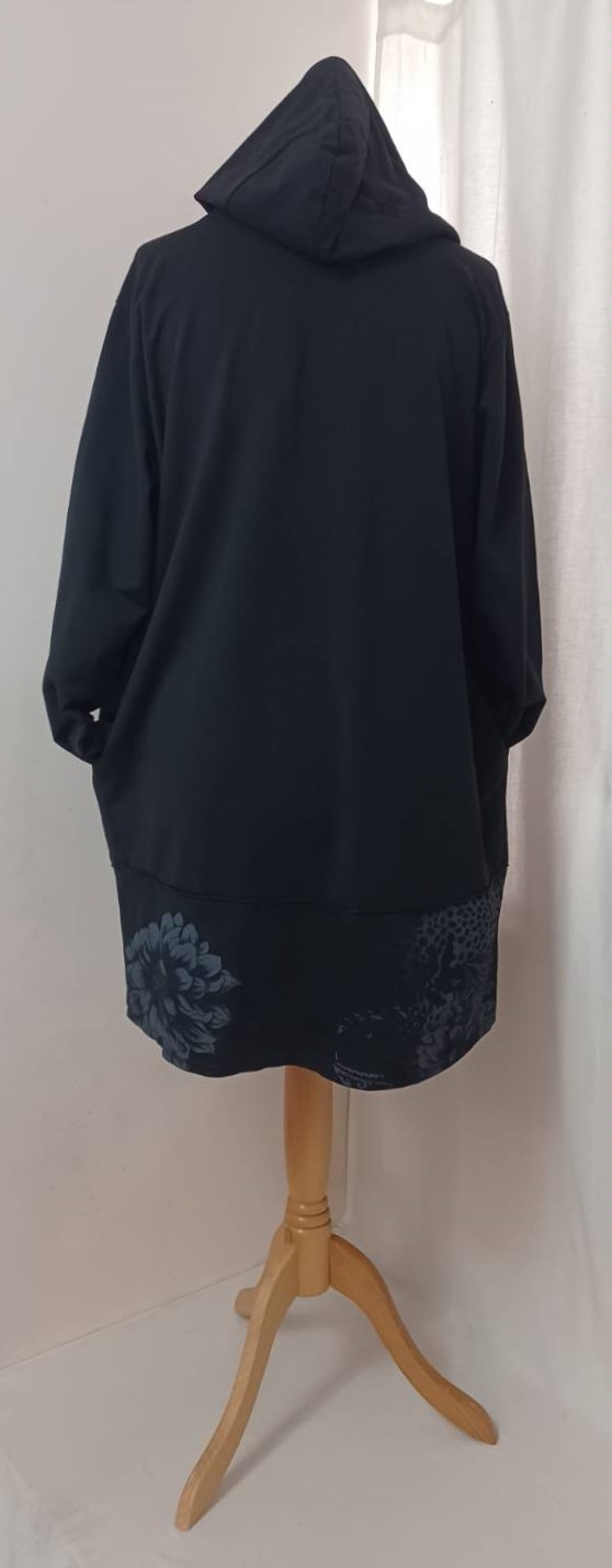 - Large, shawl collar – in a lovely floral/animal-print fabric – which falls into a fabulous hood at the back
