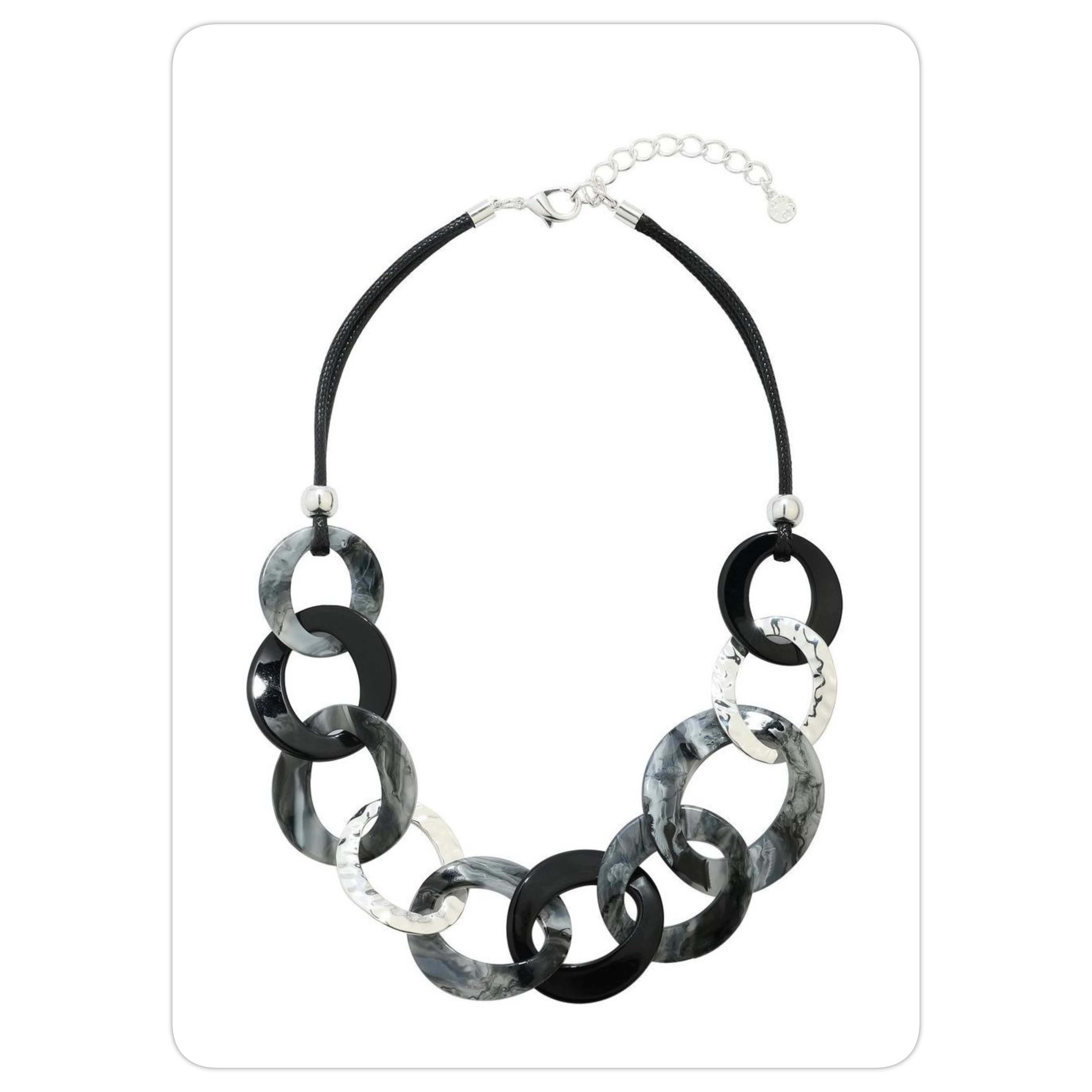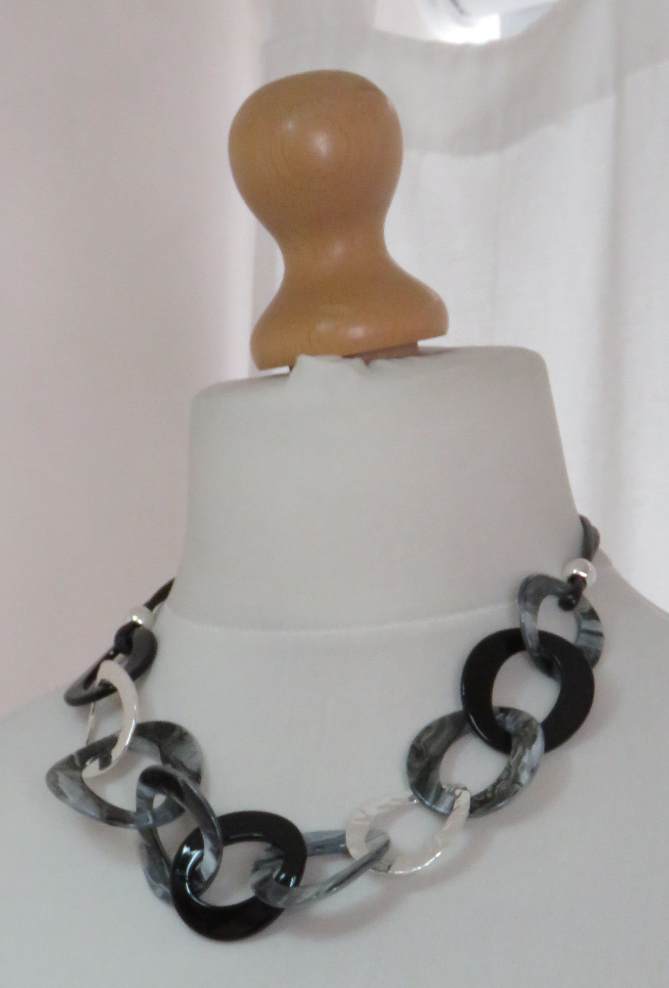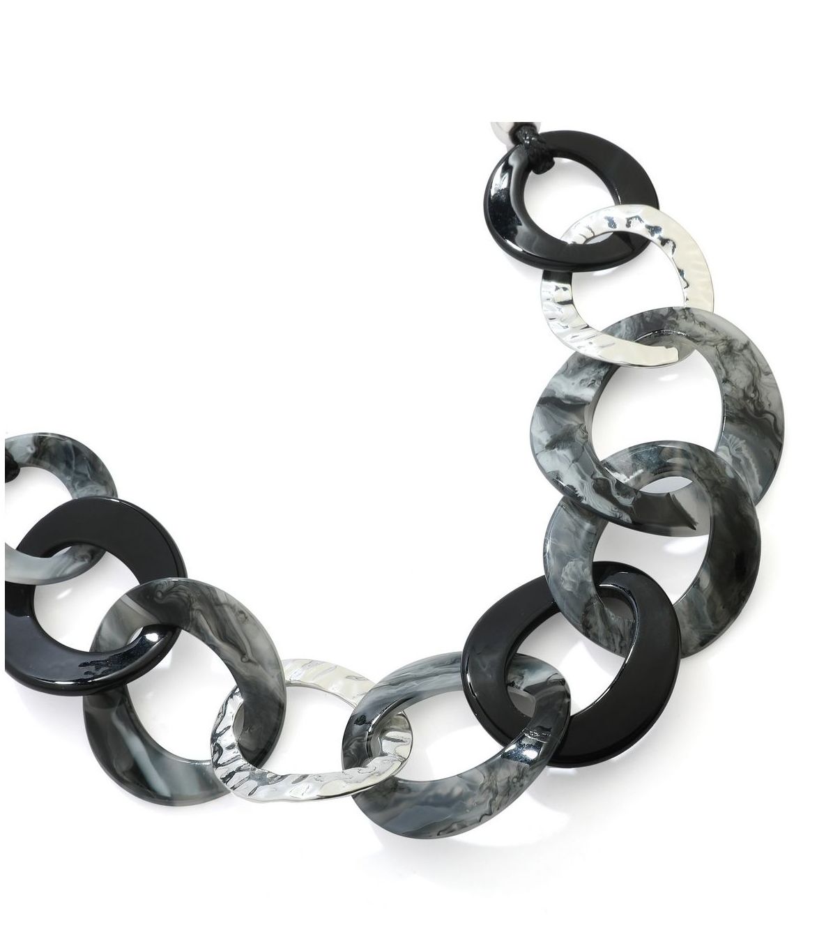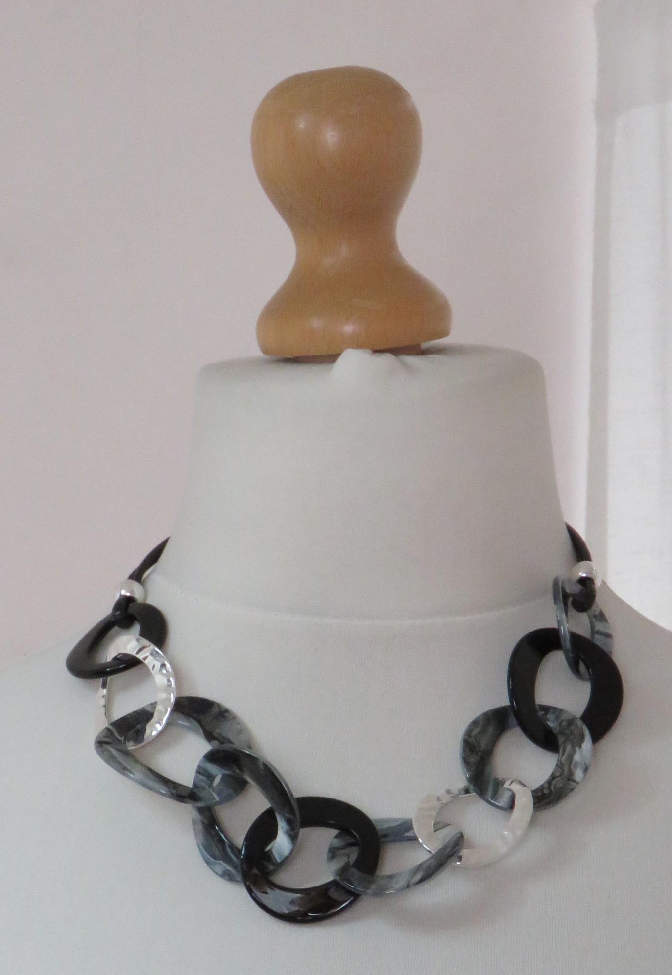 • Statement necklace, made of black & grey marble-effect resin links and hammered, silver-coloured metal ones, suspended from a waxed cord