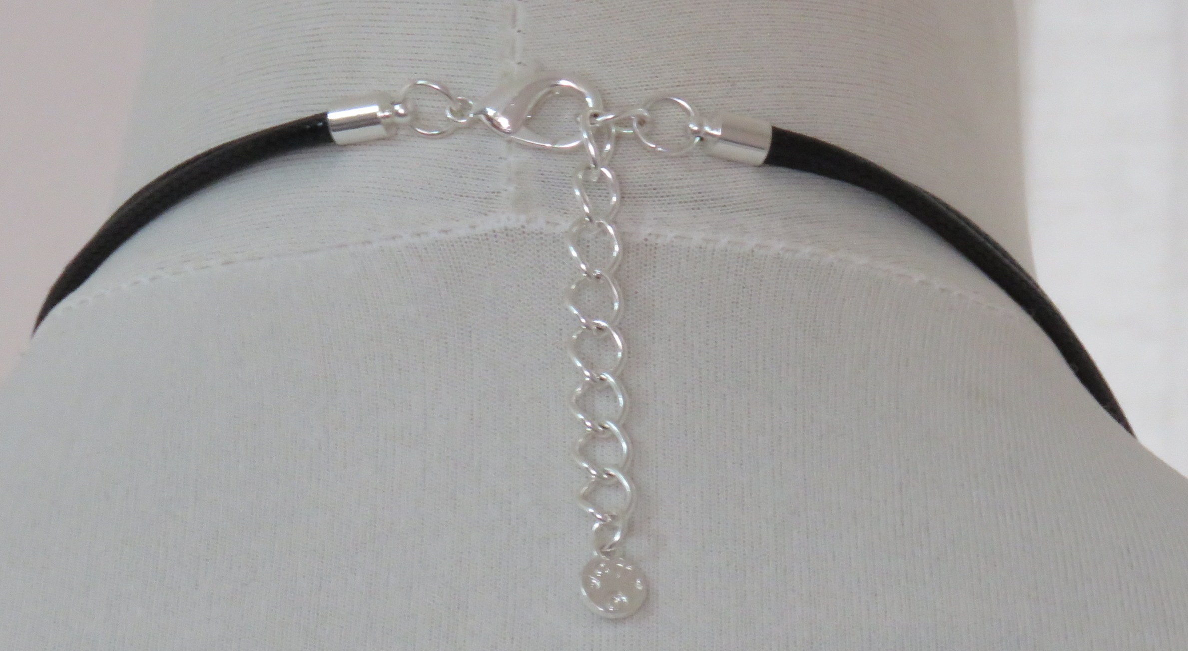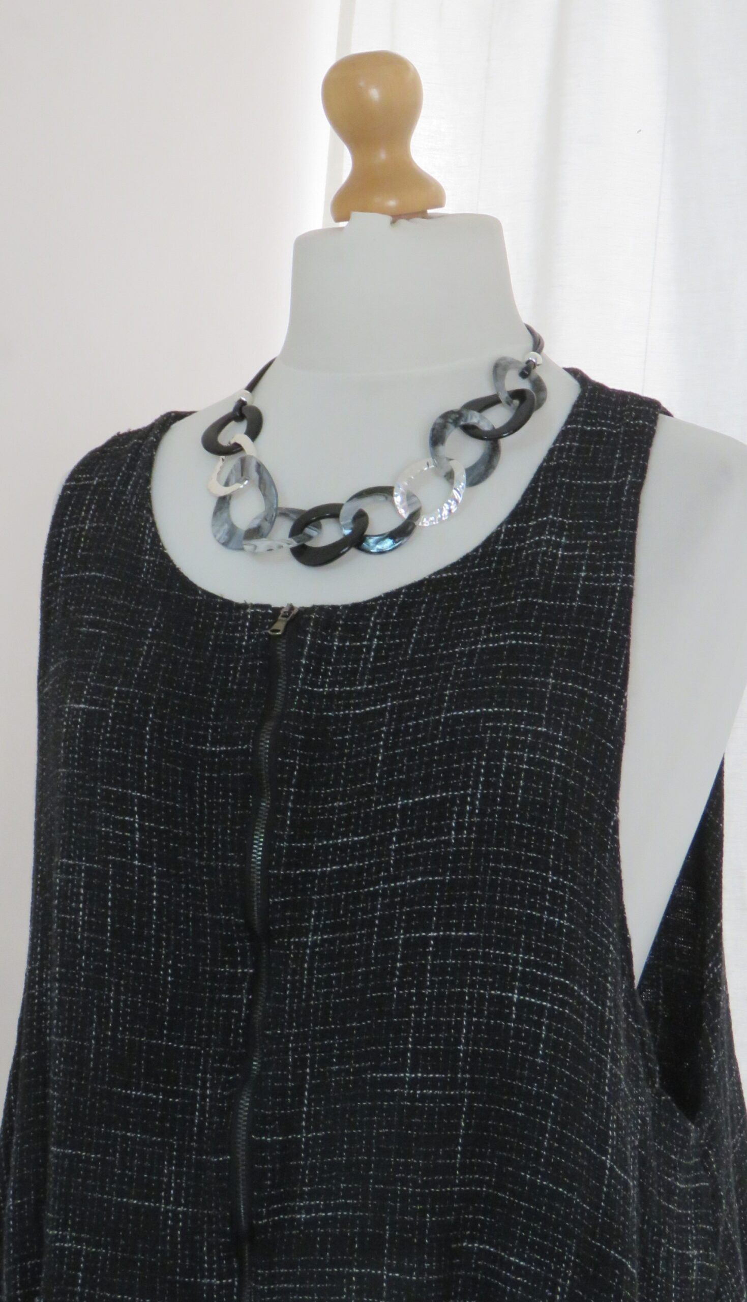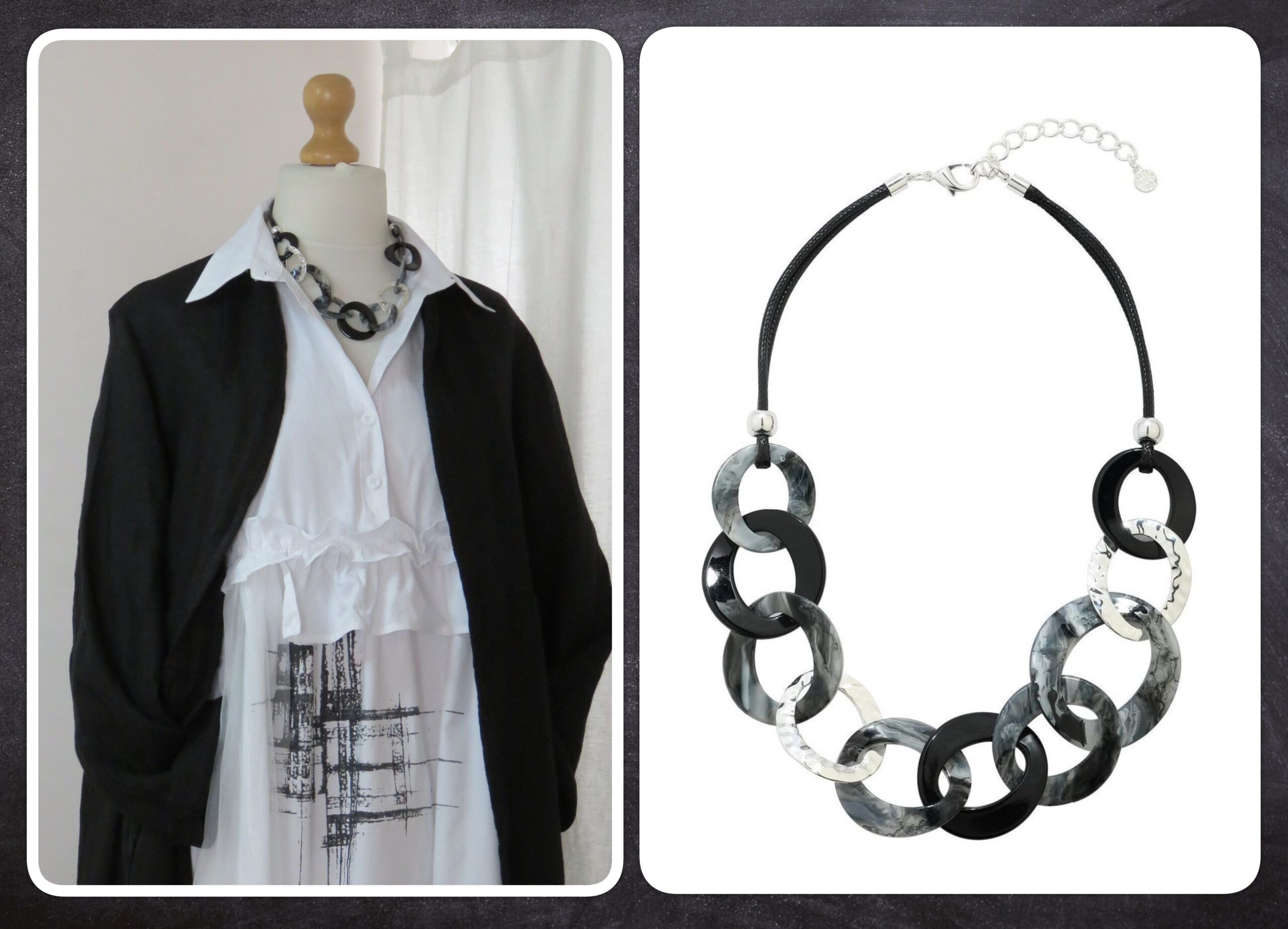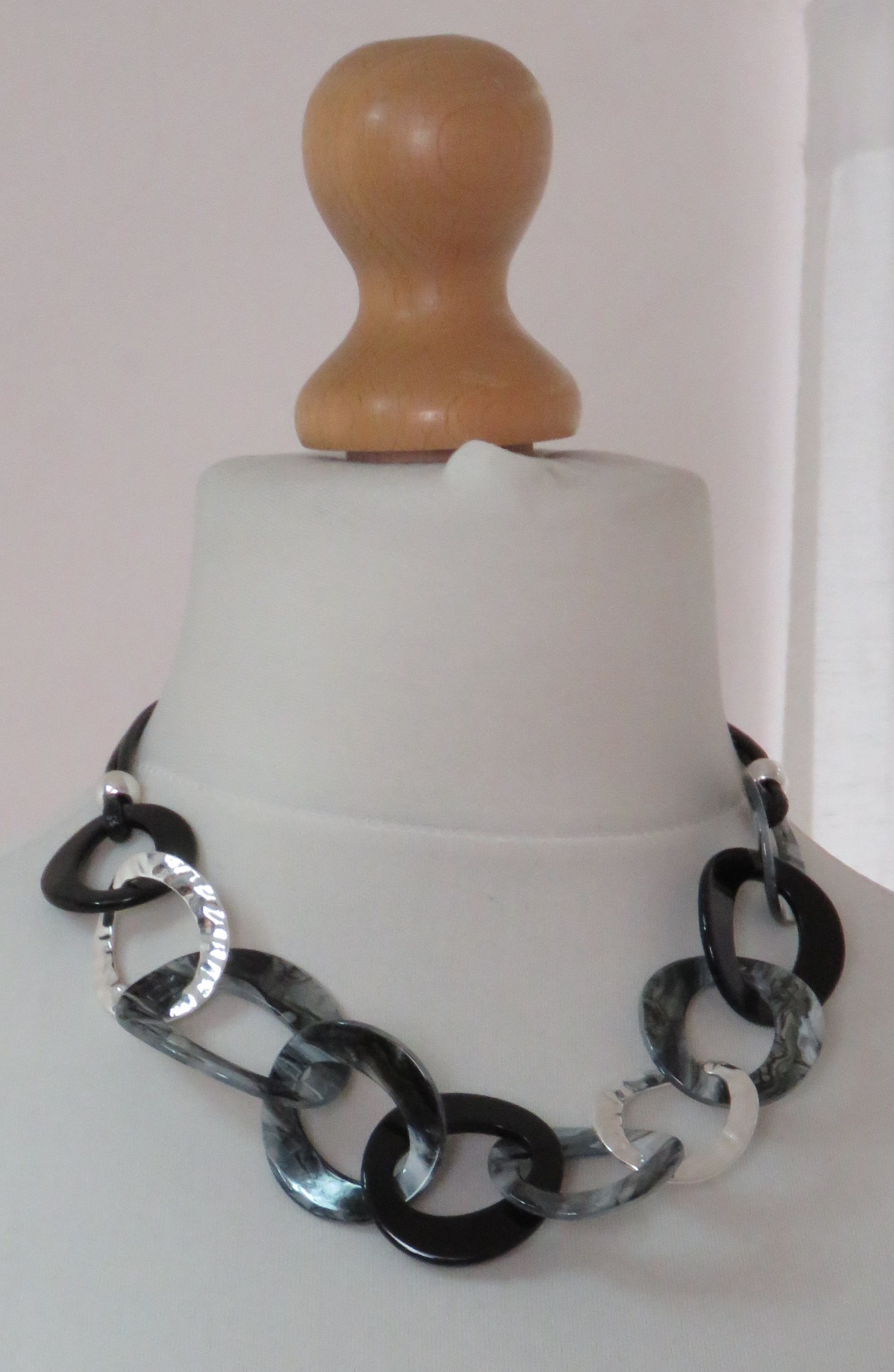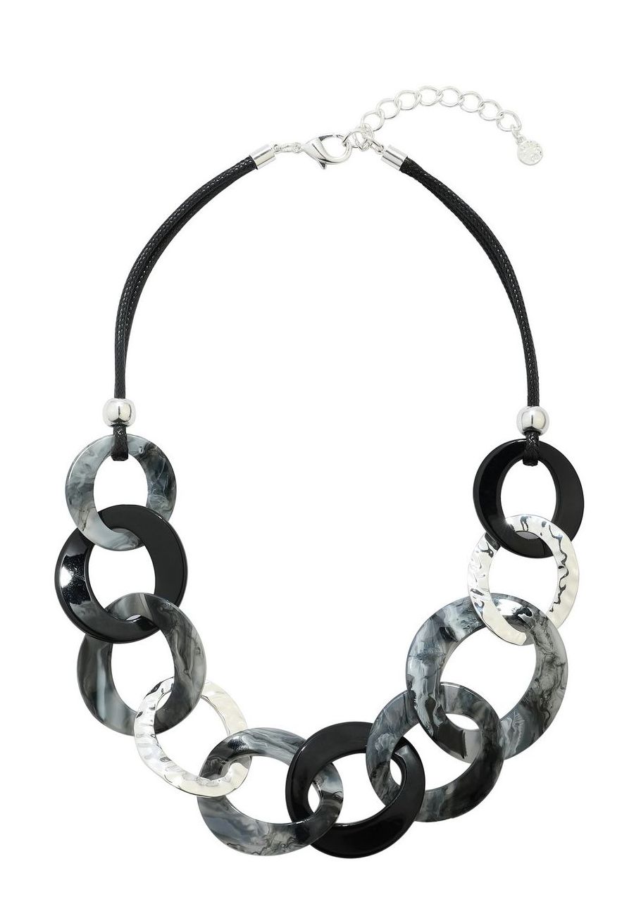 • Statement necklace, made of black & grey marble-effect resin links and hammered, silver-coloured metal ones, suspended from a waxed cord