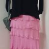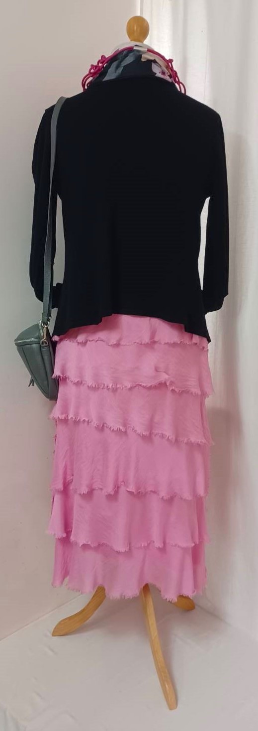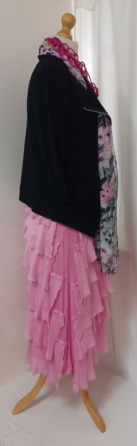 • Asymmetrical hem, shorter at the back and at the bottom of the zip, and hanging in points at the front