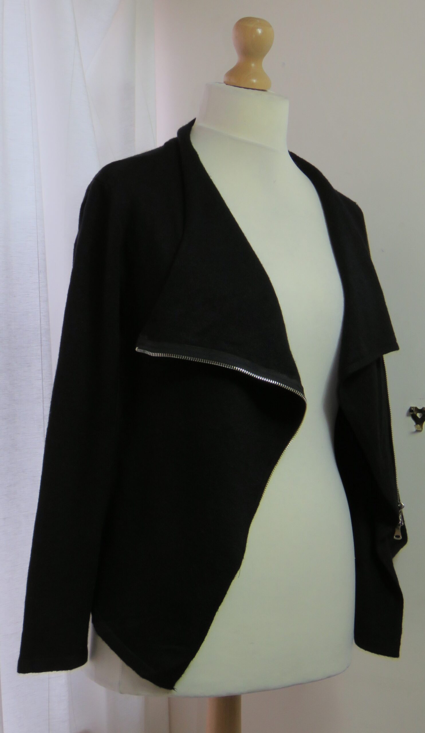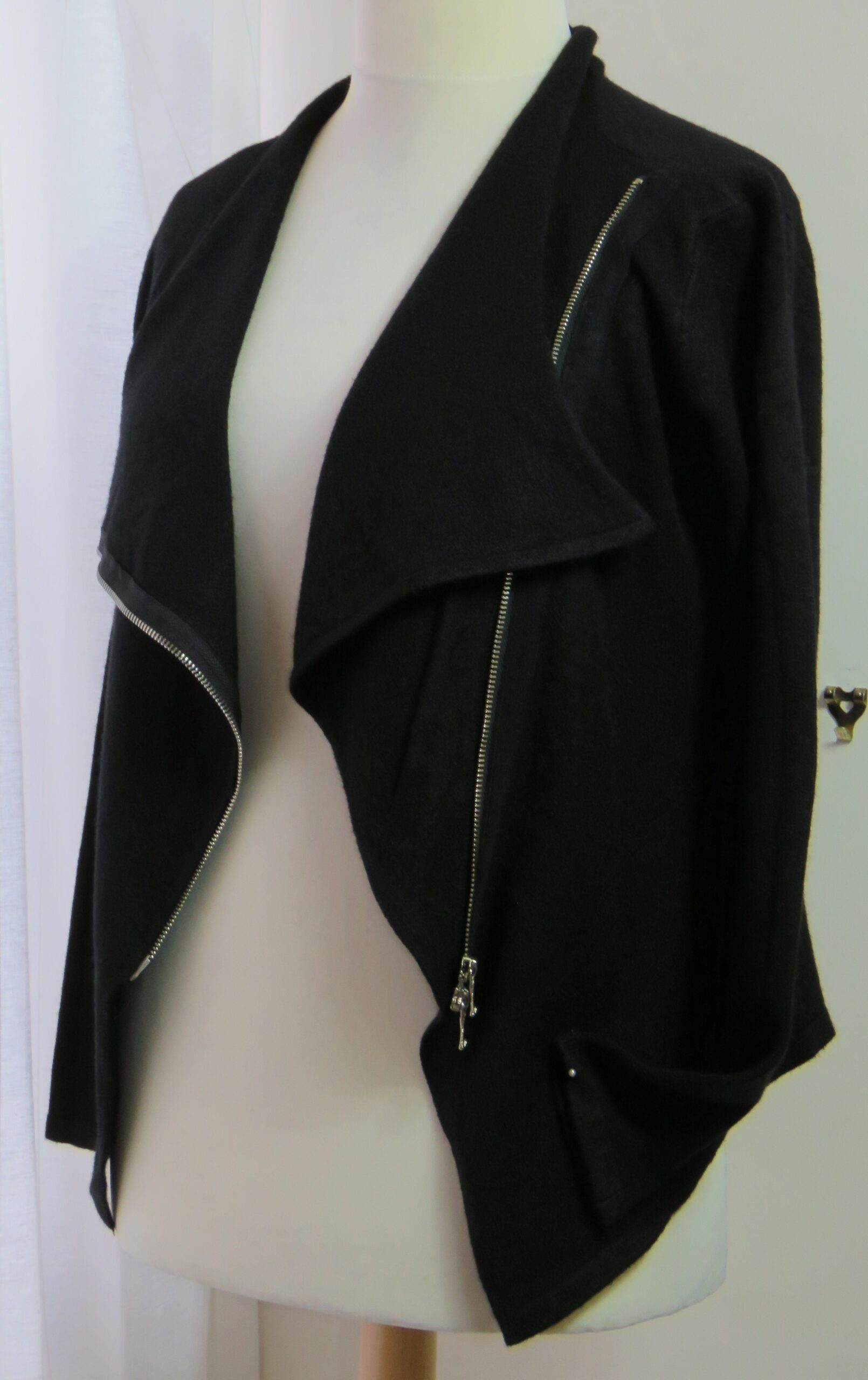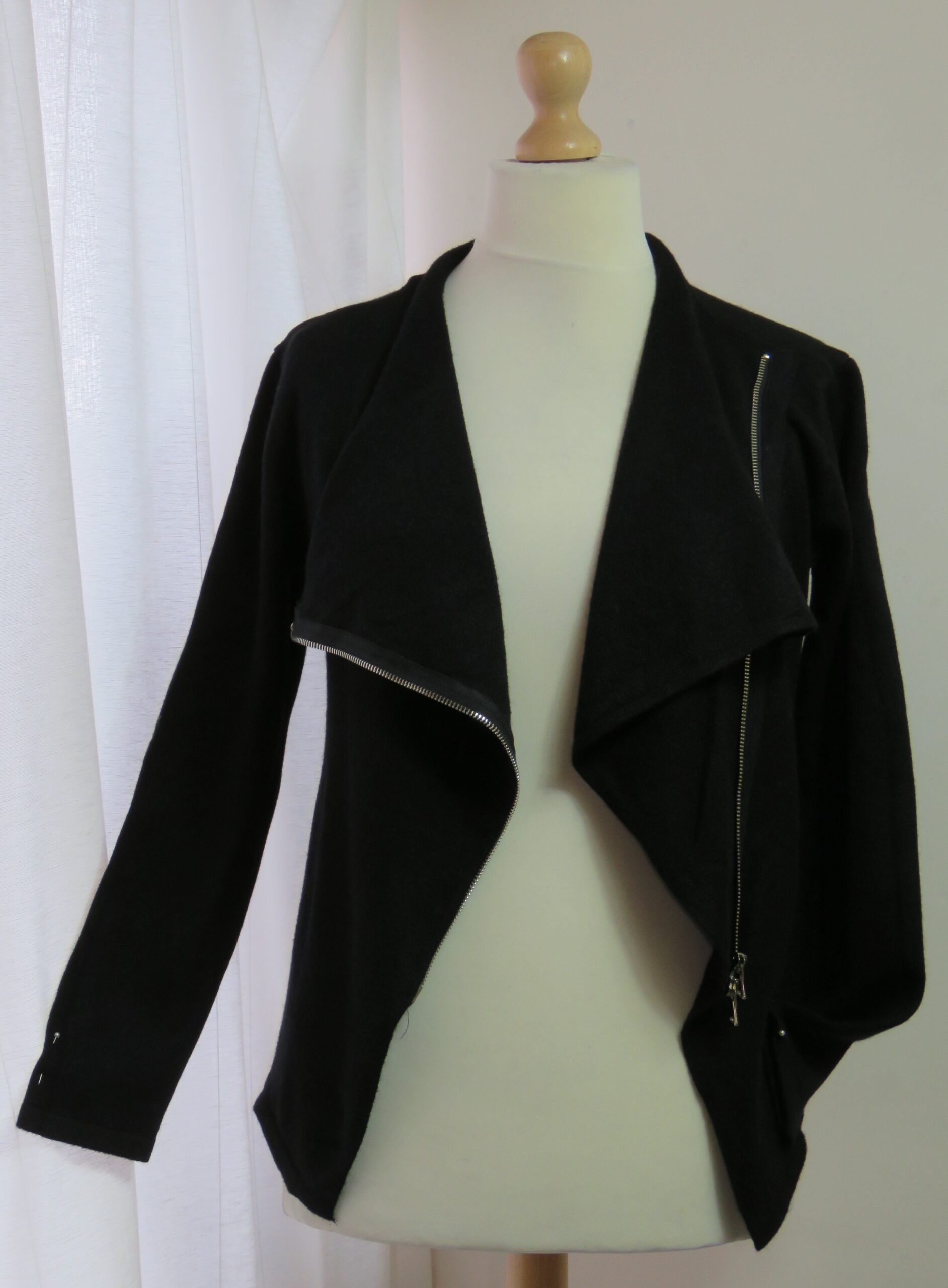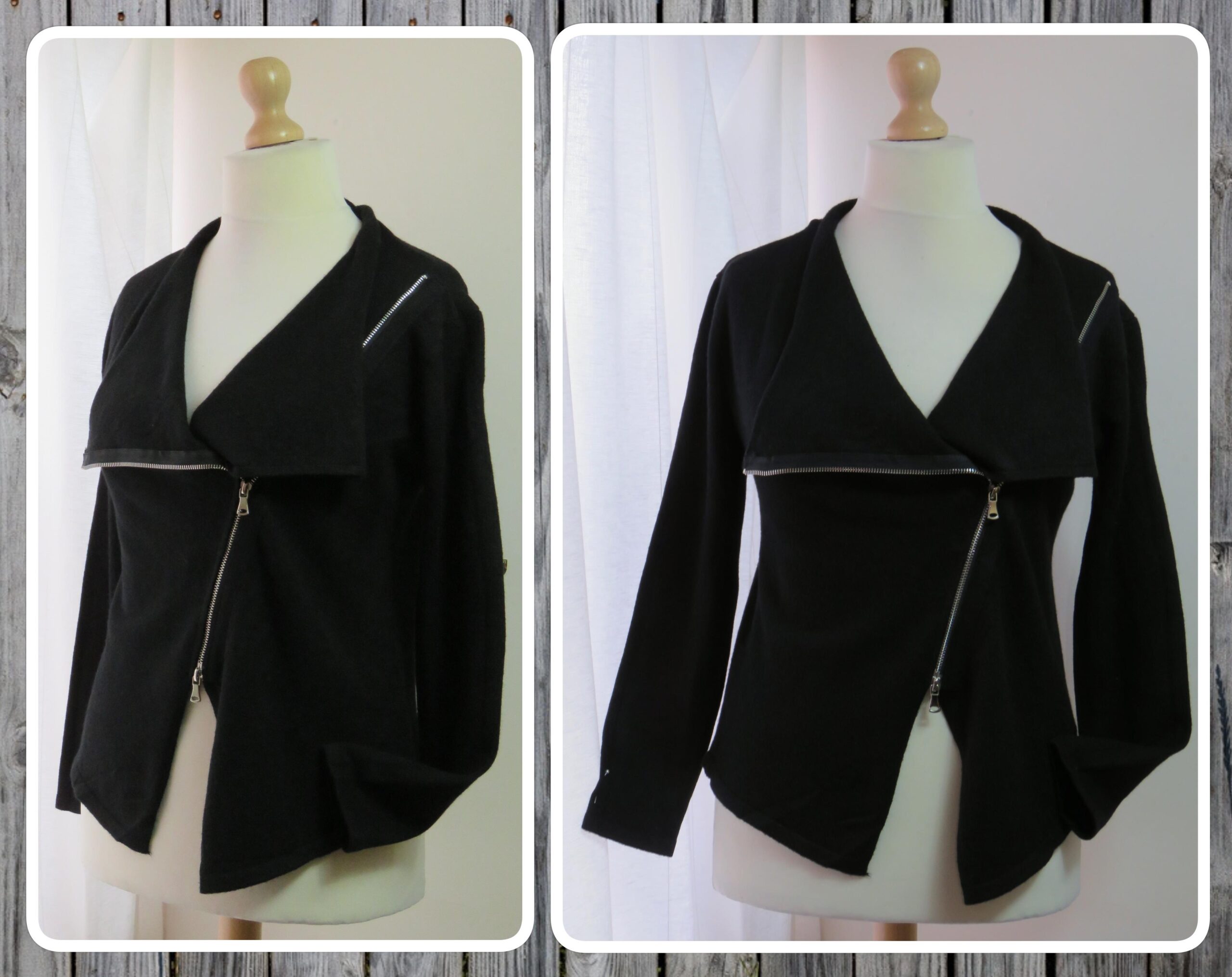 • Biker style, crossing over at the front and fastening with a small button inside the right-hand side of the neck and a 2-way zip on the left-hand side