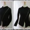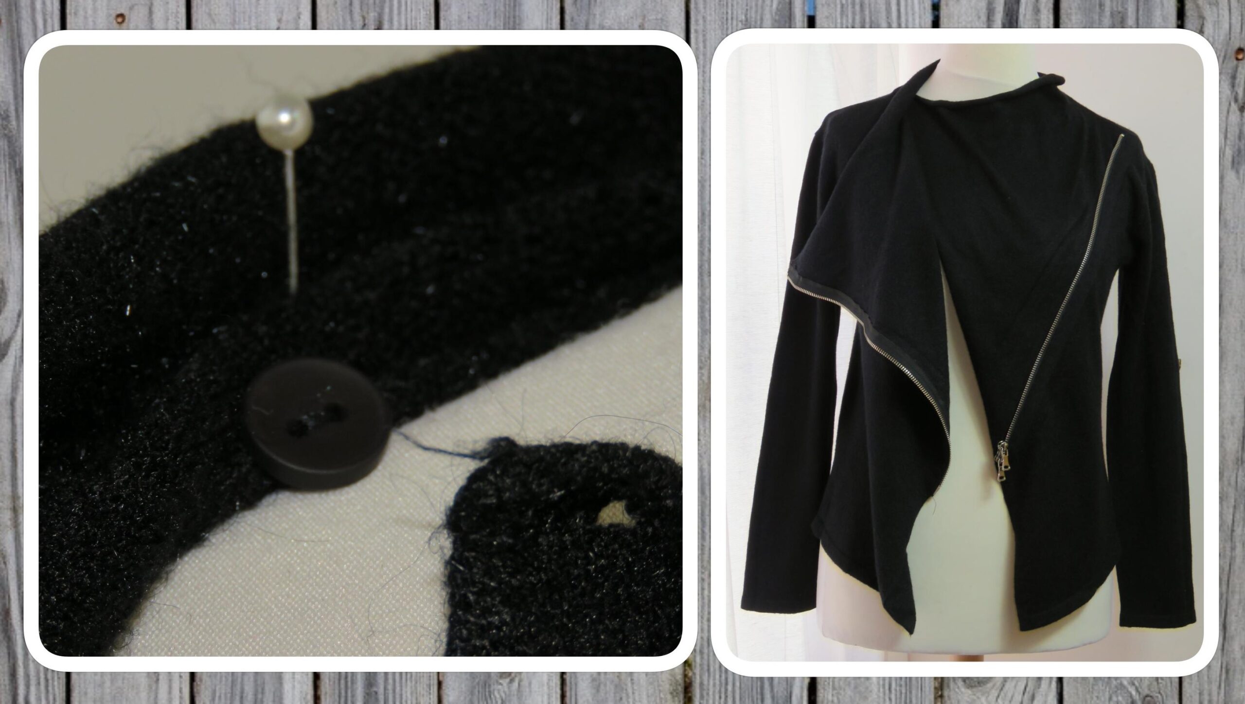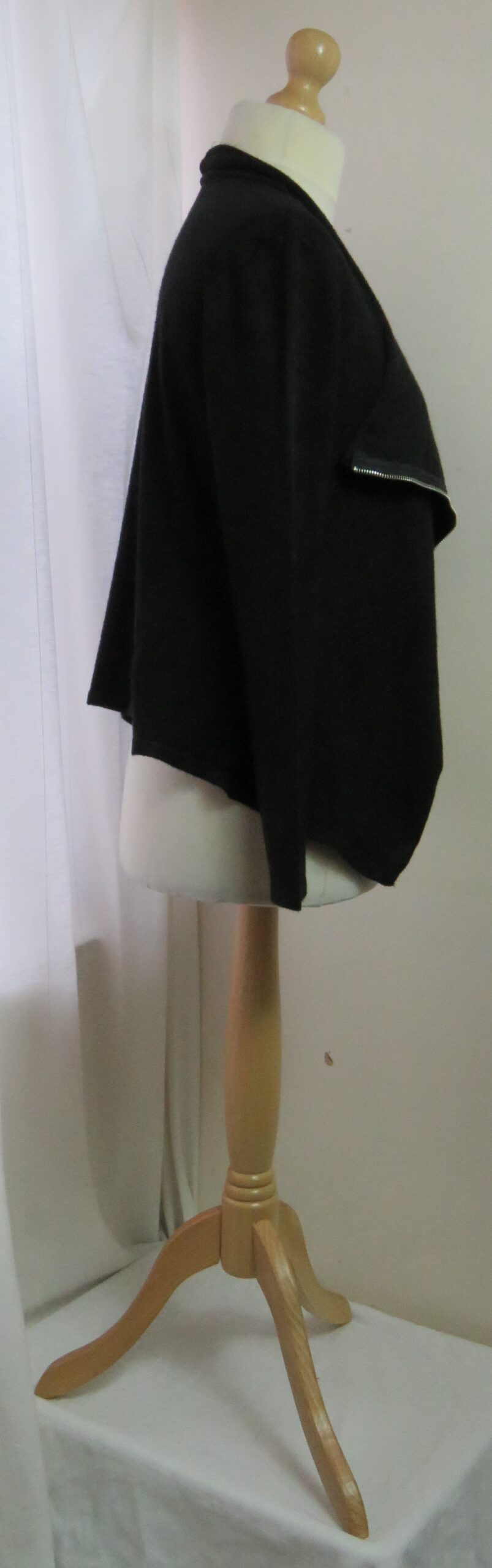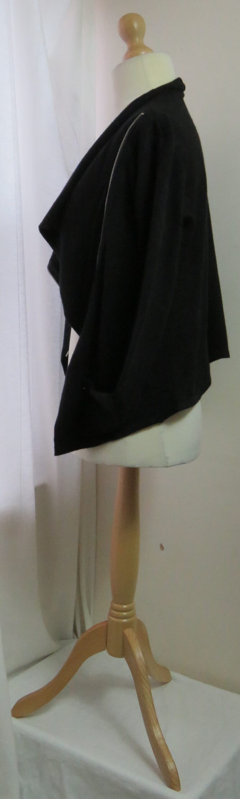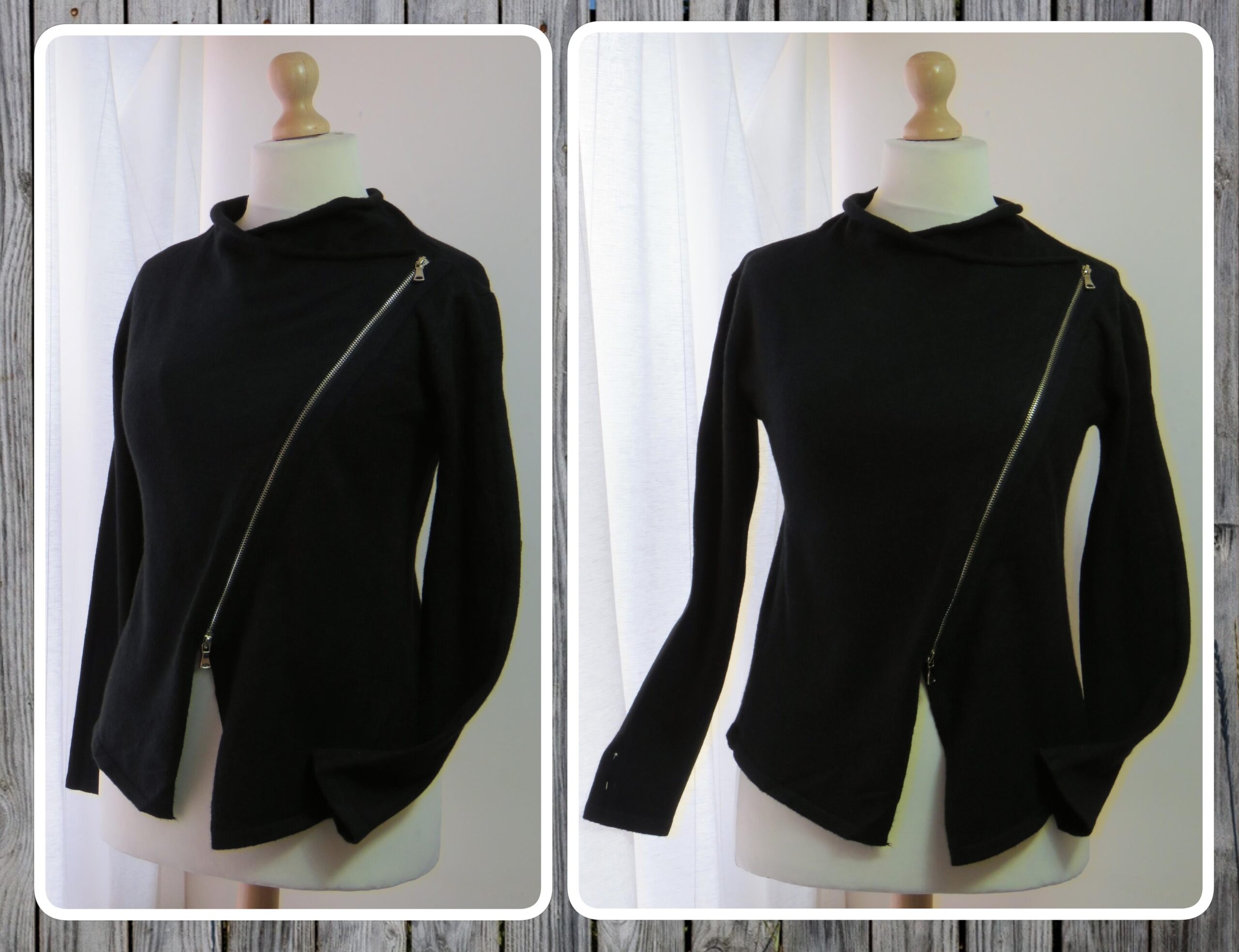 • Biker style, crossing over at the front and fastening with a small button inside the right-hand side of the neck and a 2-way zip on the left-hand side