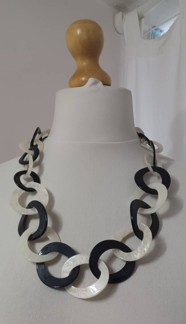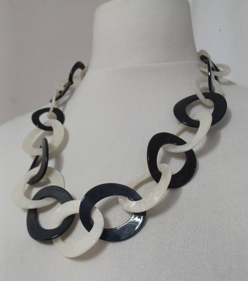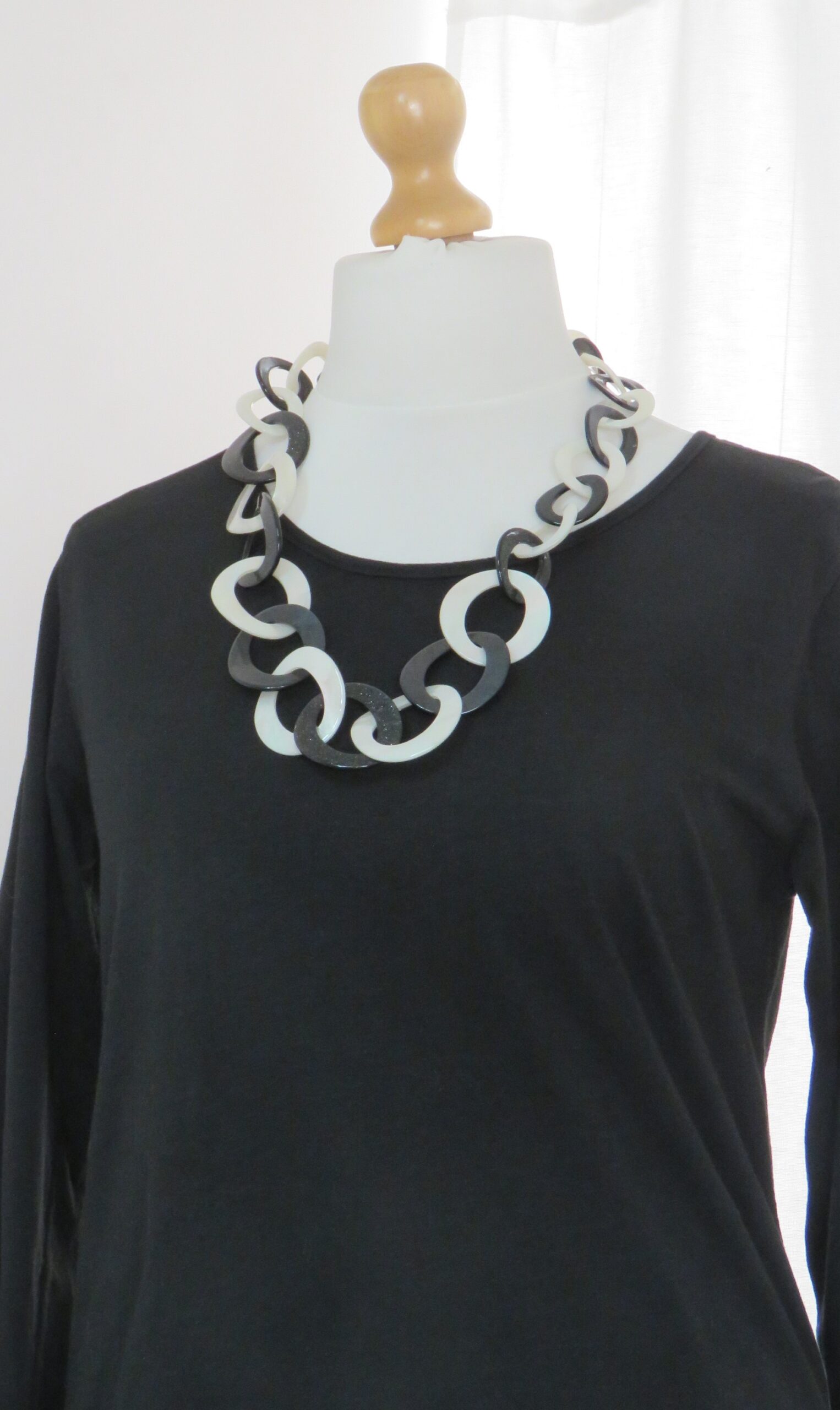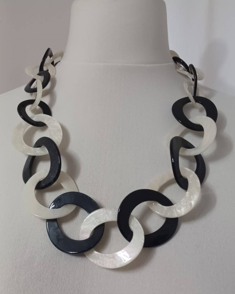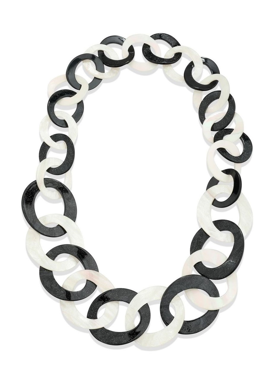 • Lagenlook, statement necklace, made of black and pearly-white resin links, which are plain on one face and have a subtle sparkle on the other