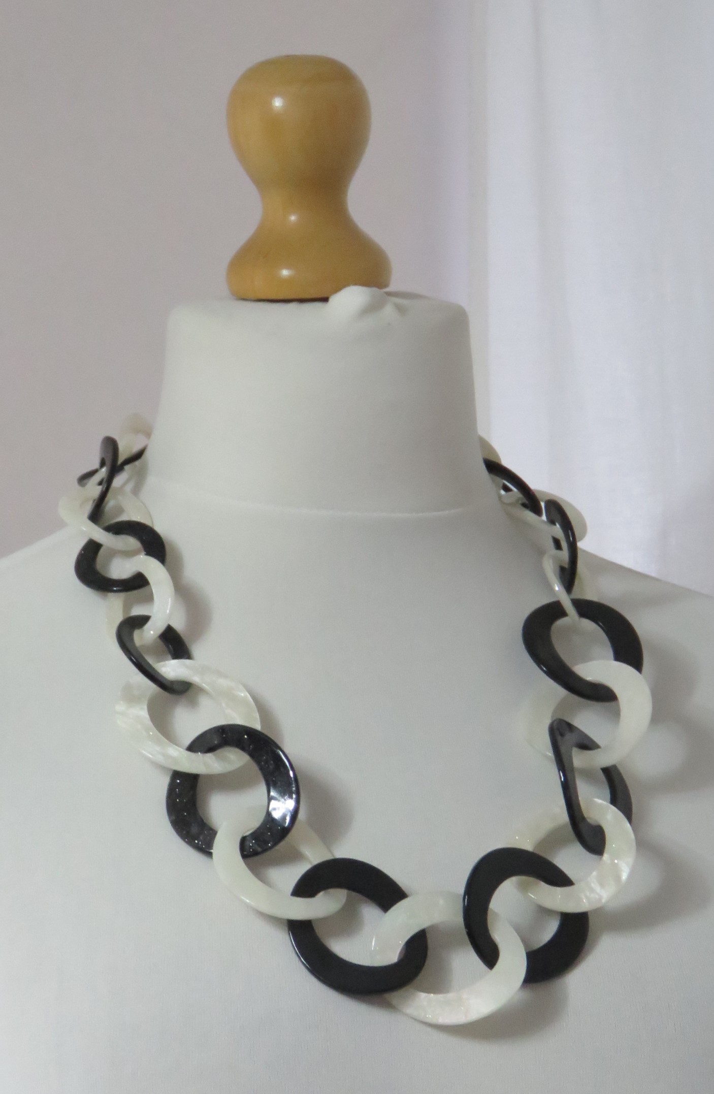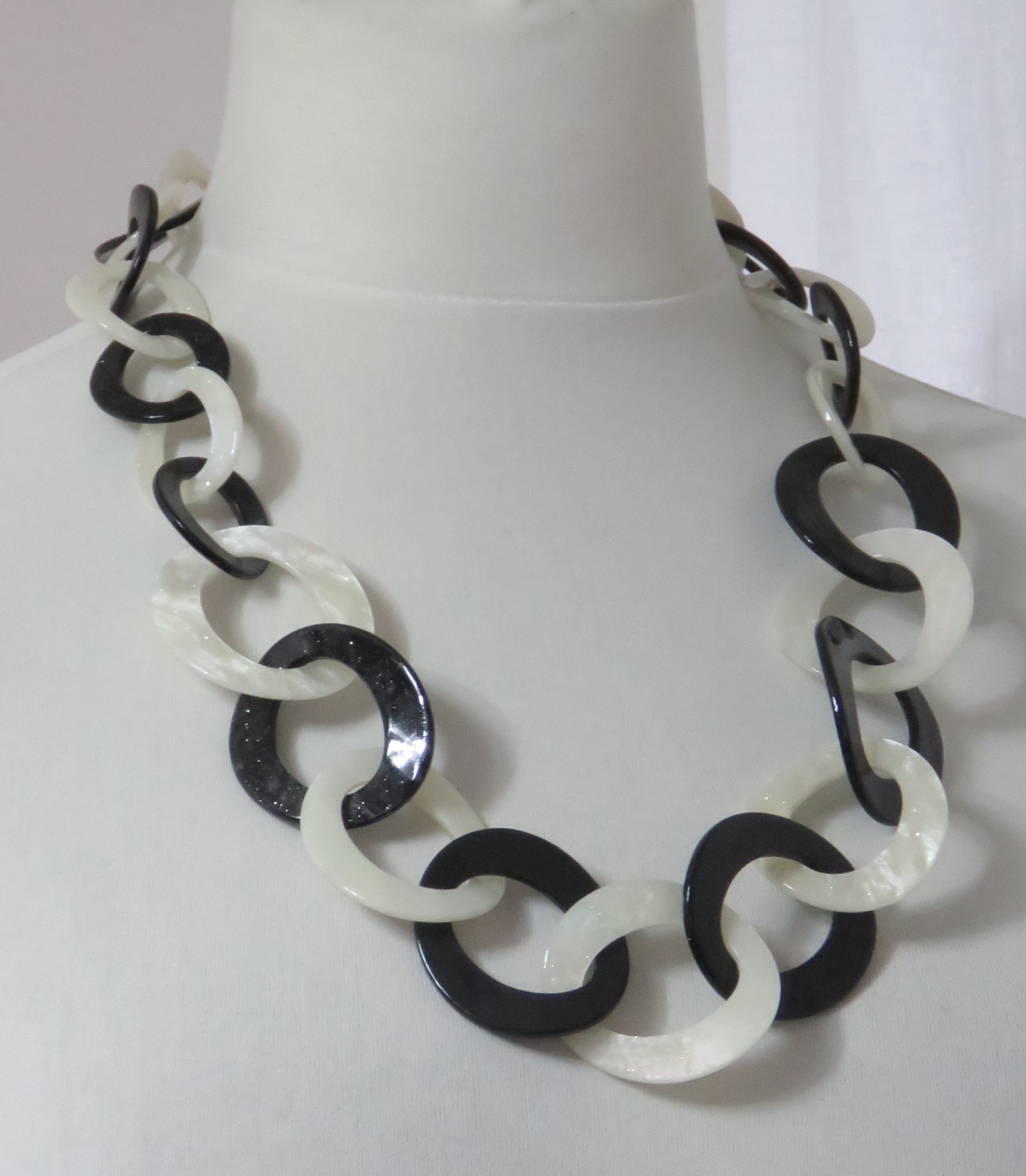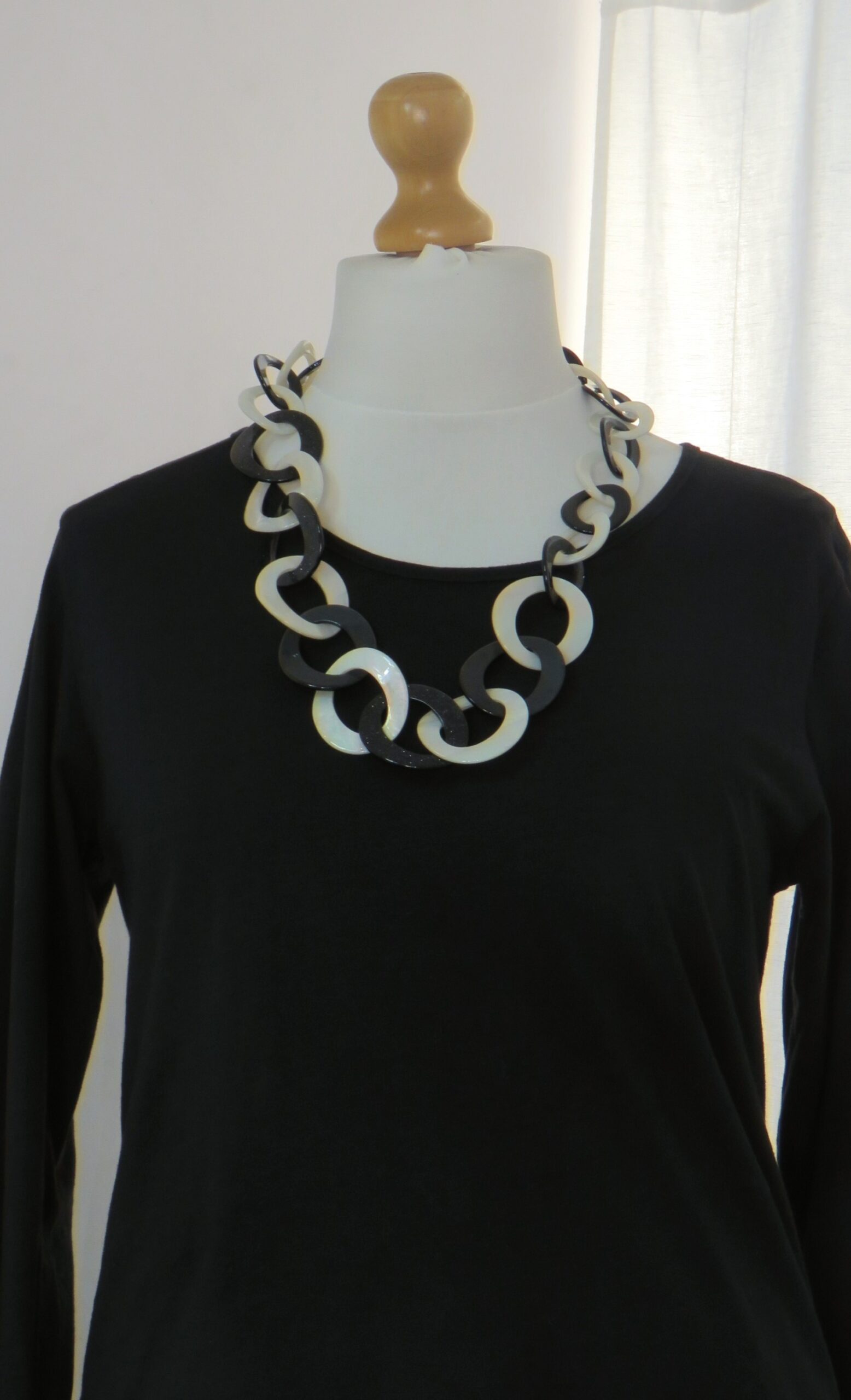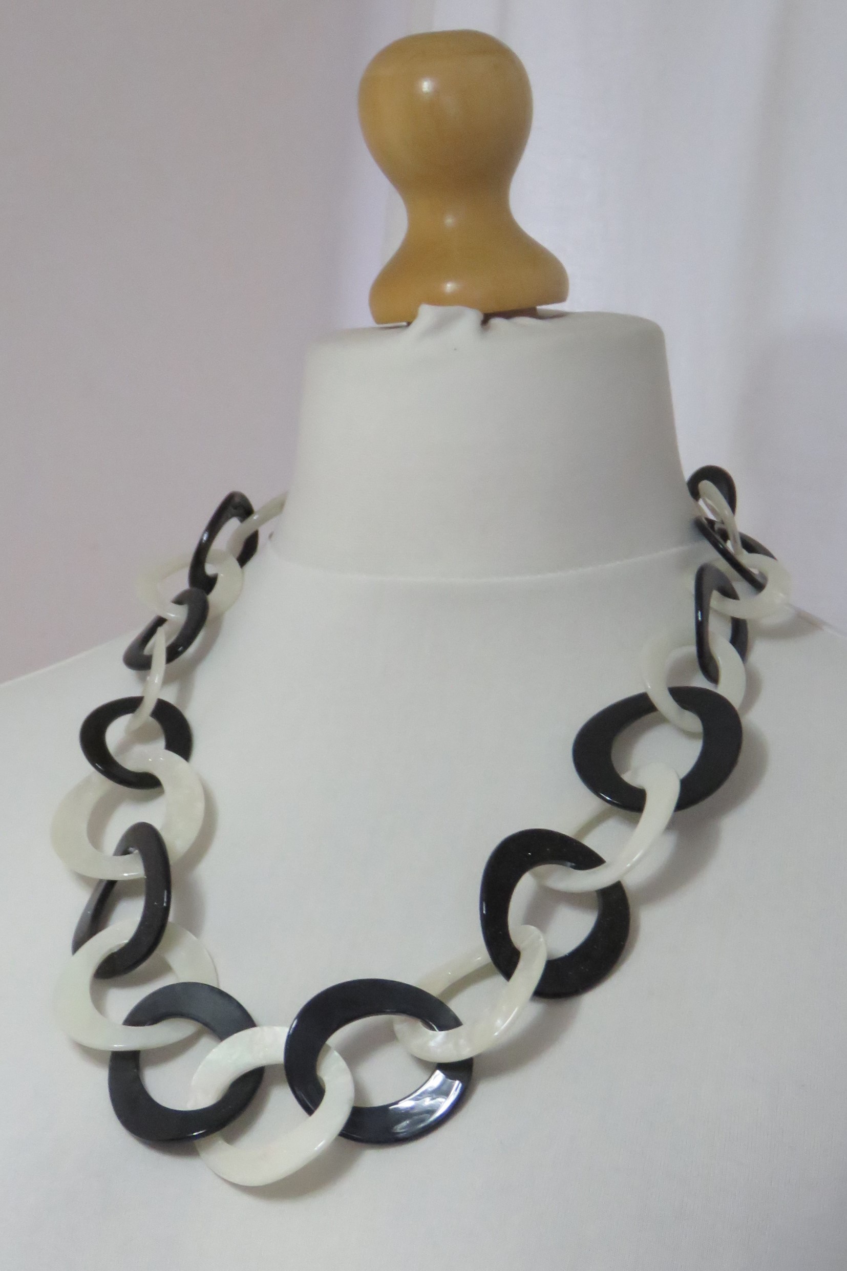 • Lagenlook, statement necklace, made of black and pearly-white resin links, which are plain on one face and have a subtle sparkle on the other