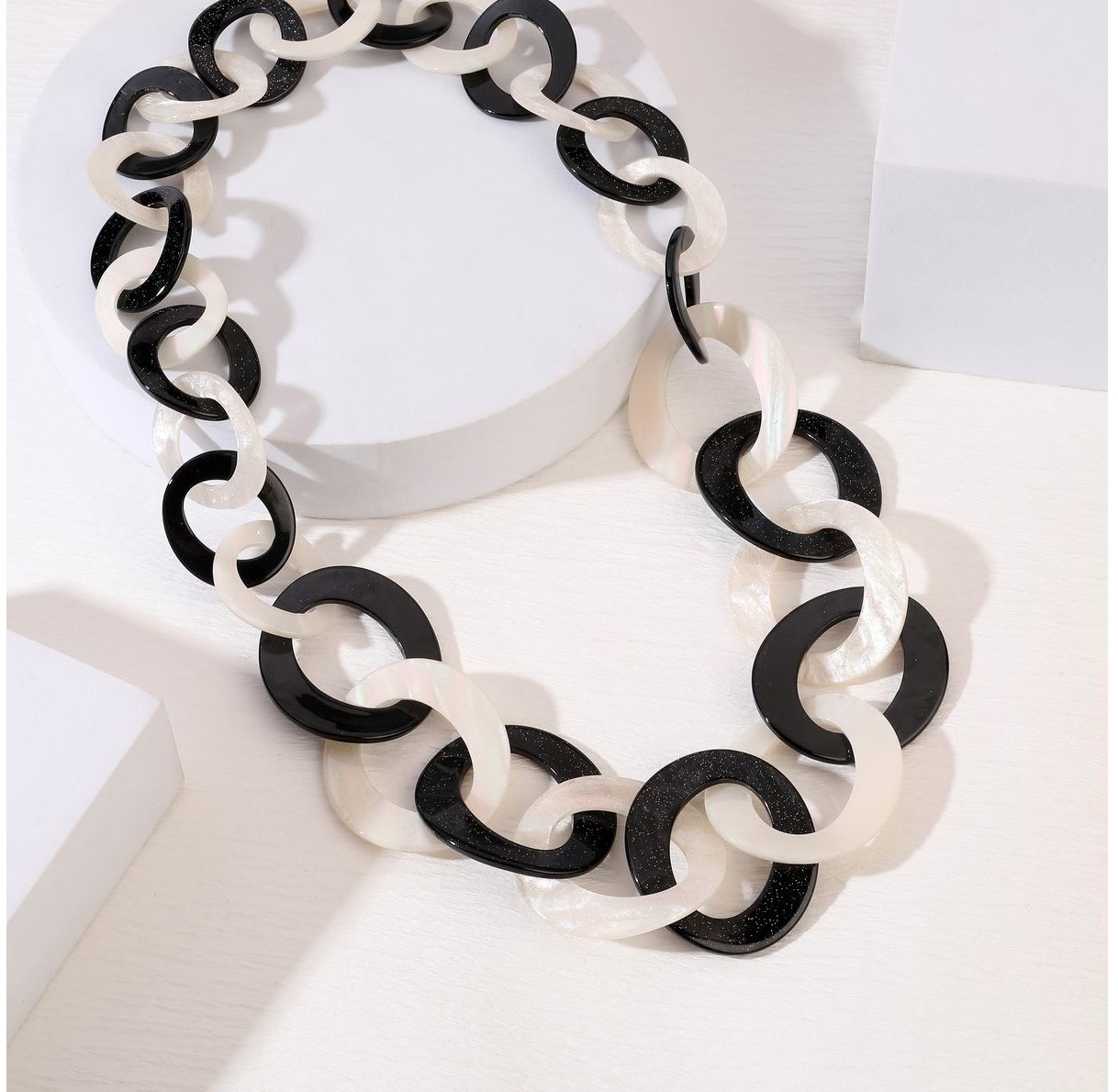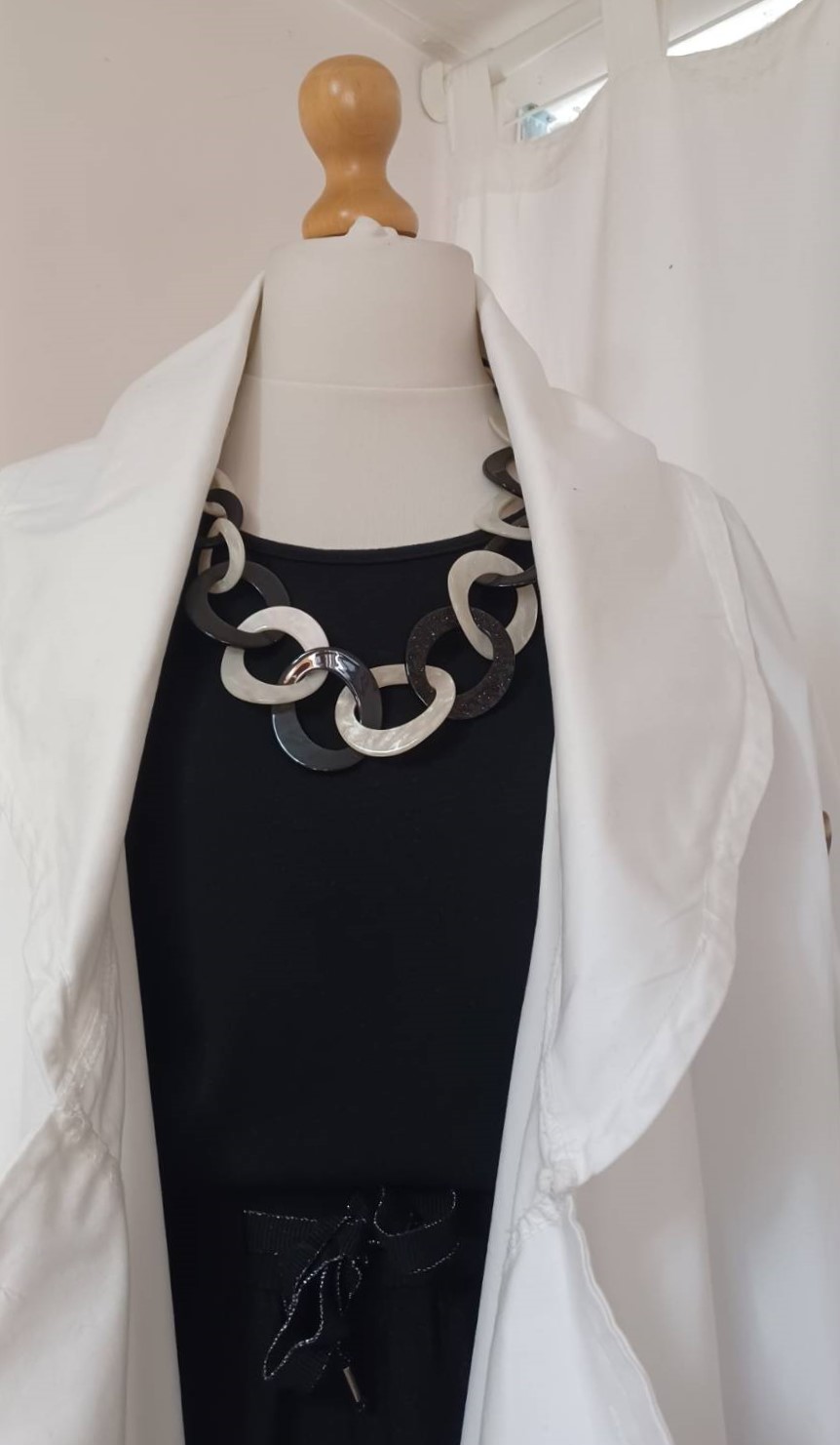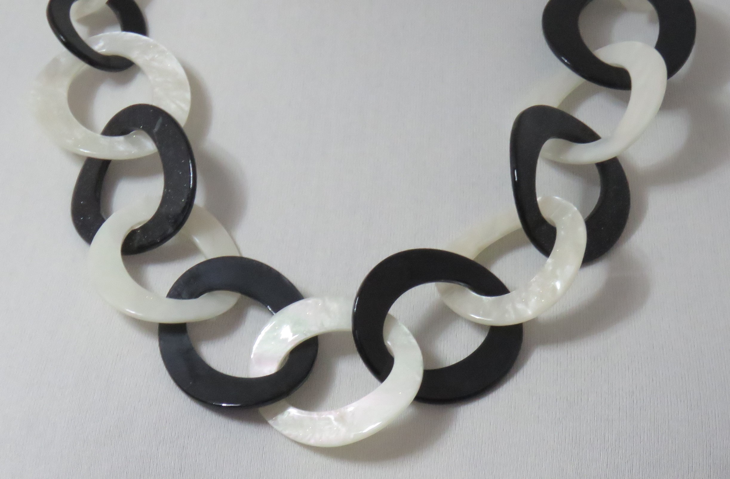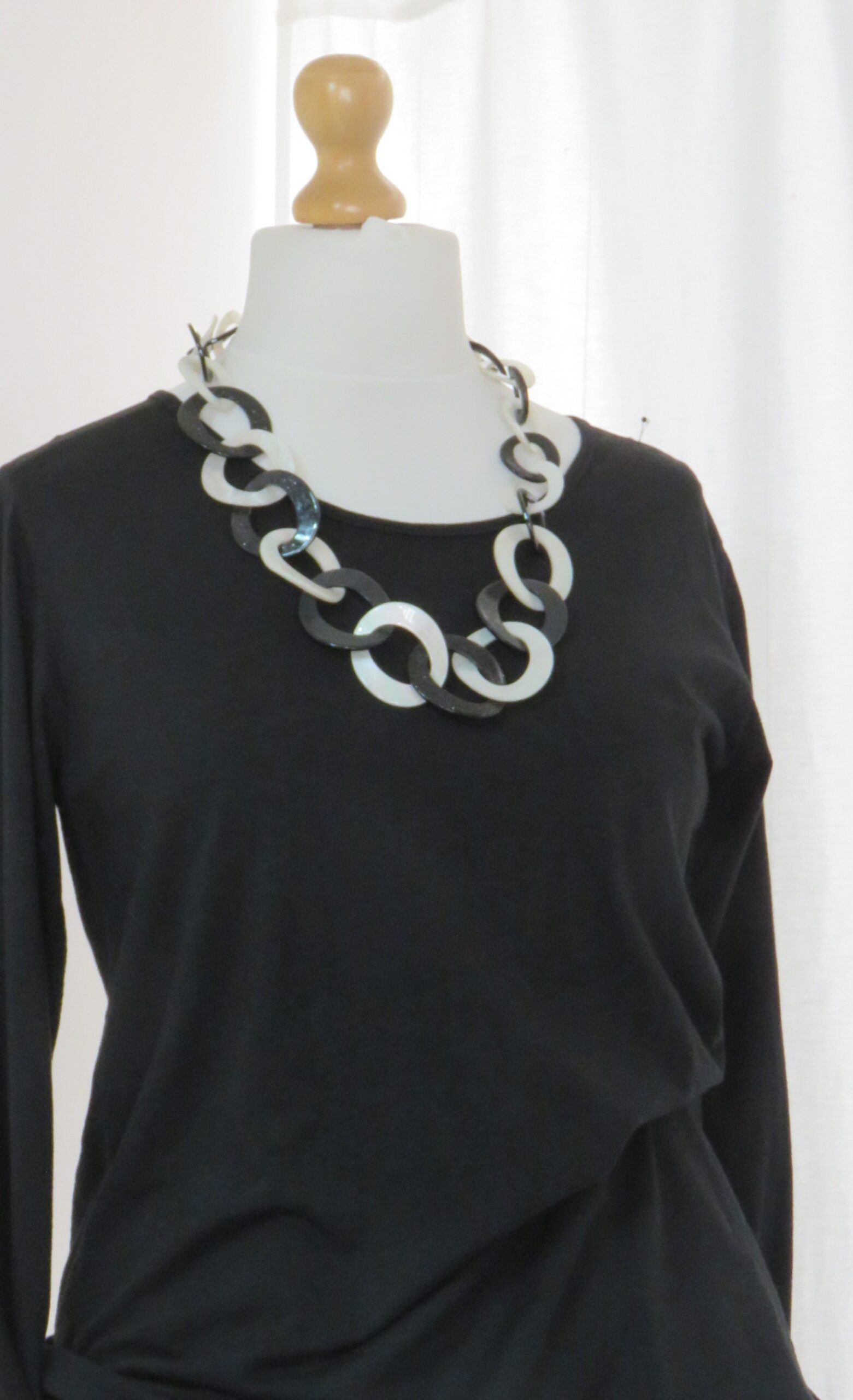 • Lagenlook, statement necklace, made of black and pearly-white resin links, which are plain on one face and have a subtle sparkle on the other