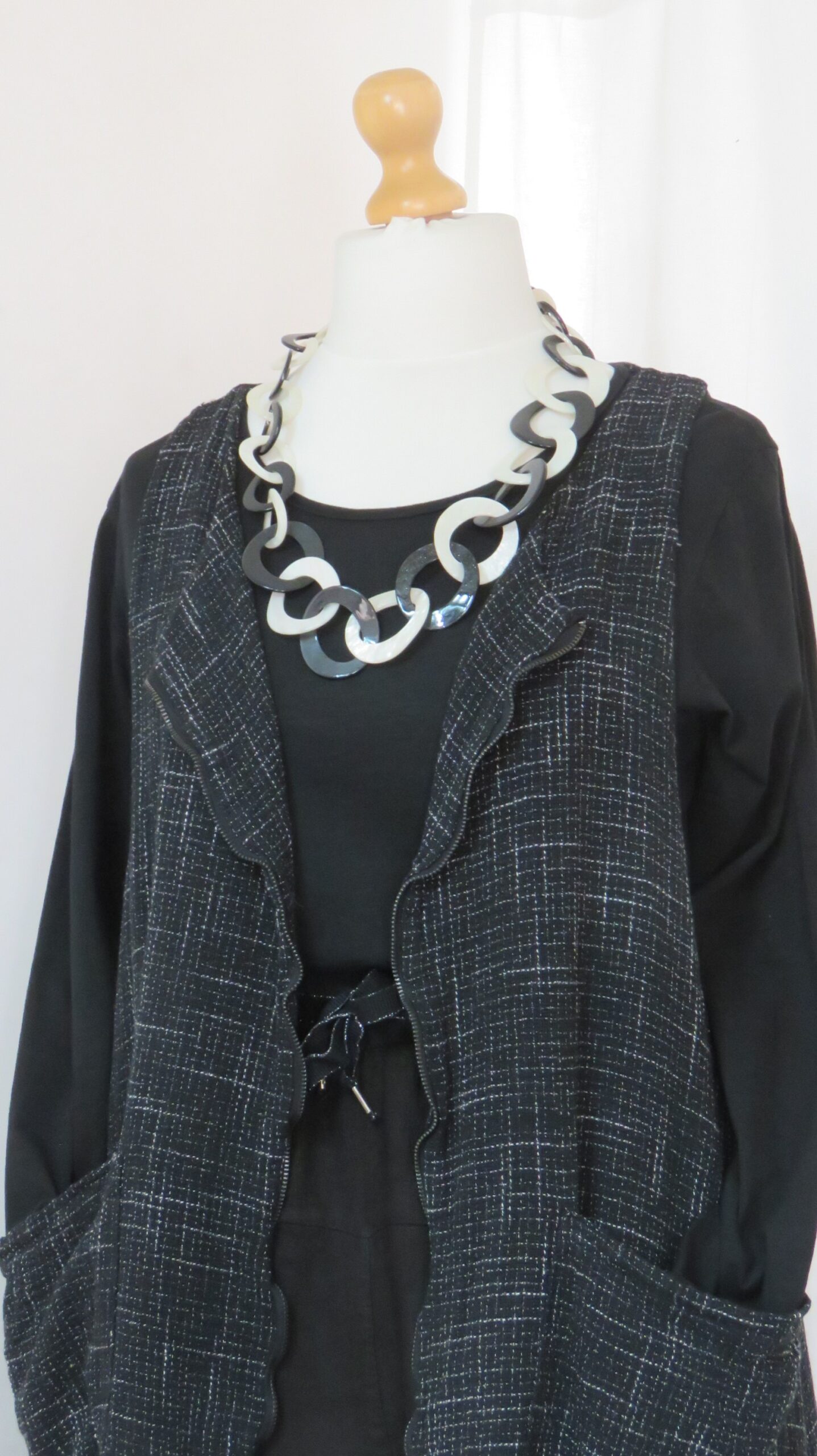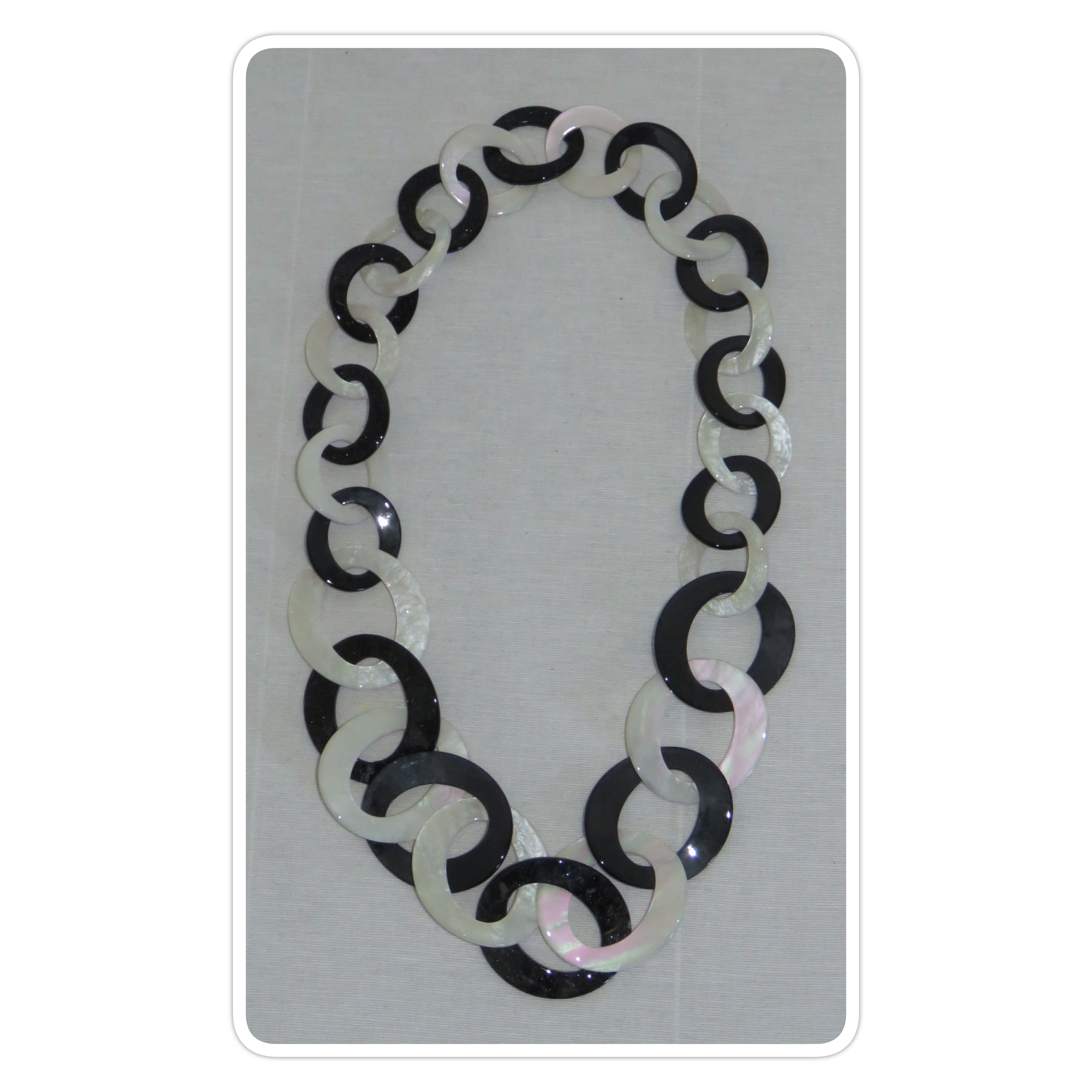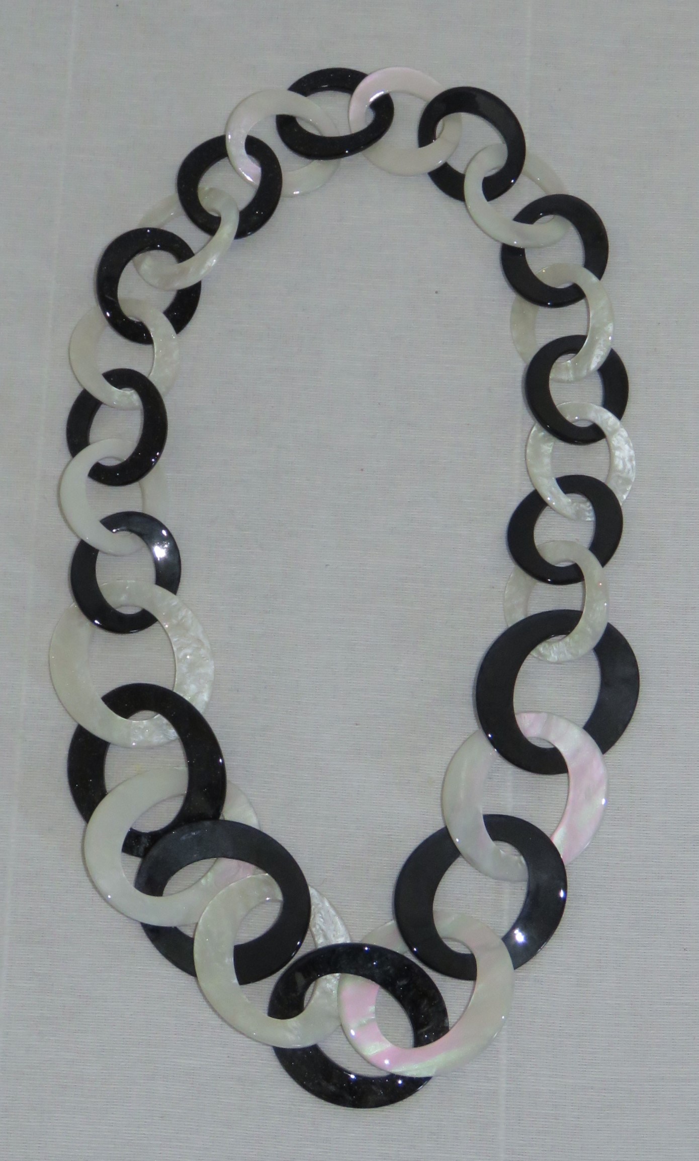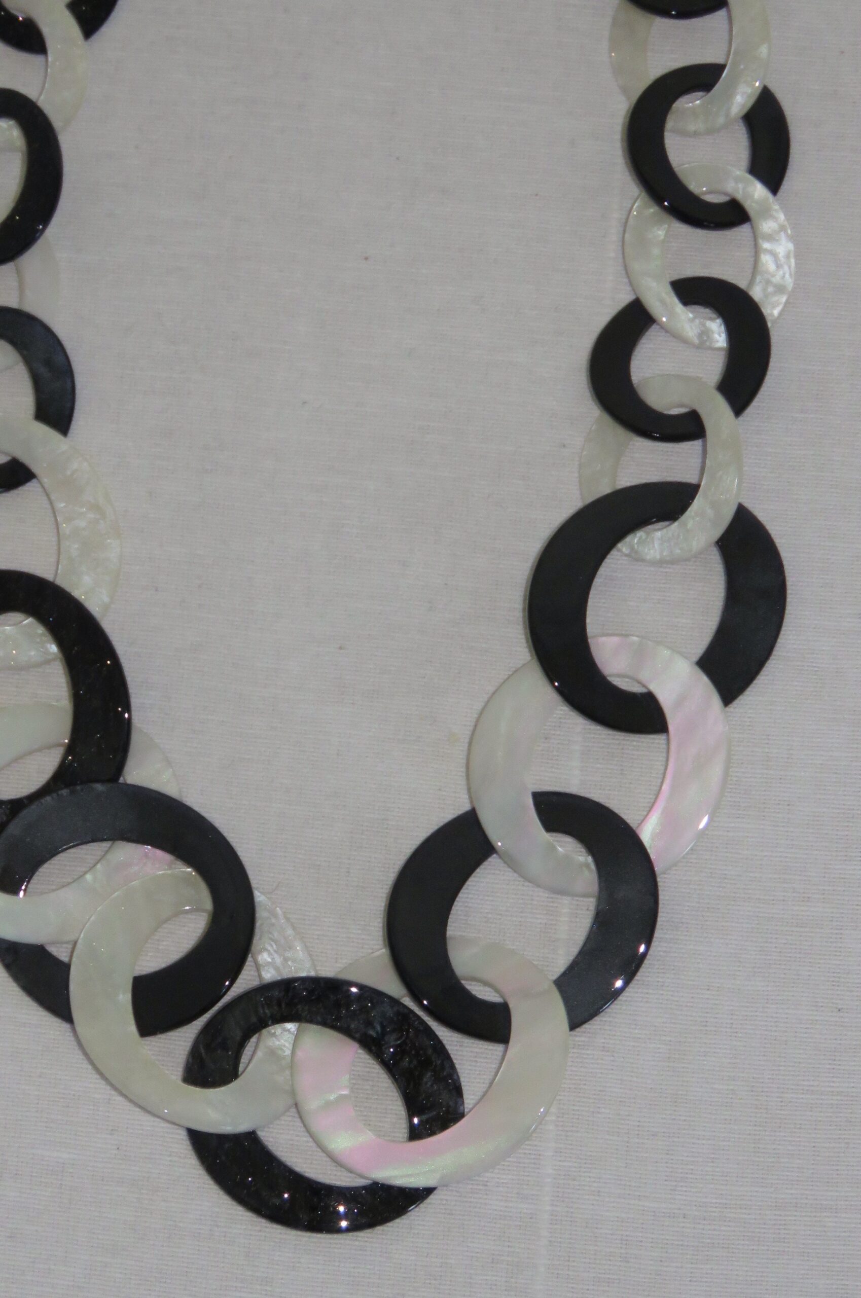 • Lagenlook, statement necklace, made of black and pearly-white resin links, which are plain on one face and have a subtle sparkle on the other