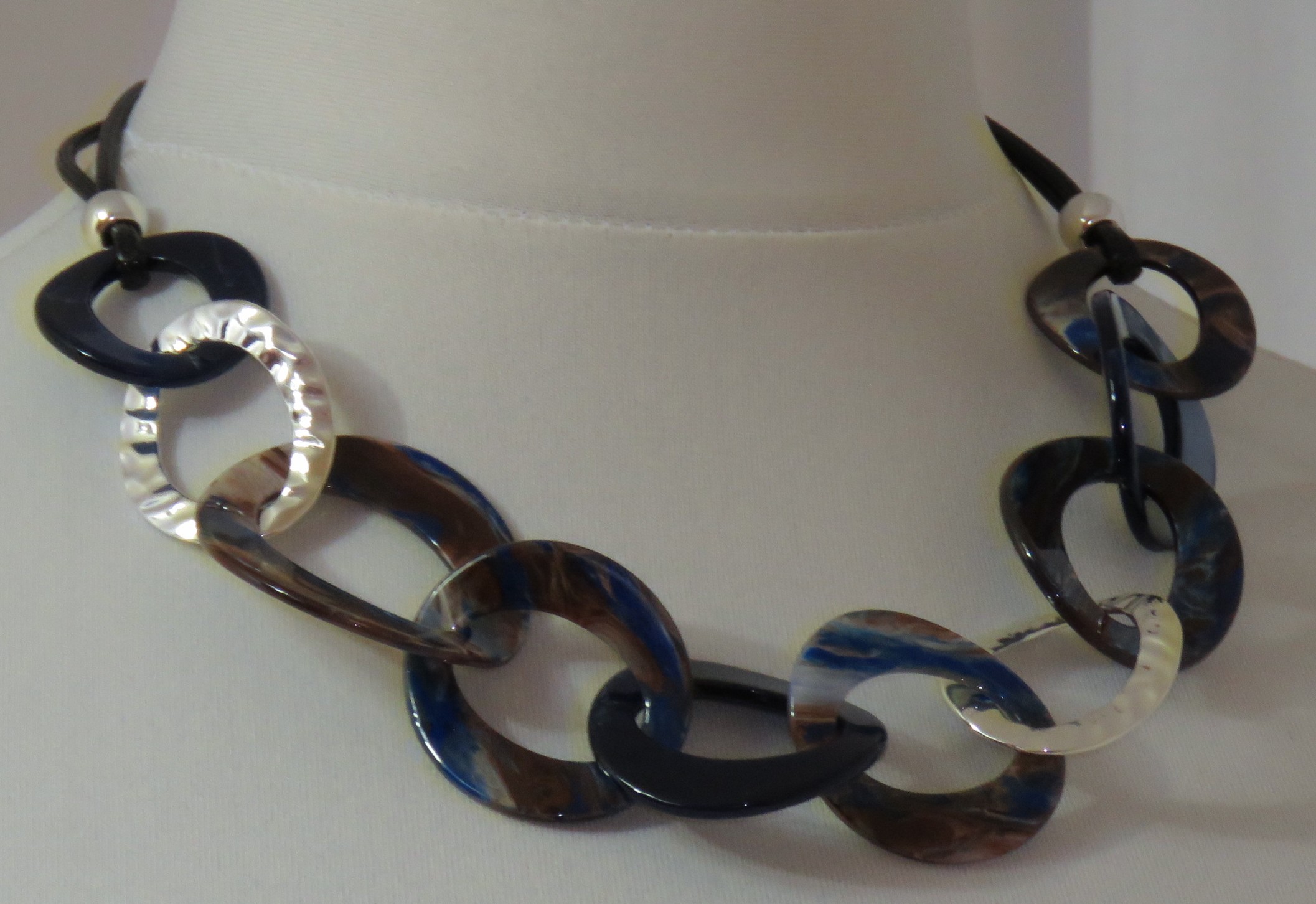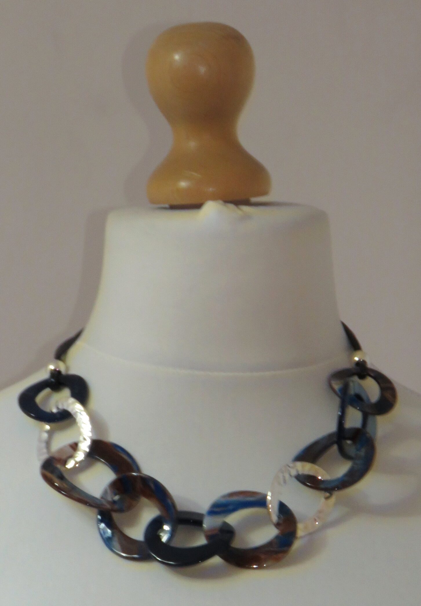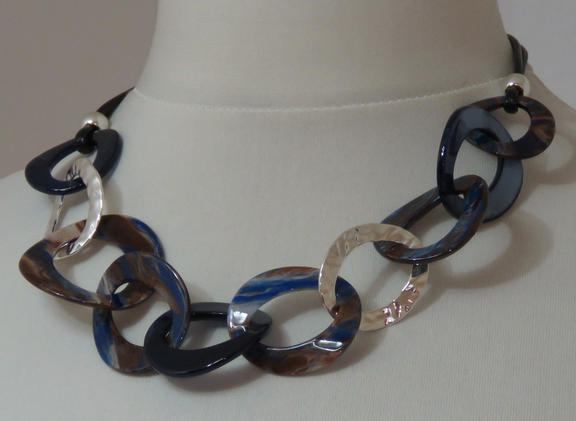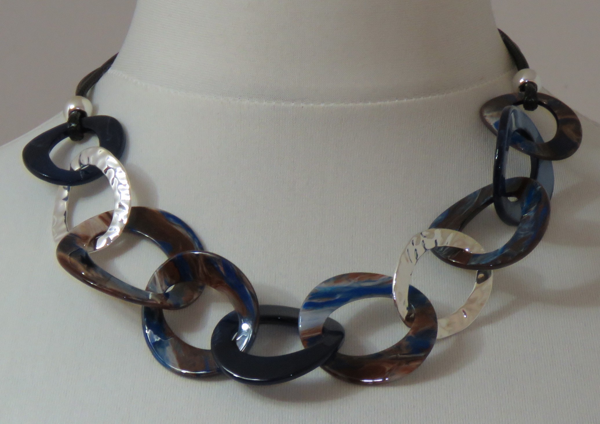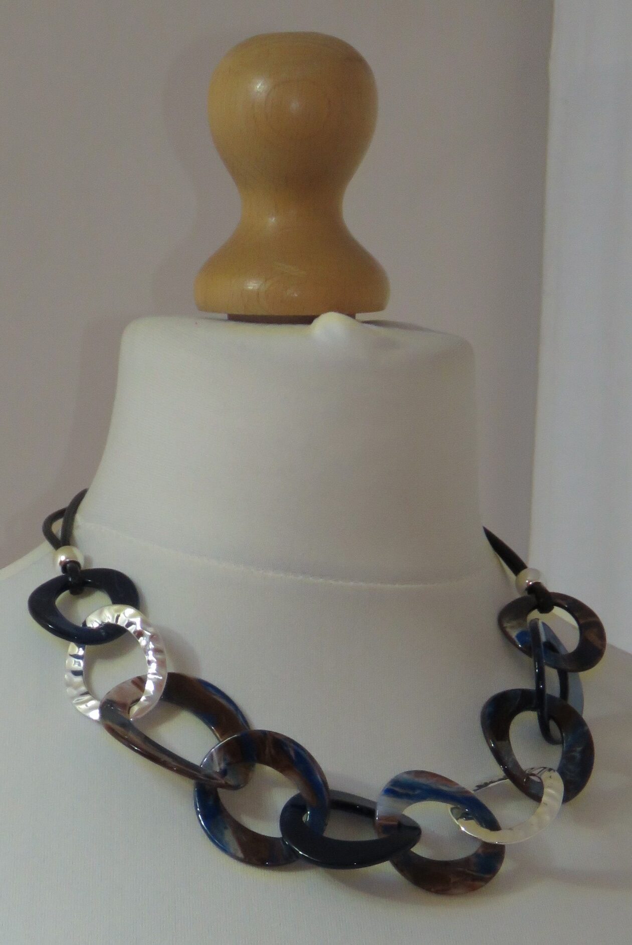 - Statement necklace, made of blue & brown marble-effect resin links and hammered, silver-coloured metal ones, suspended from a waxed cord