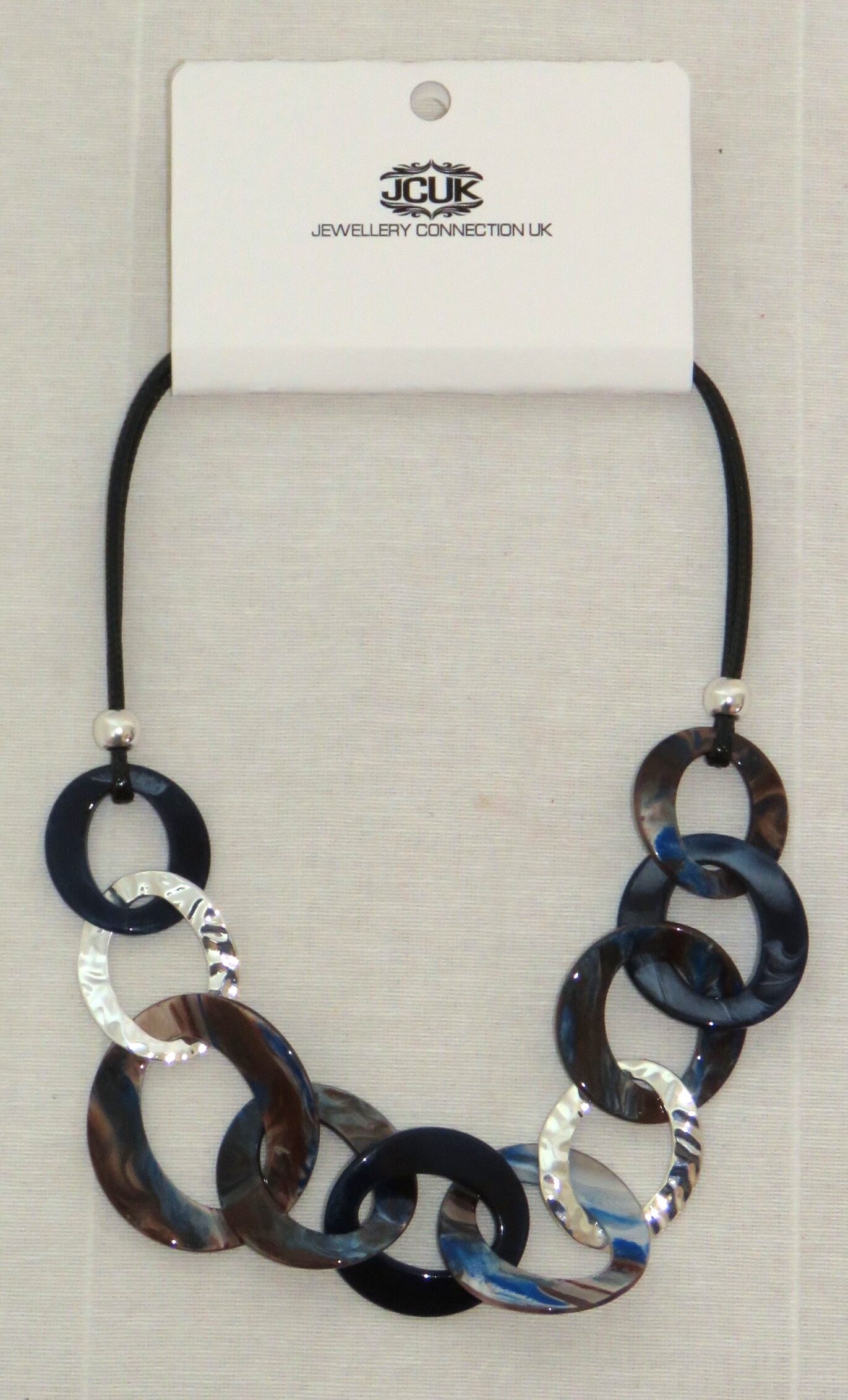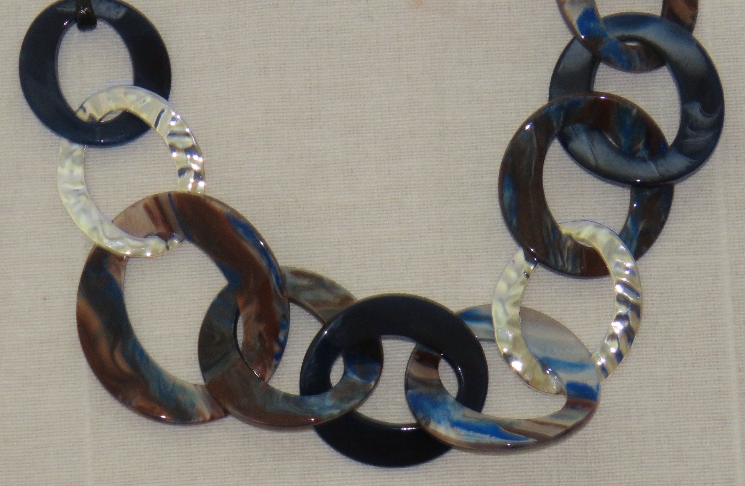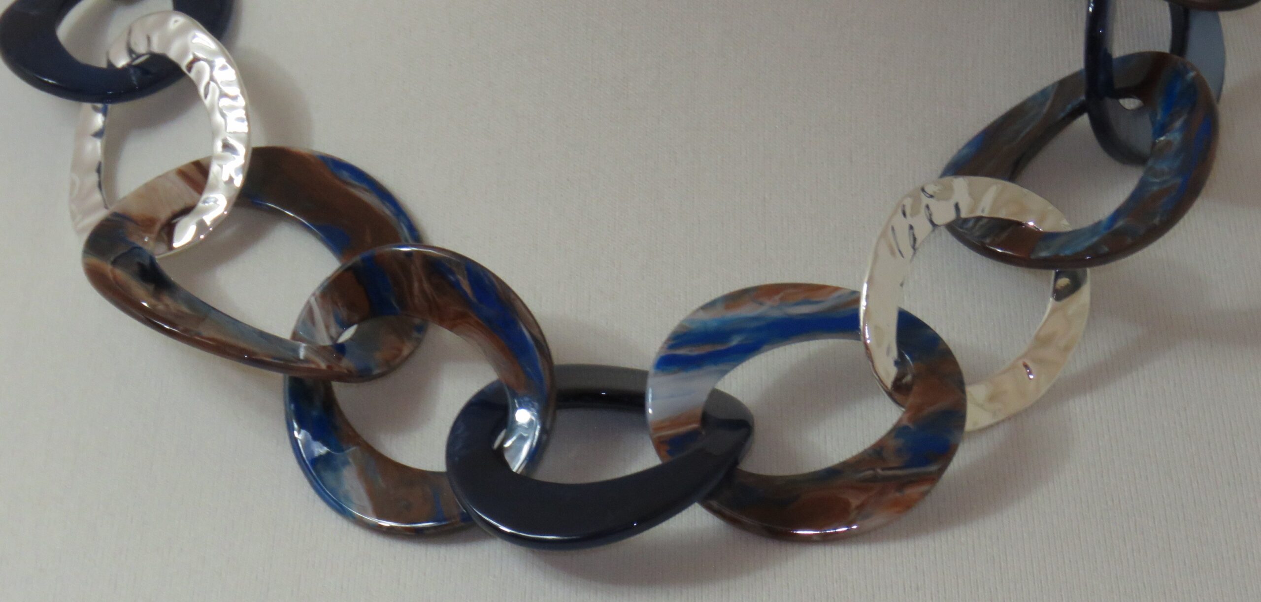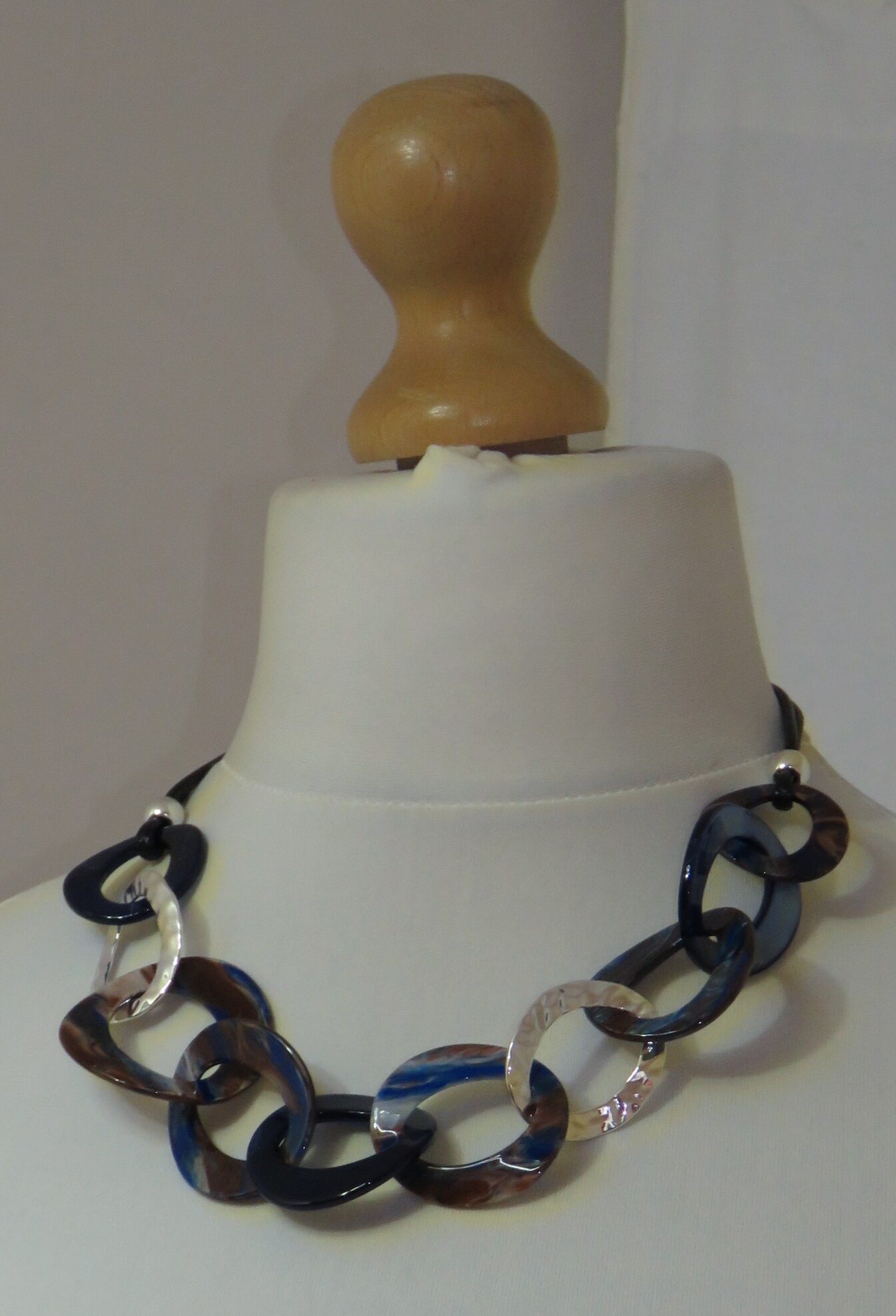 - Statement necklace, made of blue & brown marble-effect resin links and hammered, silver-coloured metal ones, suspended from a waxed cord