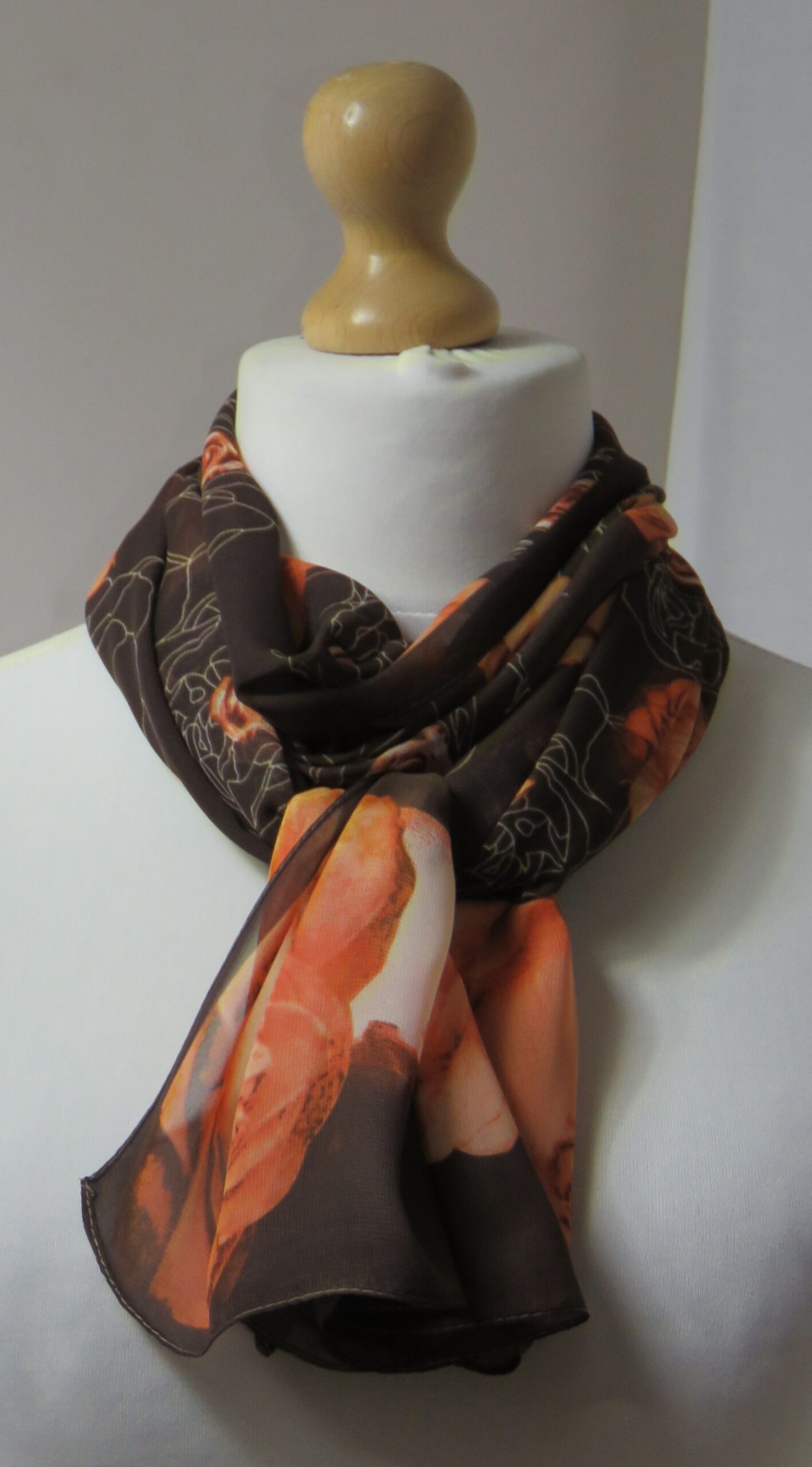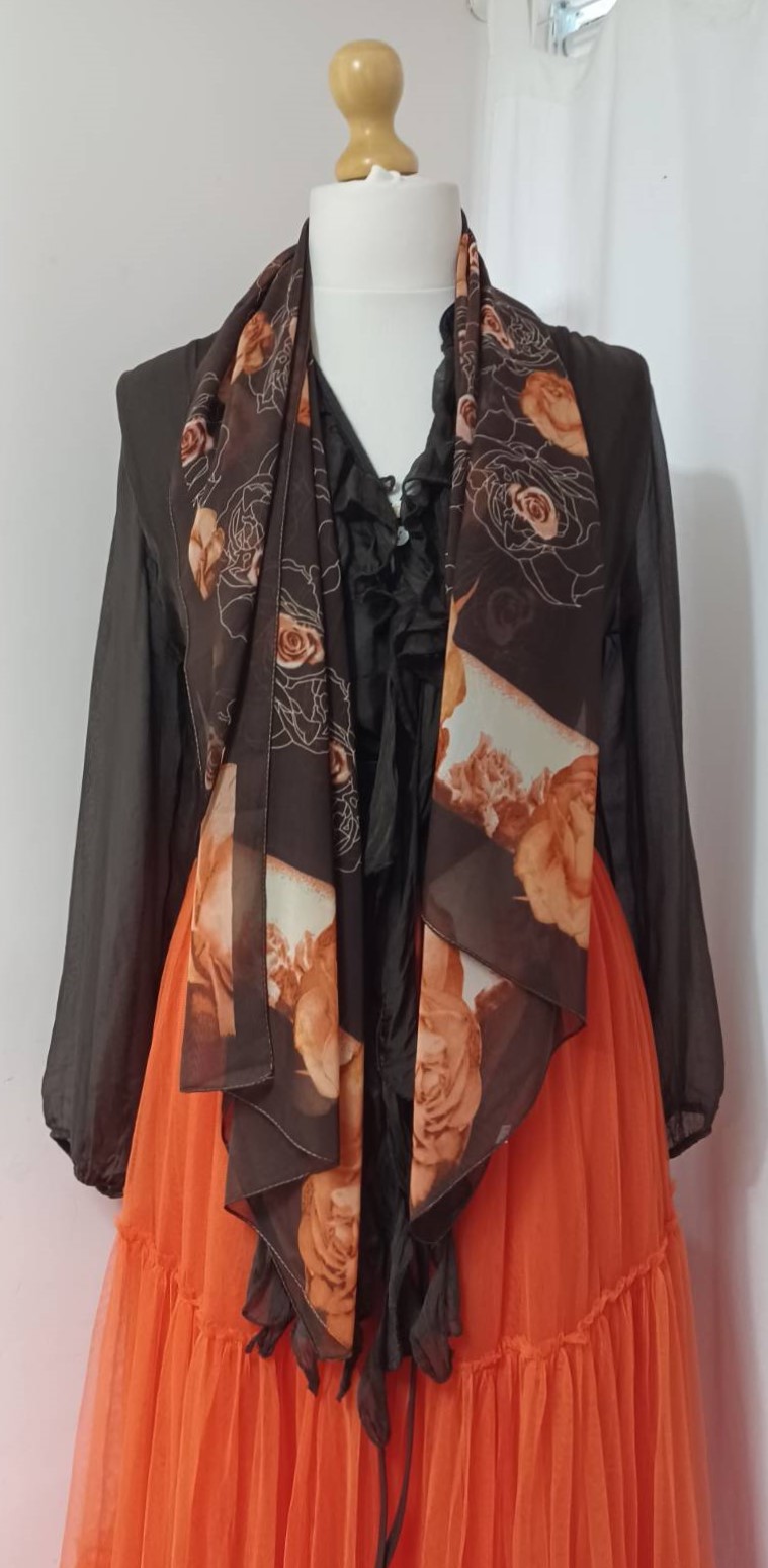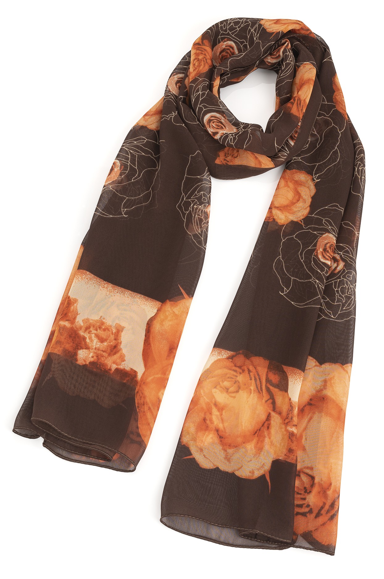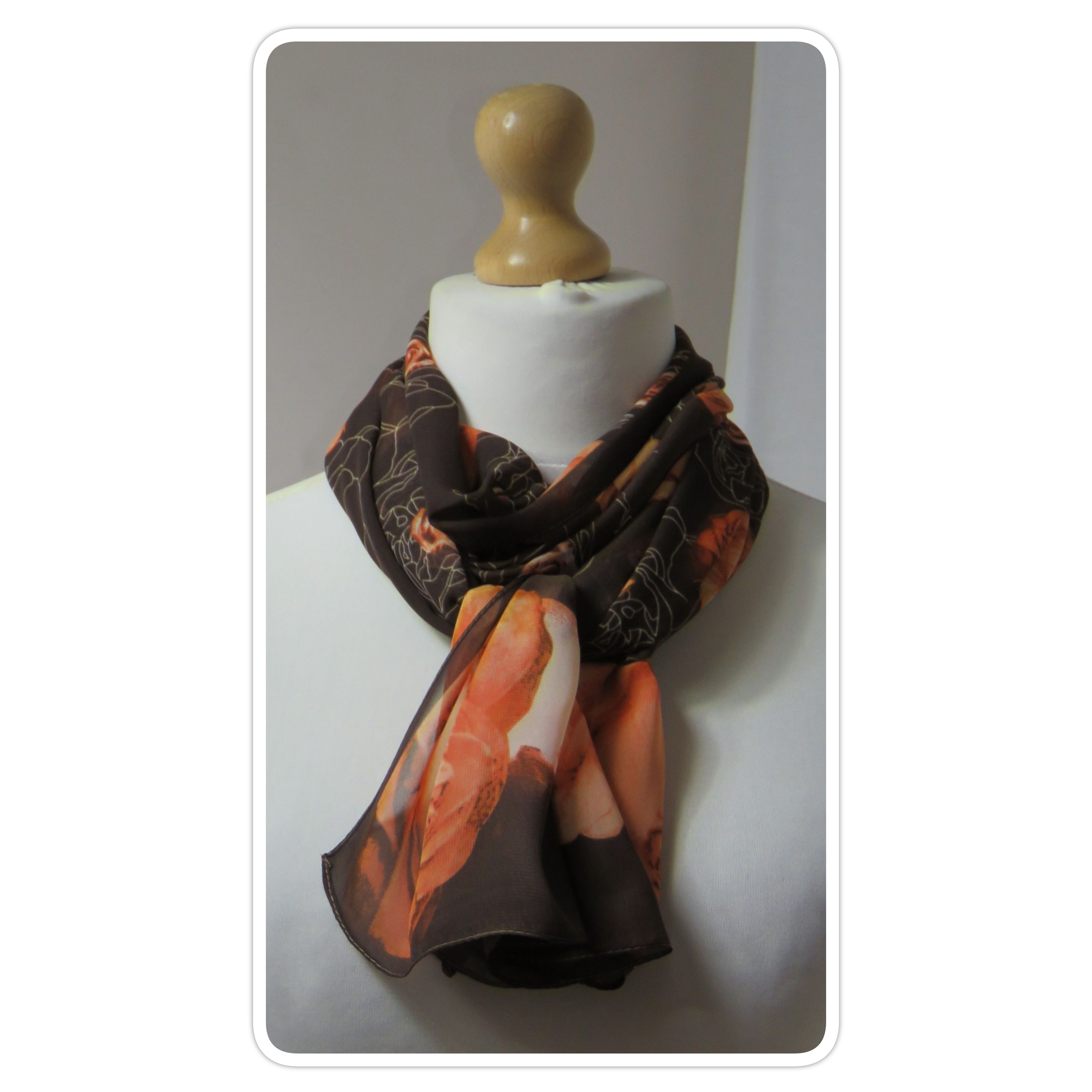 Brown & orange, floral roses, chiffon scarf