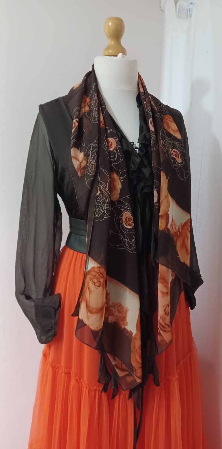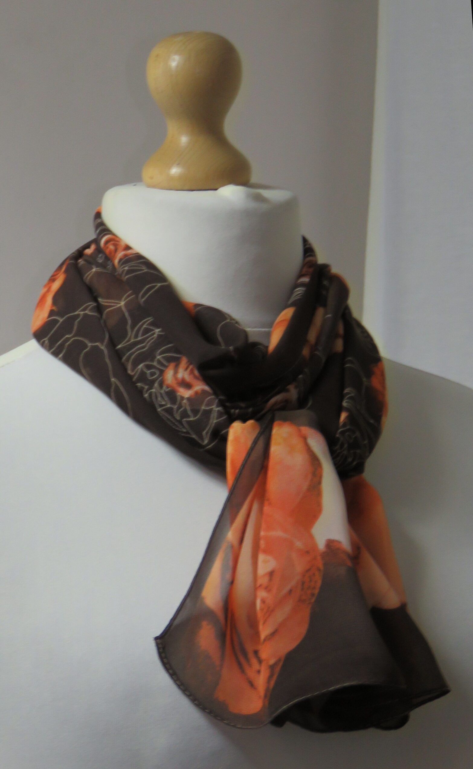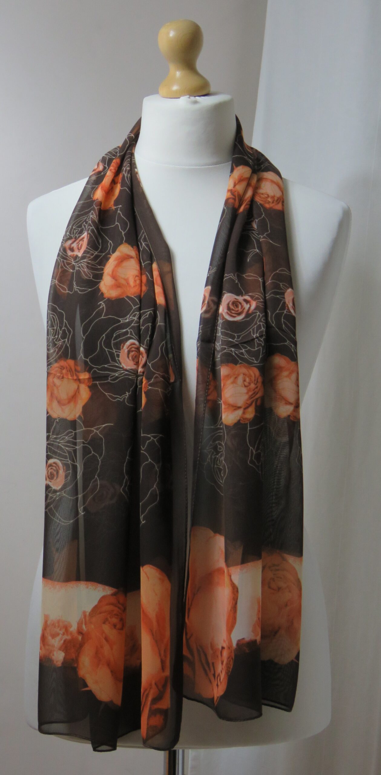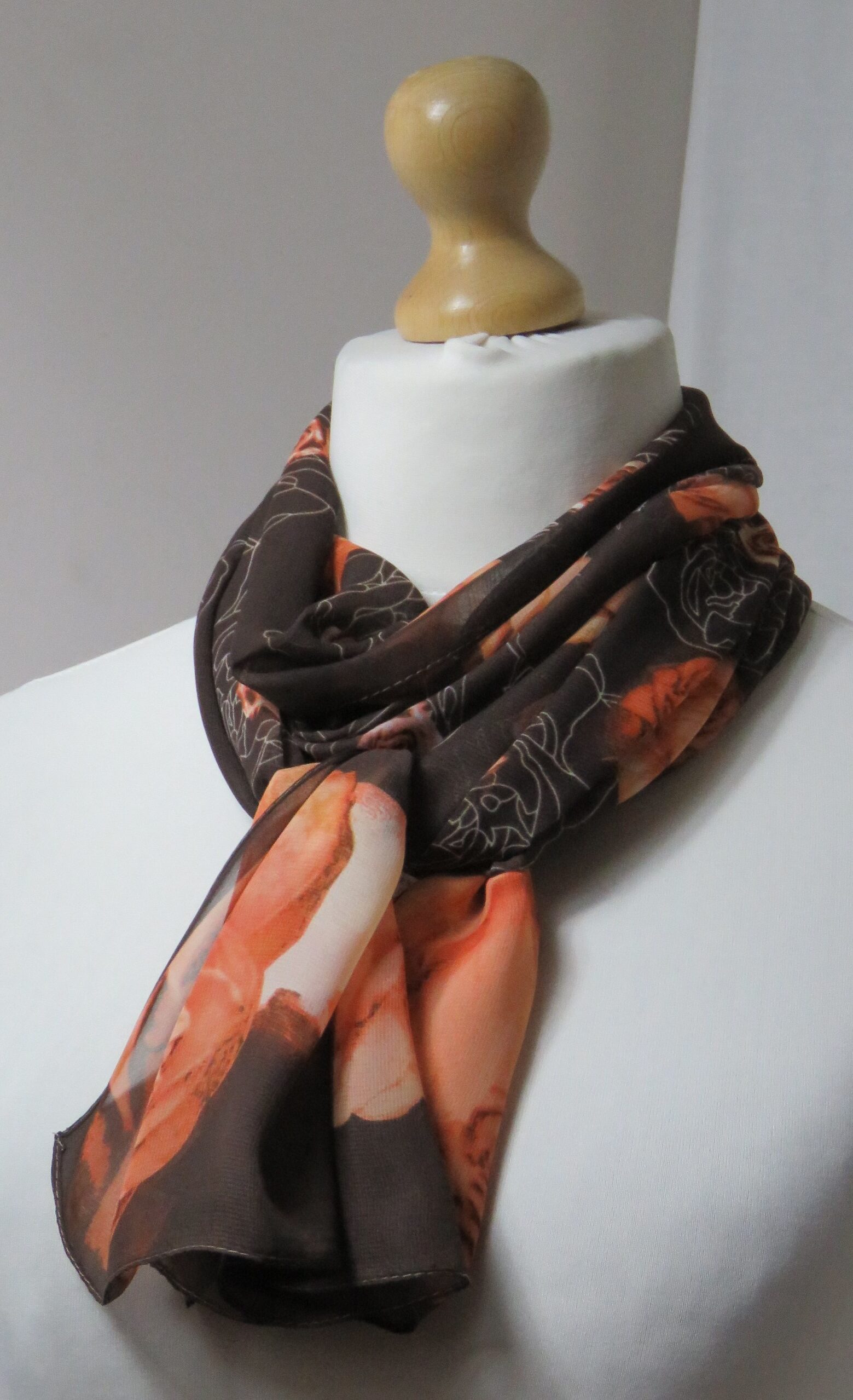 Brown & orange, floral roses, chiffon scarf