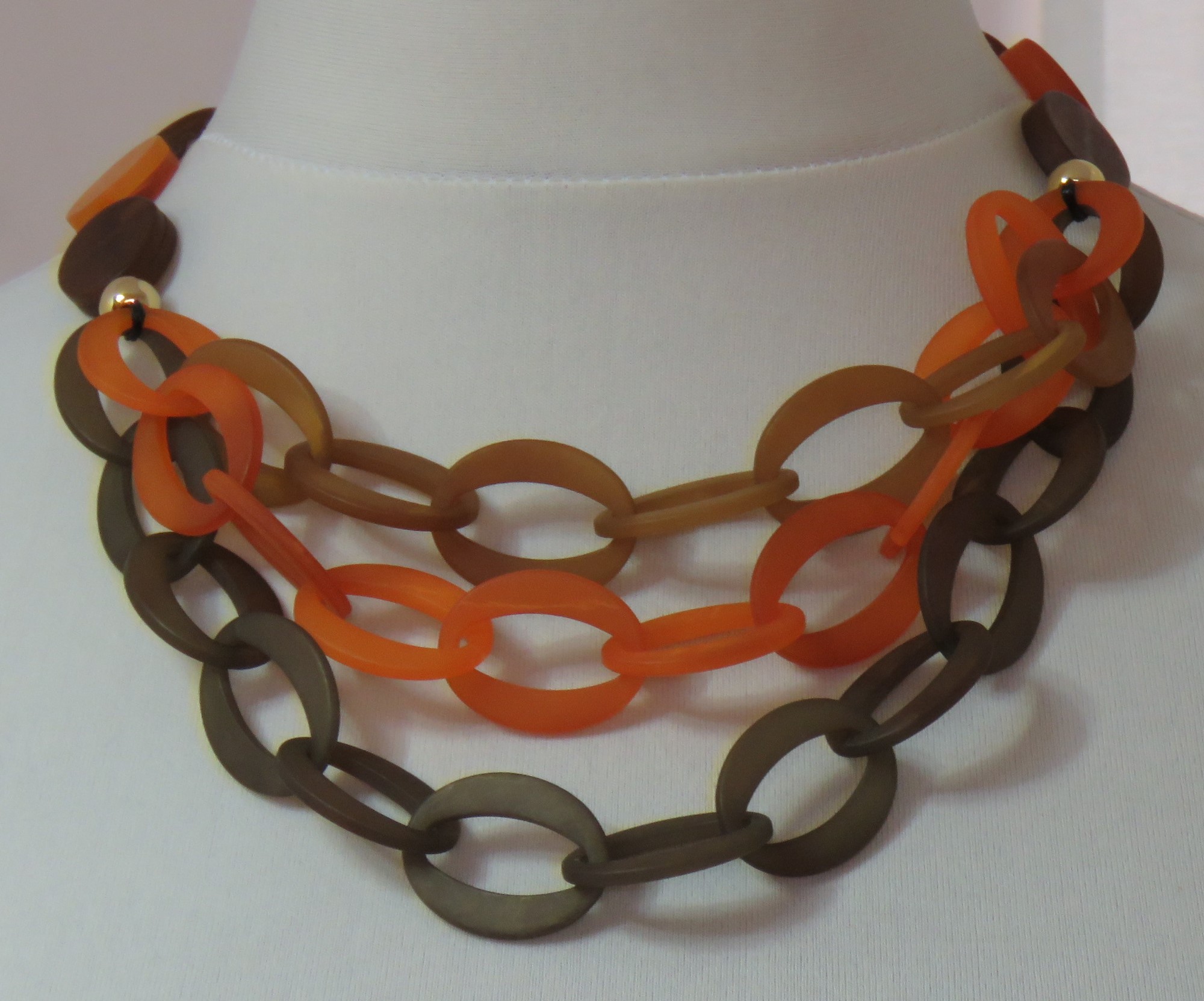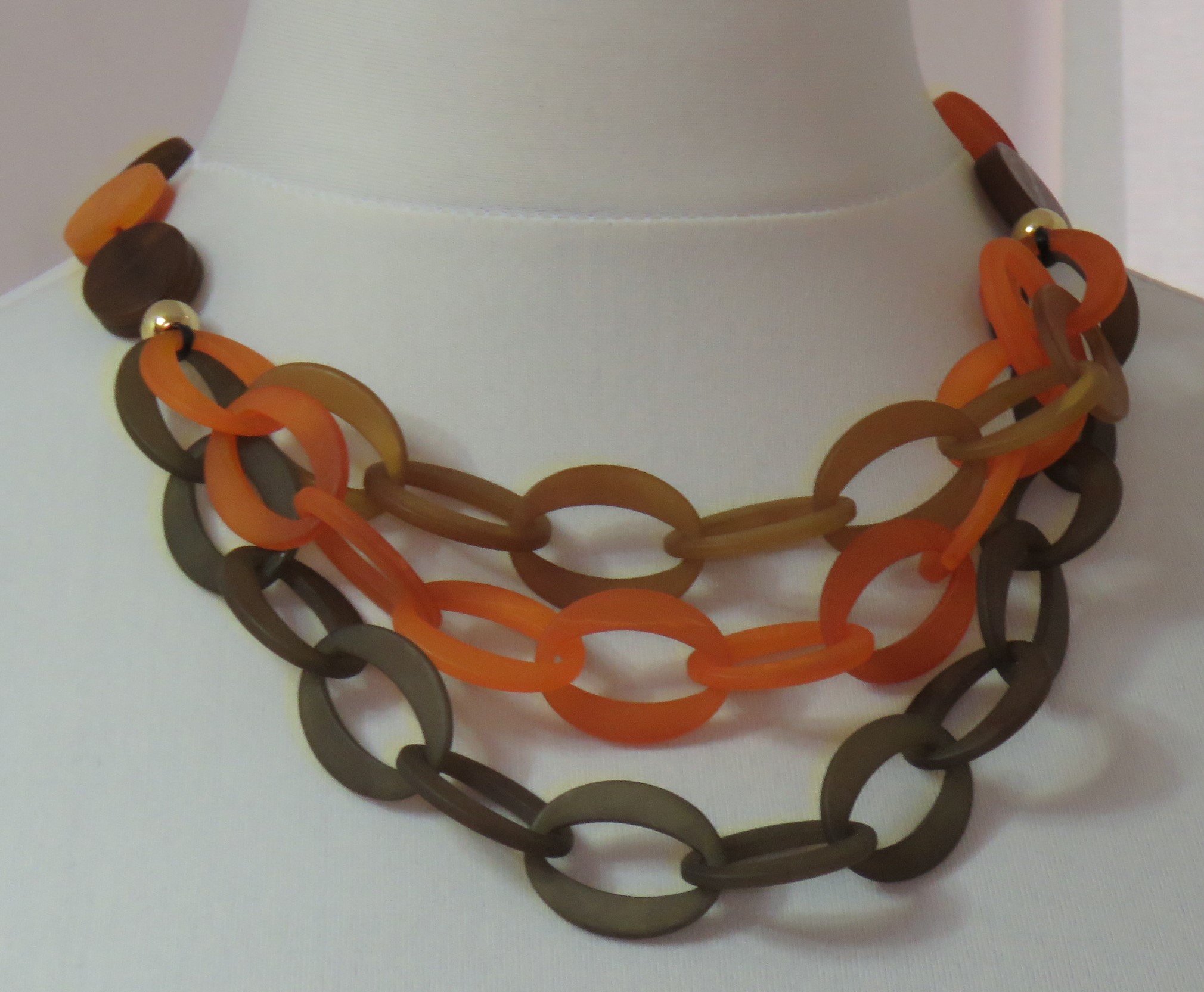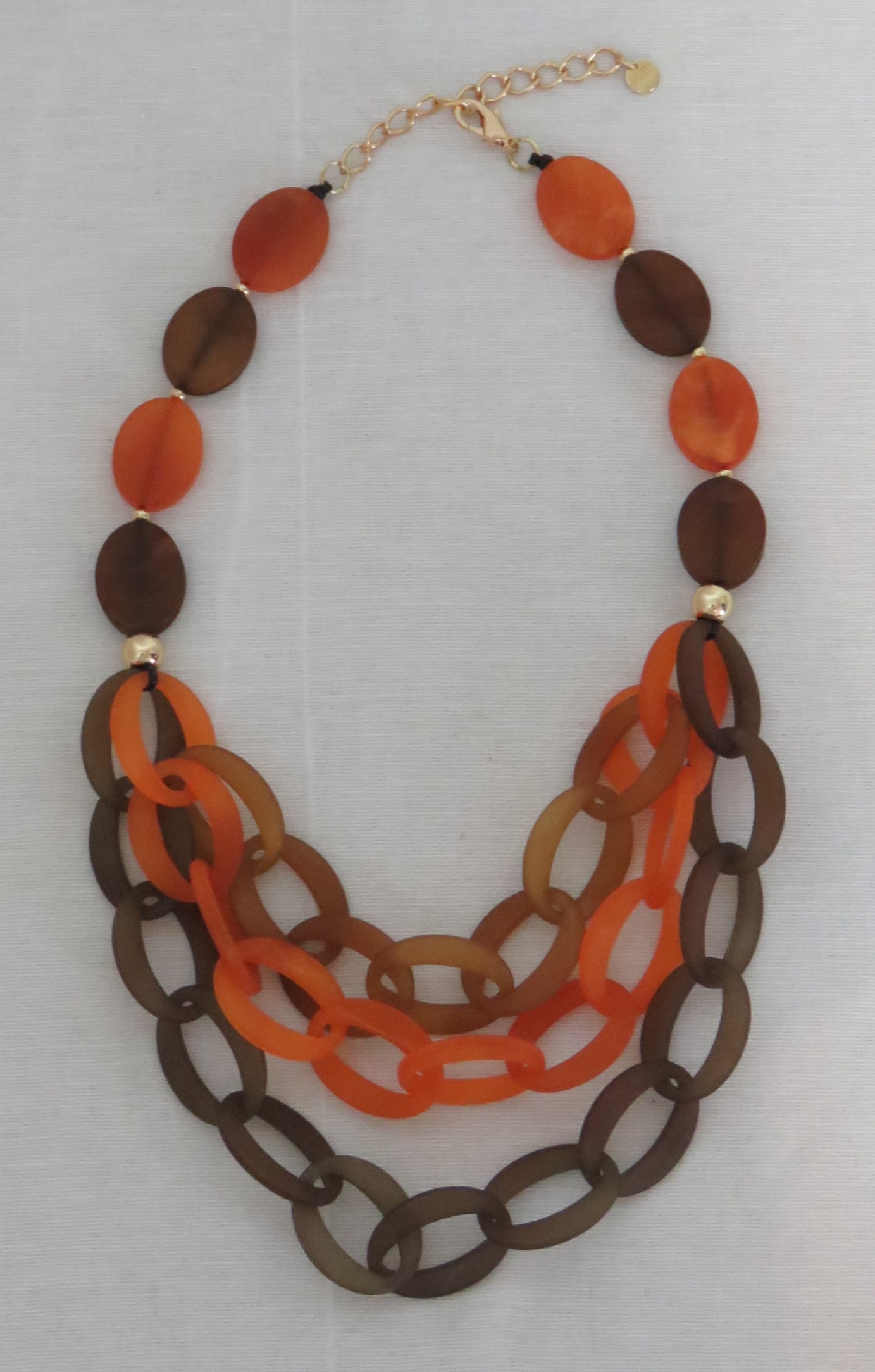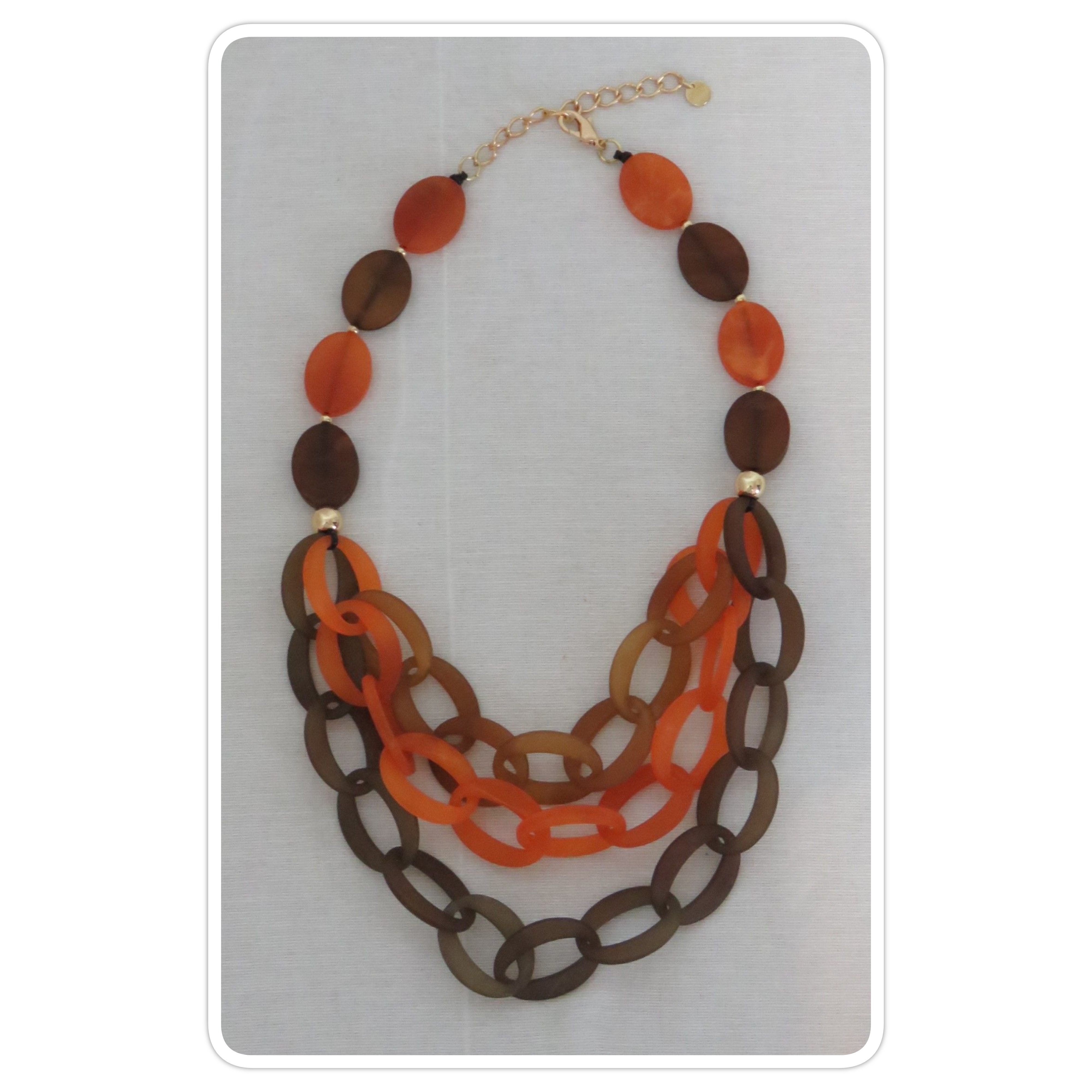 - Lagenlook, statement necklace, made of flat, orange & brown, frosted resin beads and a triple strand of brown, toffee & orange, frosted resin links