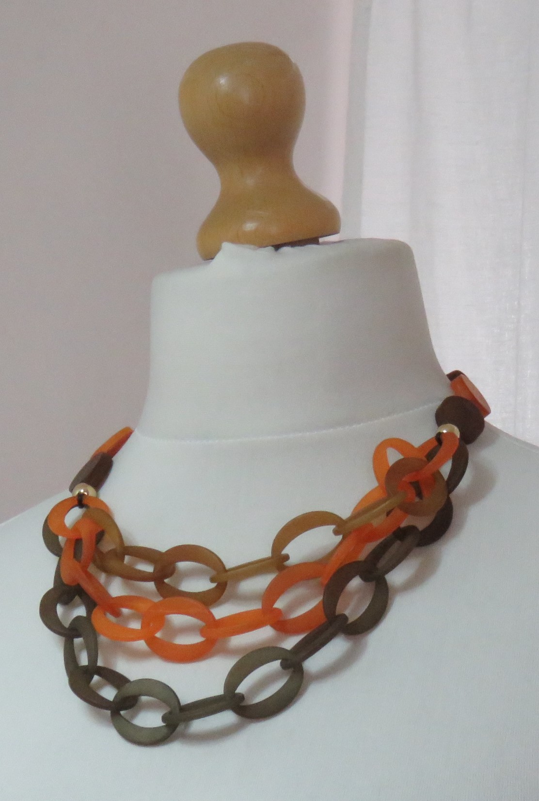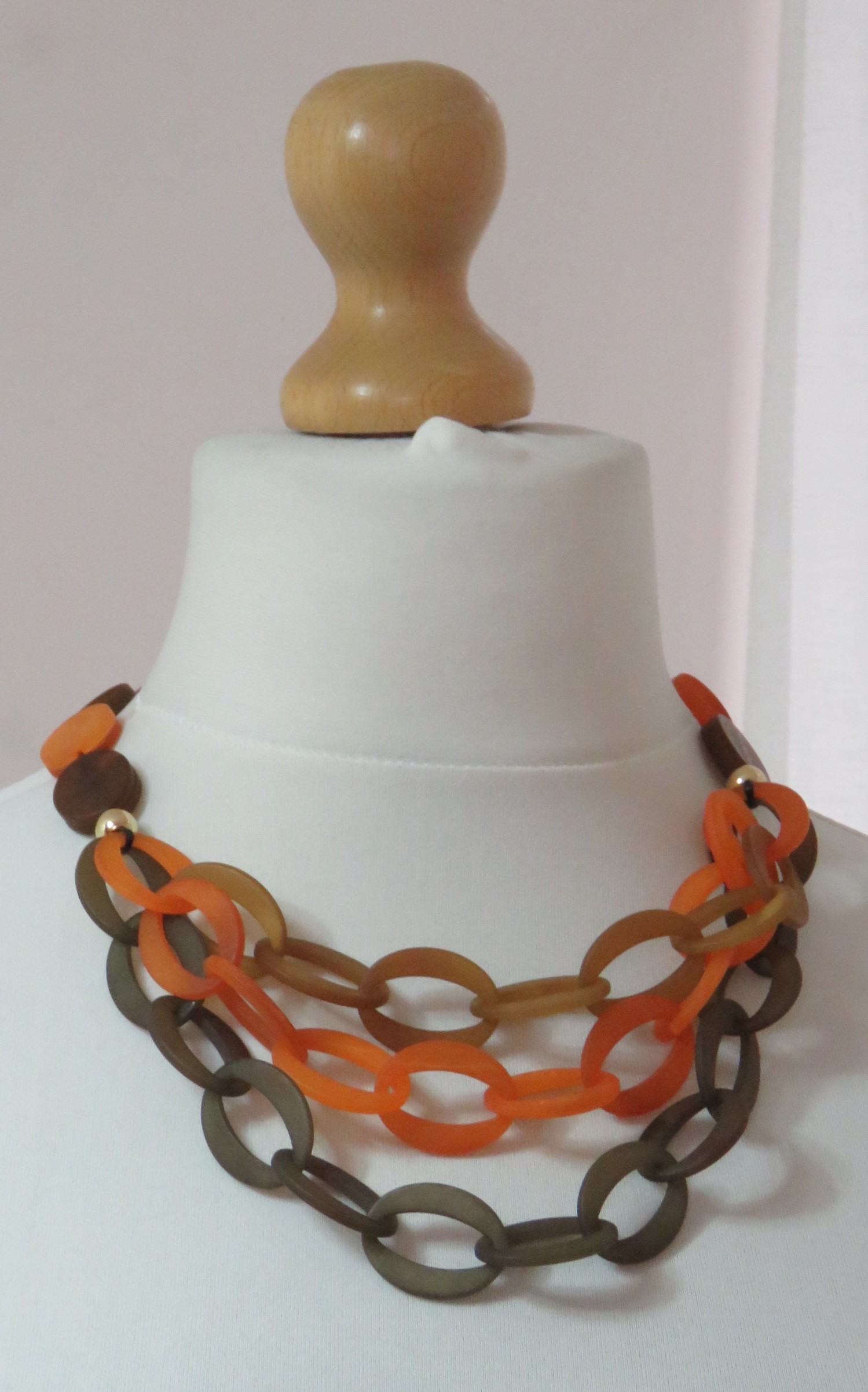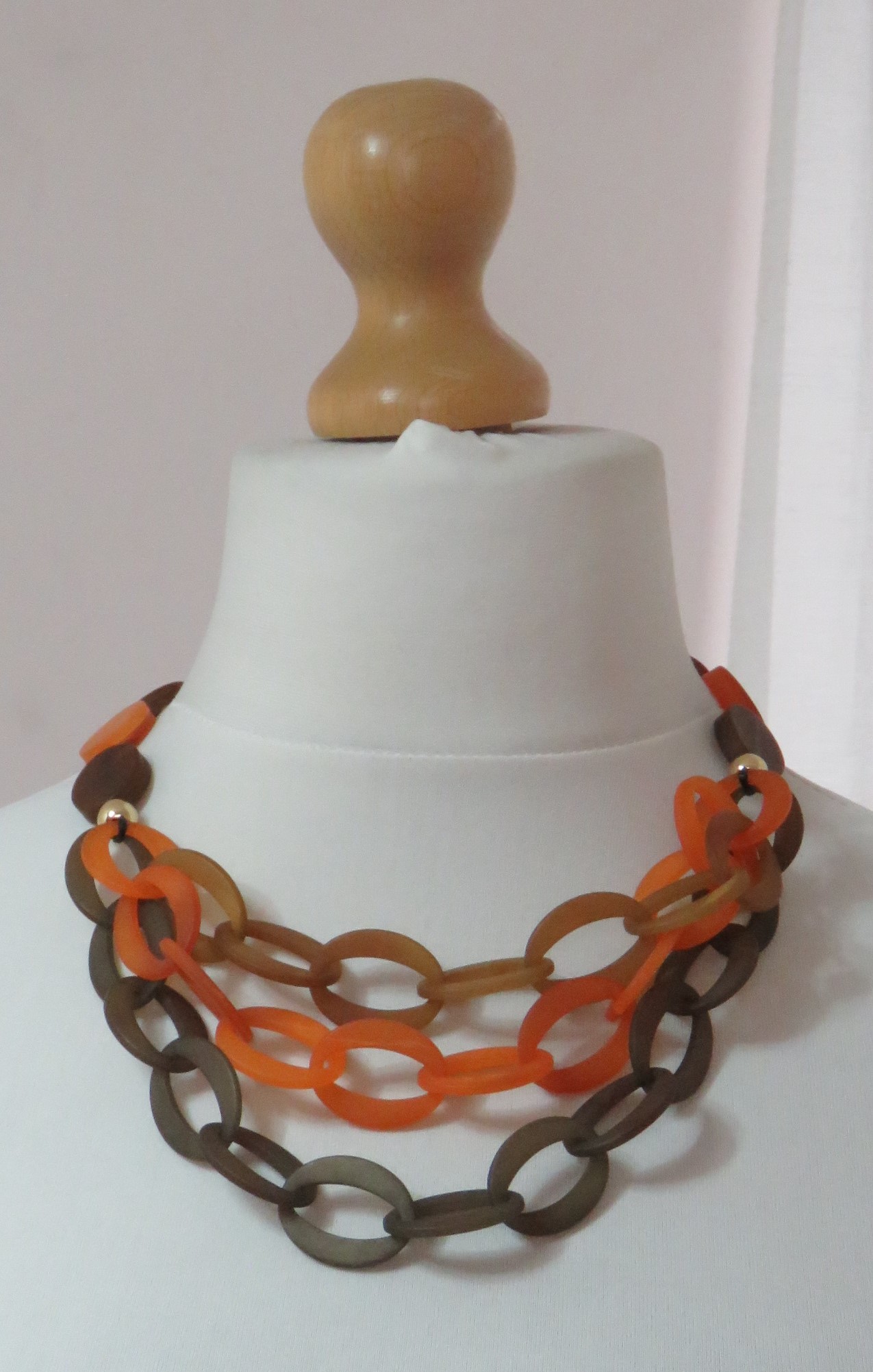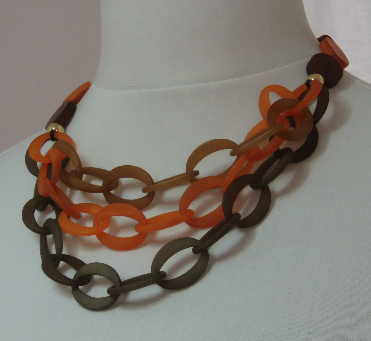 - Lagenlook, statement necklace, made of flat, orange & brown, frosted resin beads and a triple strand of brown, toffee & orange, frosted resin links