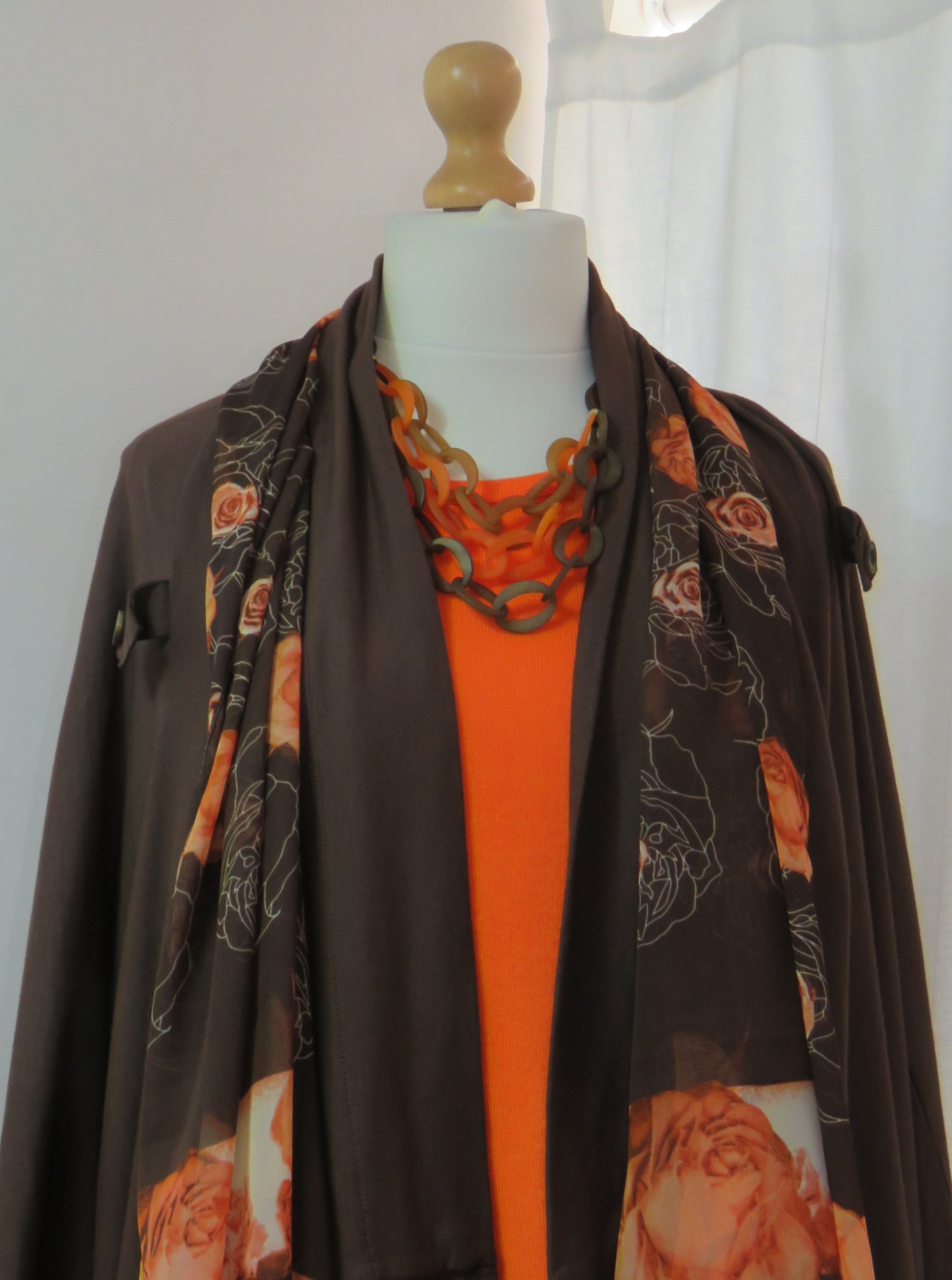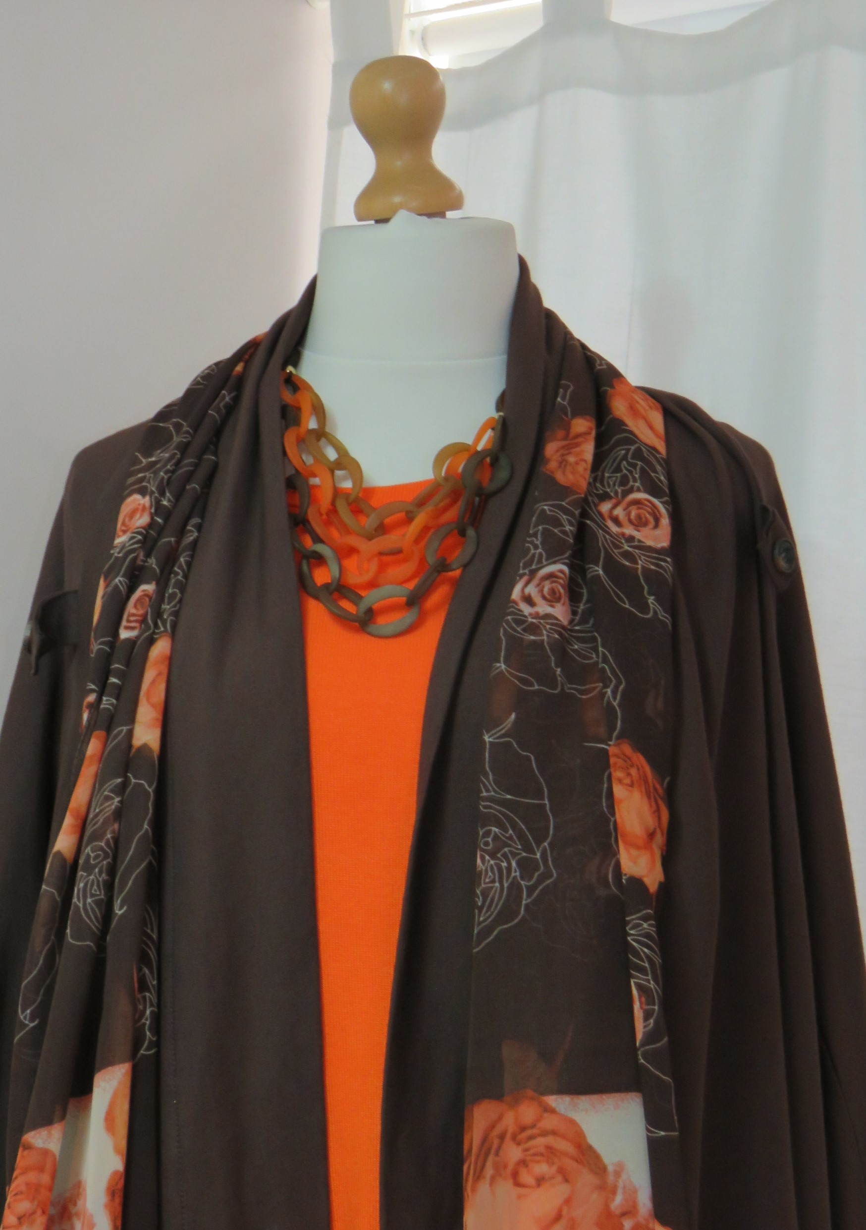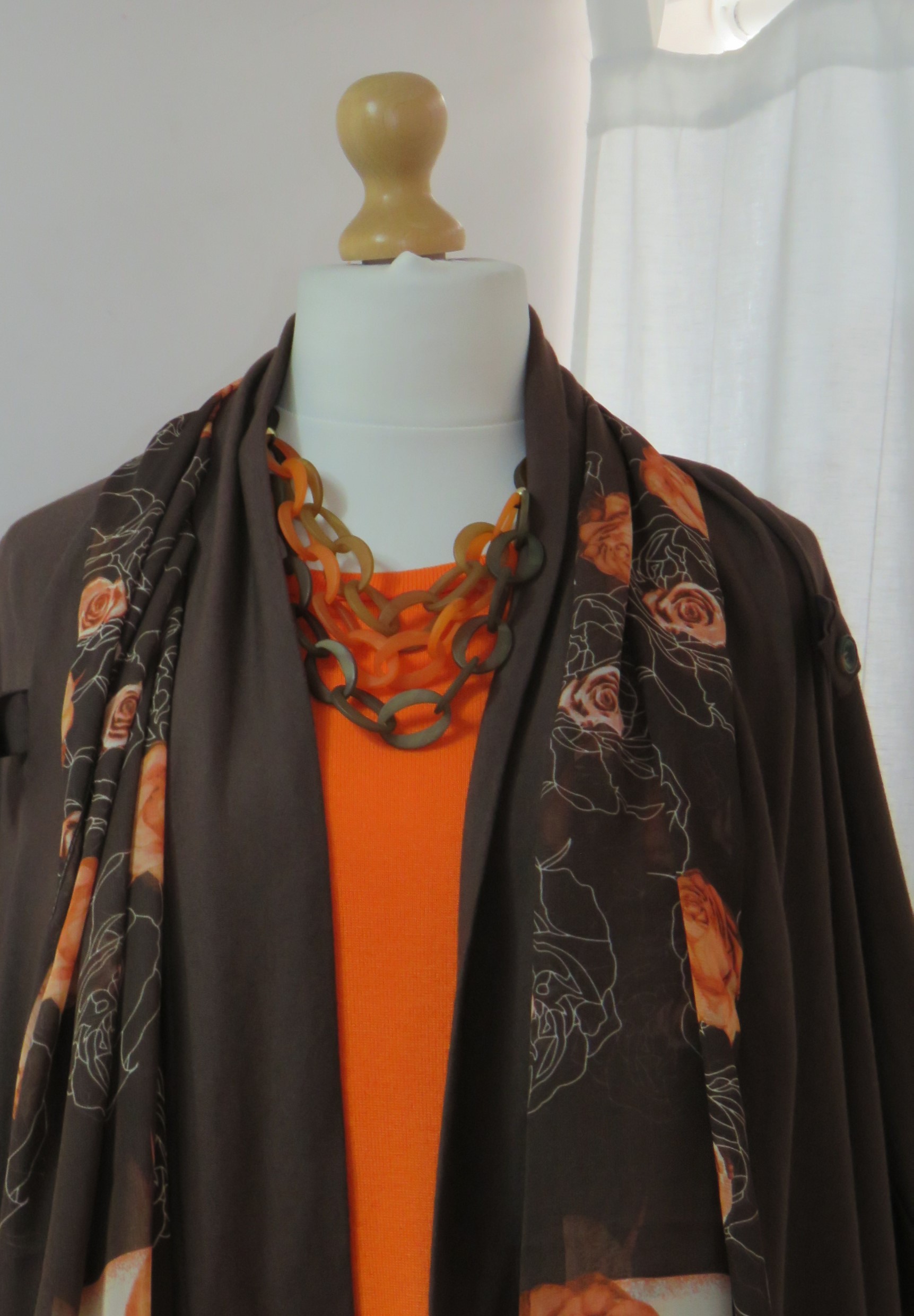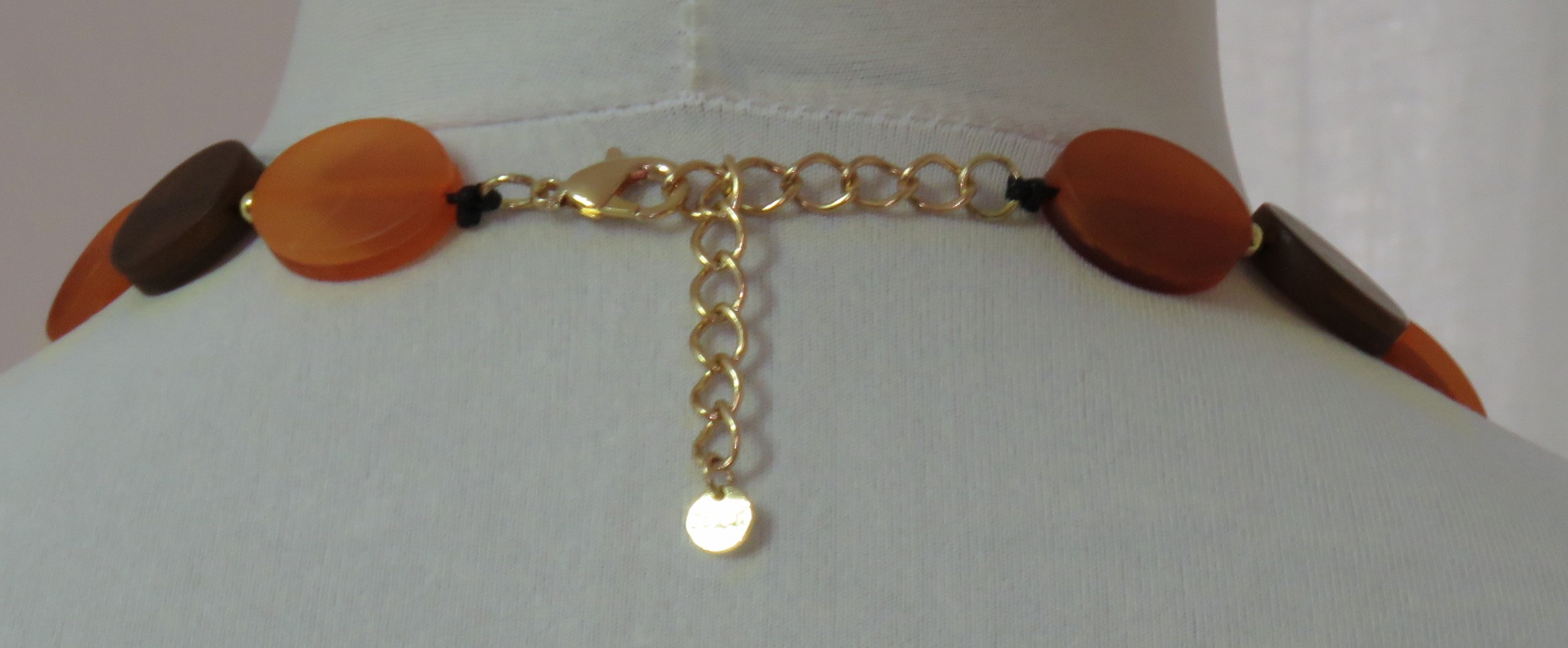 - Lagenlook, statement necklace, made of flat, orange & brown, frosted resin beads and a triple strand of brown, toffee & orange, frosted resin links