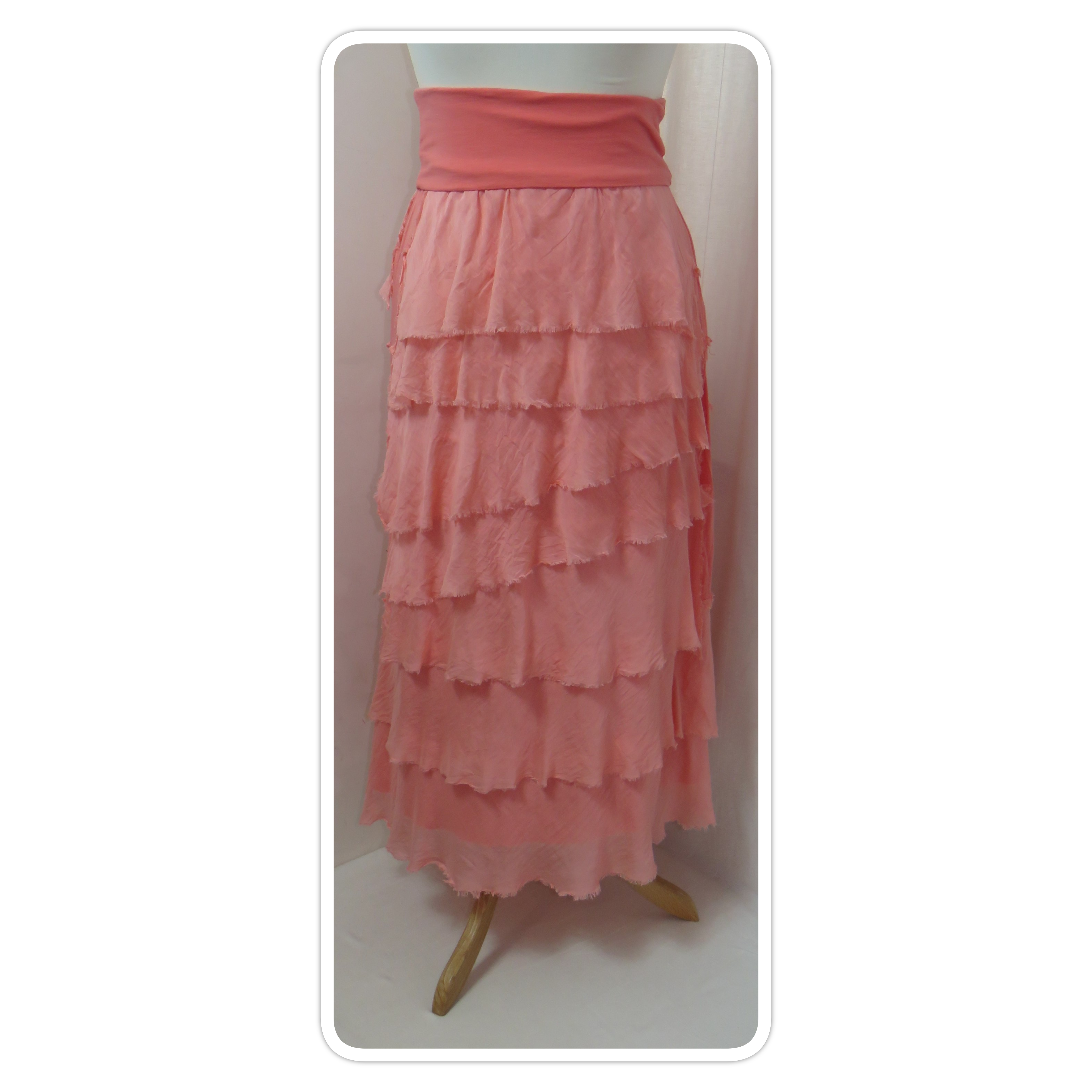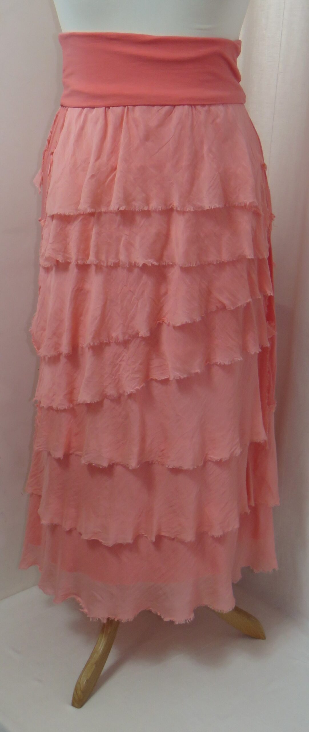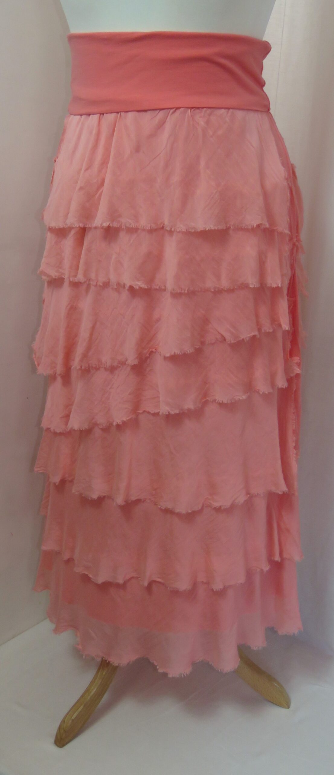 - Fine viscose jersey (95% viscose/5% elastane) with tiers of a silk-blend fabric sewn on asymmetrically back and front (40% cotton/30% viscose/30% silk) – these have a raw/frayed edge