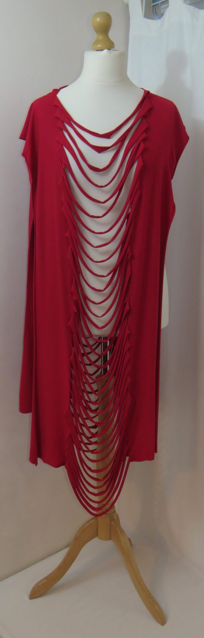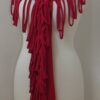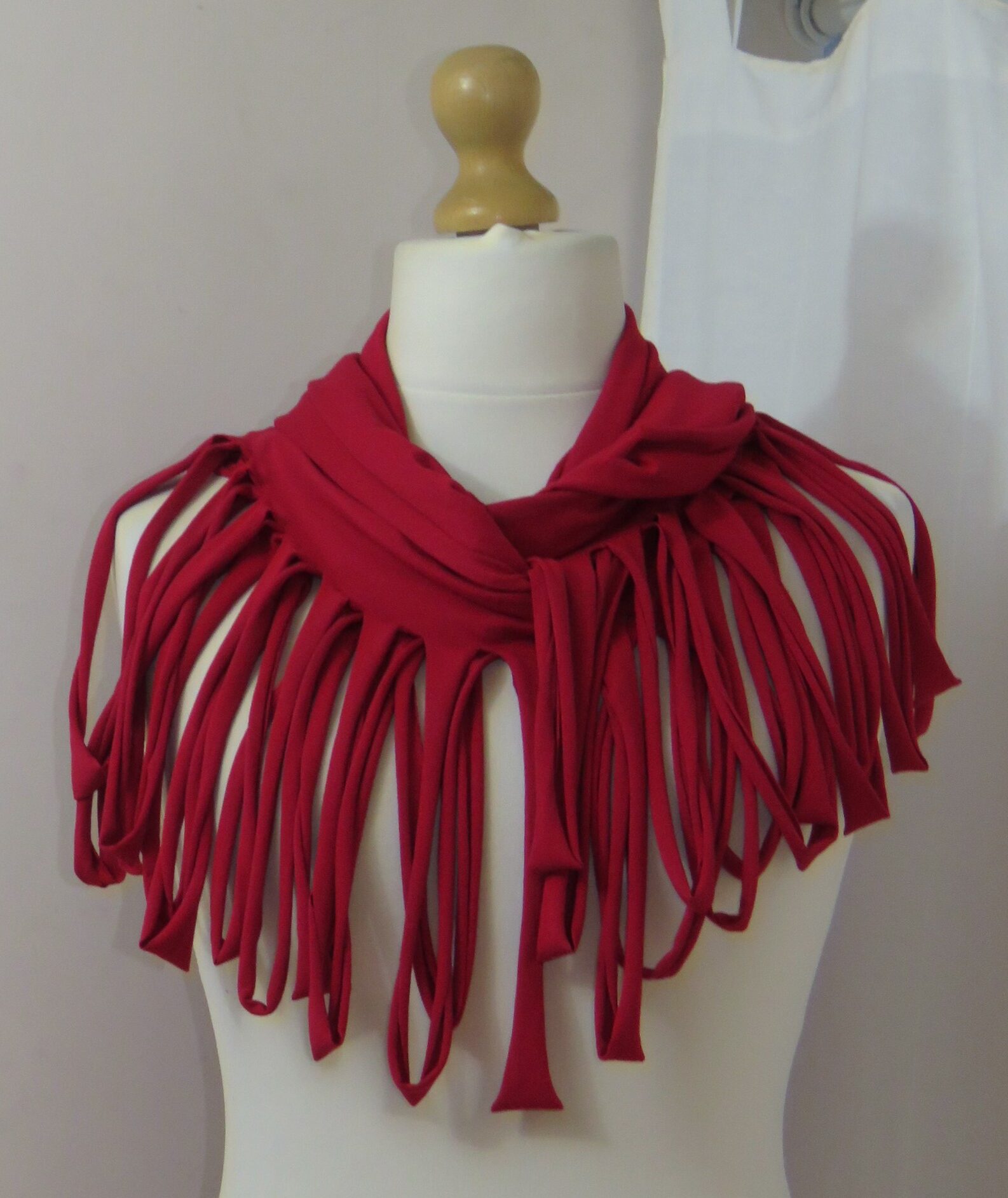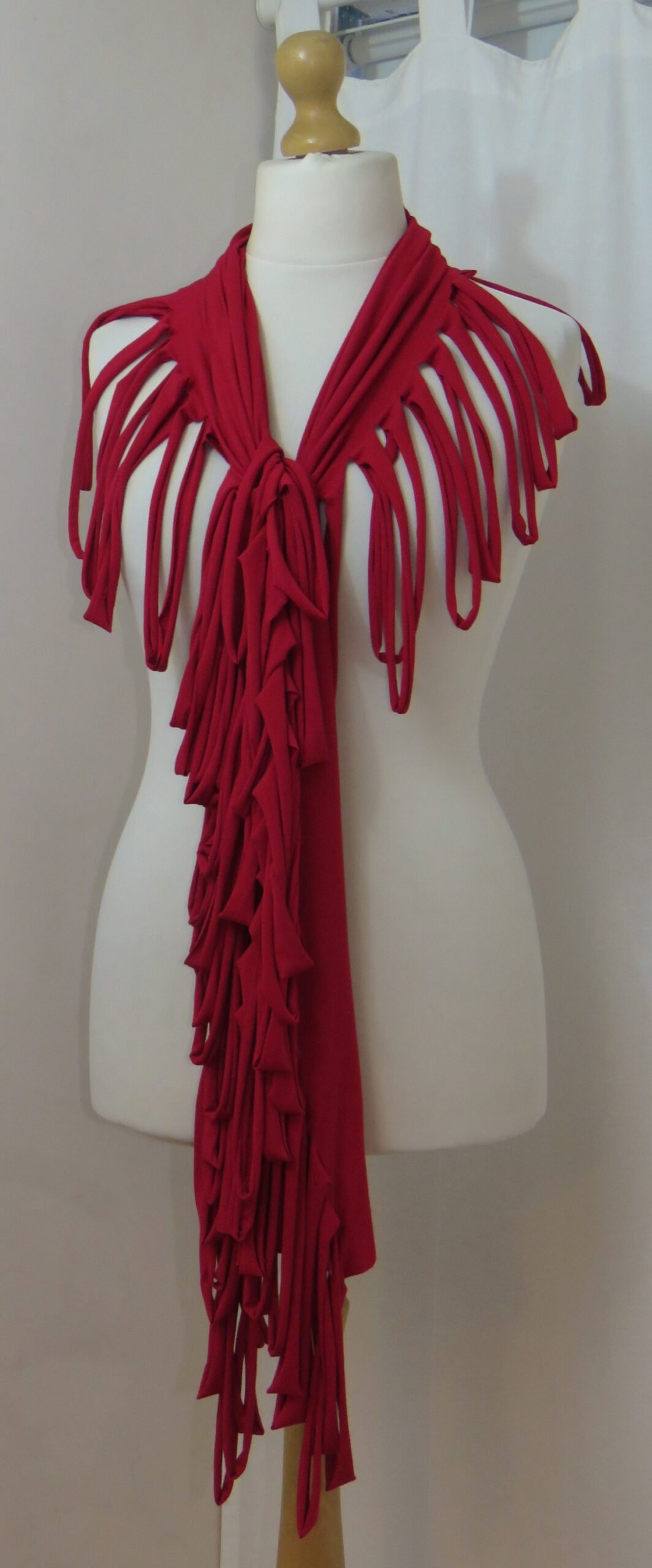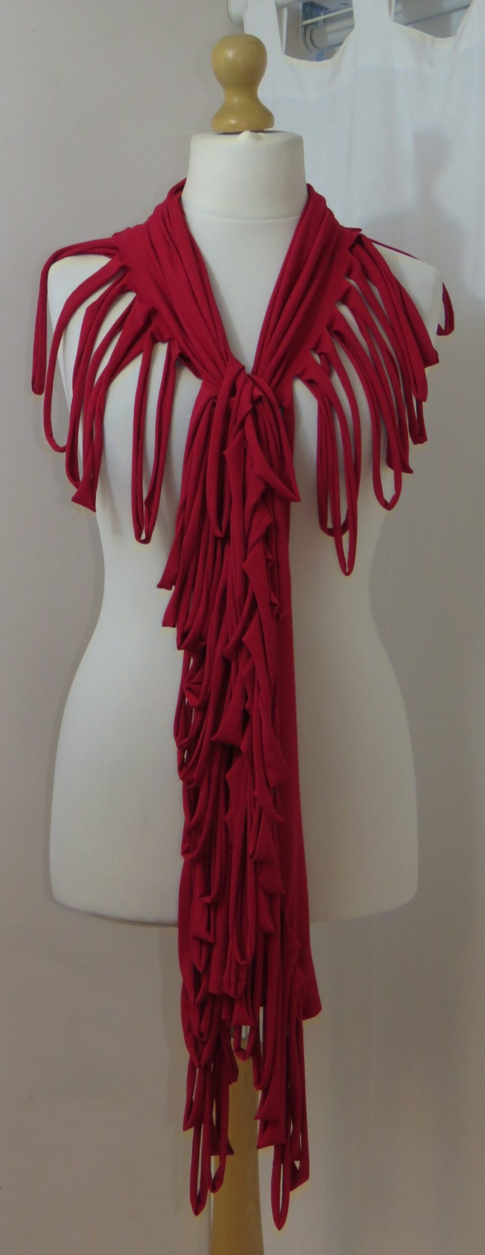 This is a fabulous, dark red Lagenlook, jersey, ladder scarf. It measures approx. 197cms x 71cms (measurements may vary slightly – if you want to know exact measurements, please contact me) and can be worn in many different ways. You can:
