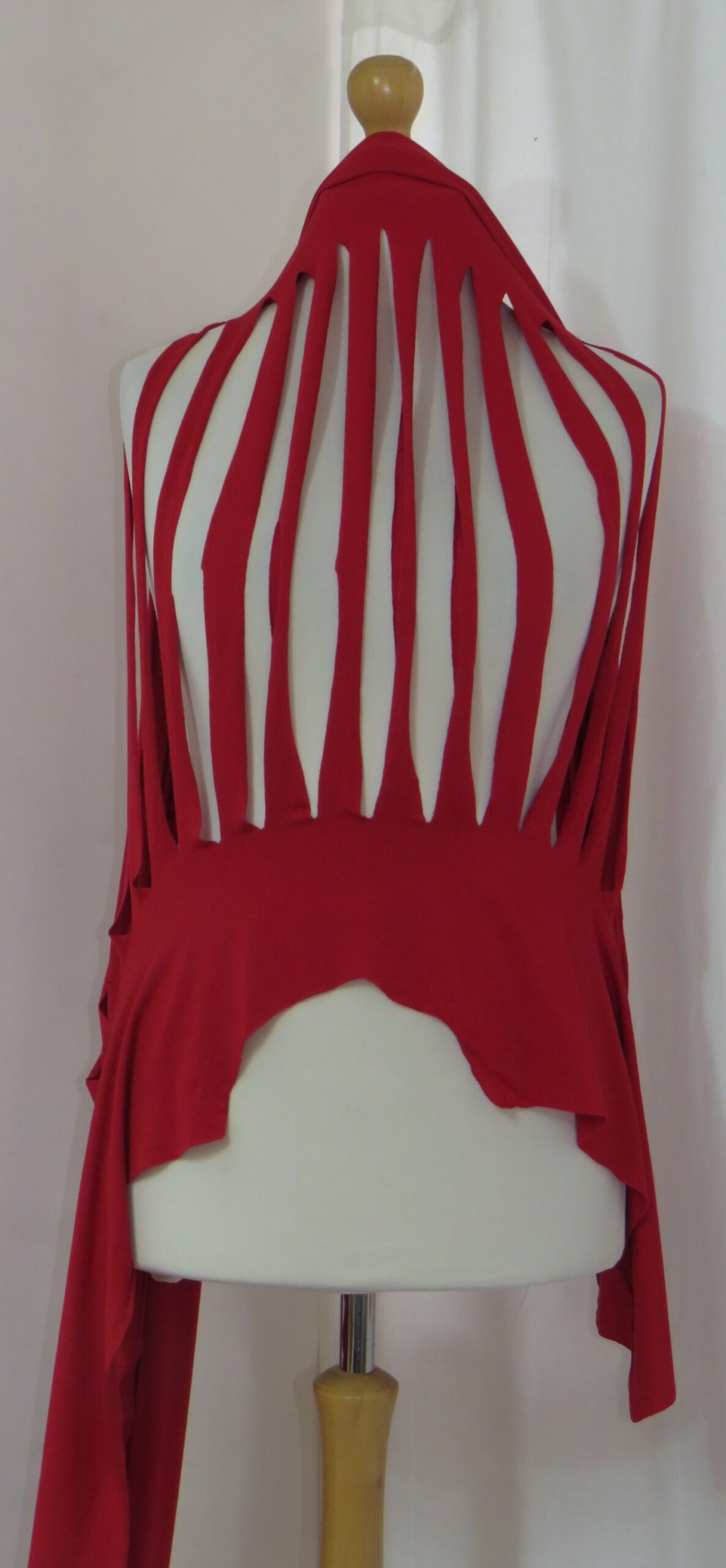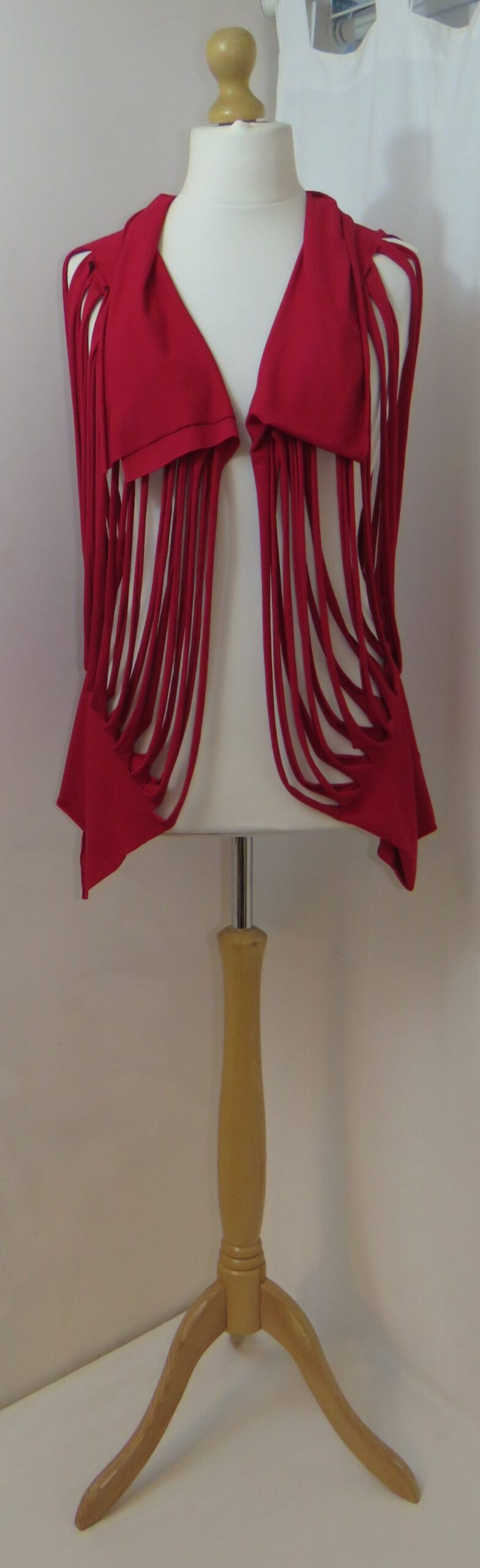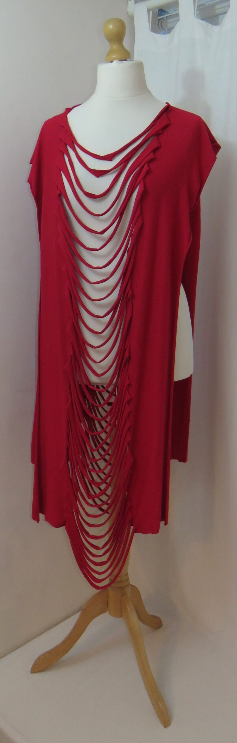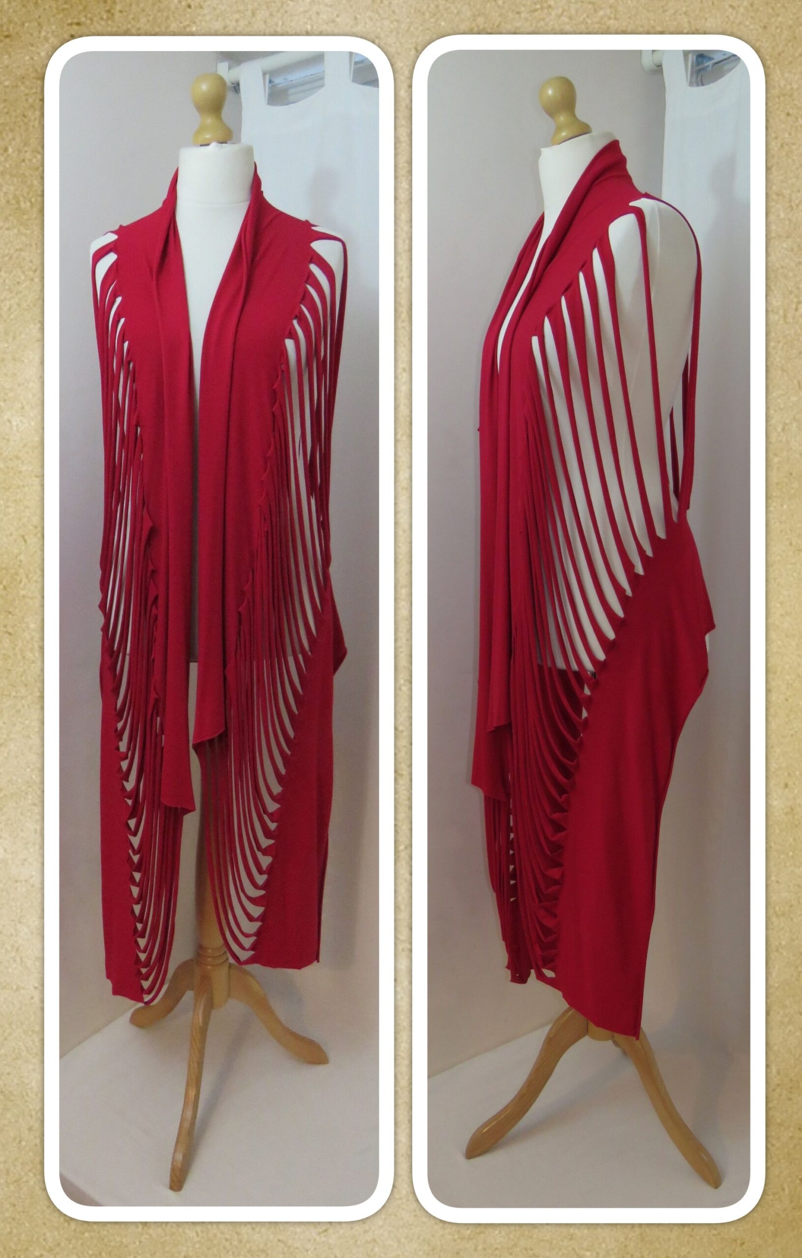 This is a fabulous, dark red Lagenlook, jersey, ladder scarf. It measures approx. 197cms x 71cms (measurements may vary slightly – if you want to know exact measurements, please contact me) and can be worn in many different ways. You can: