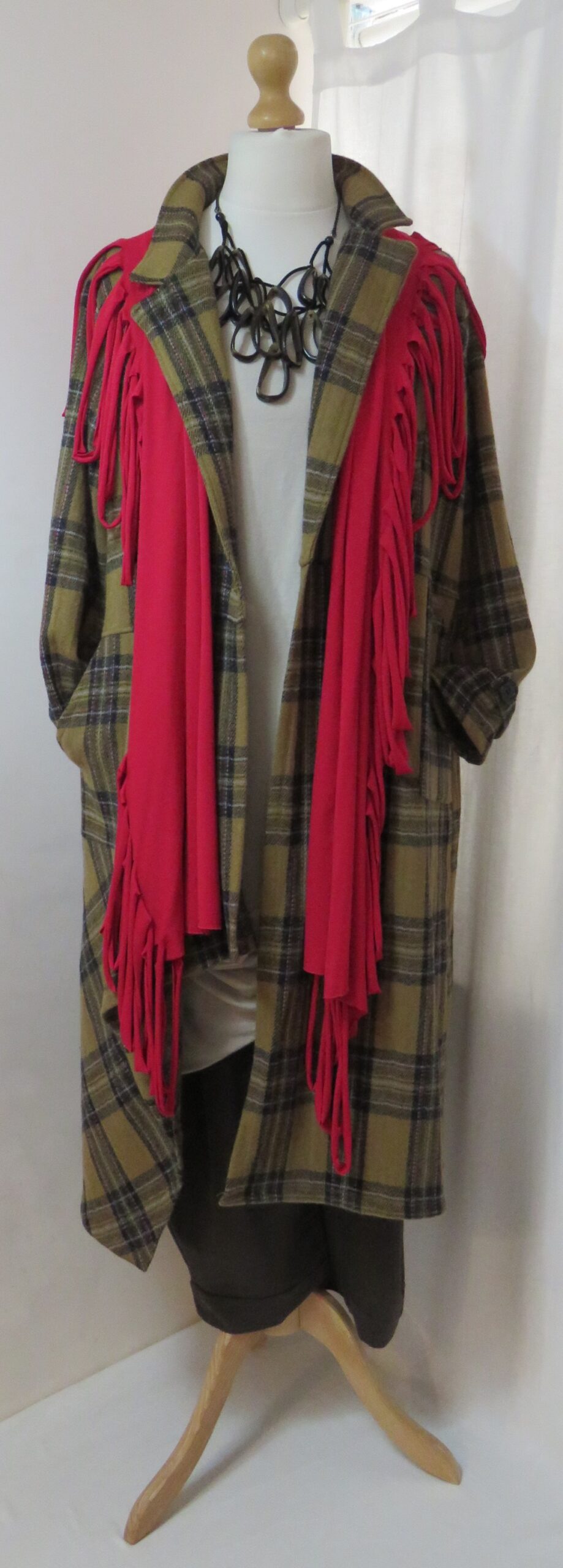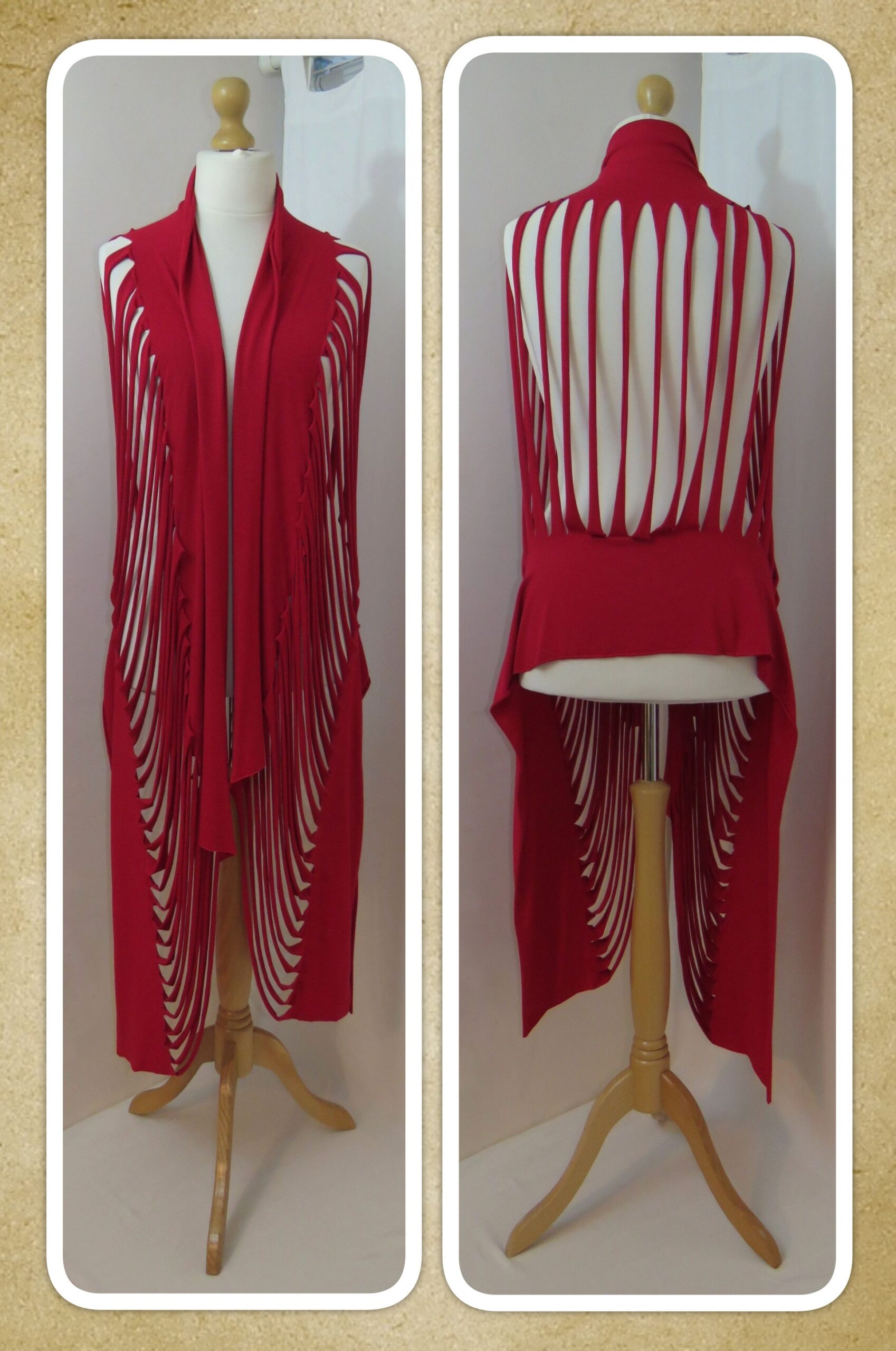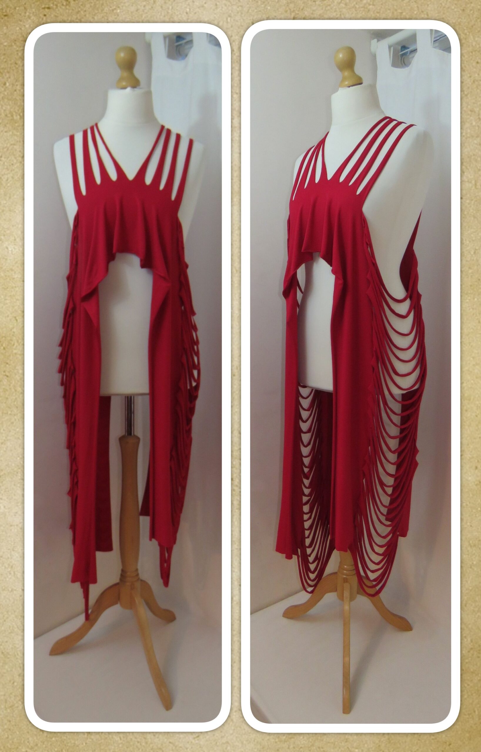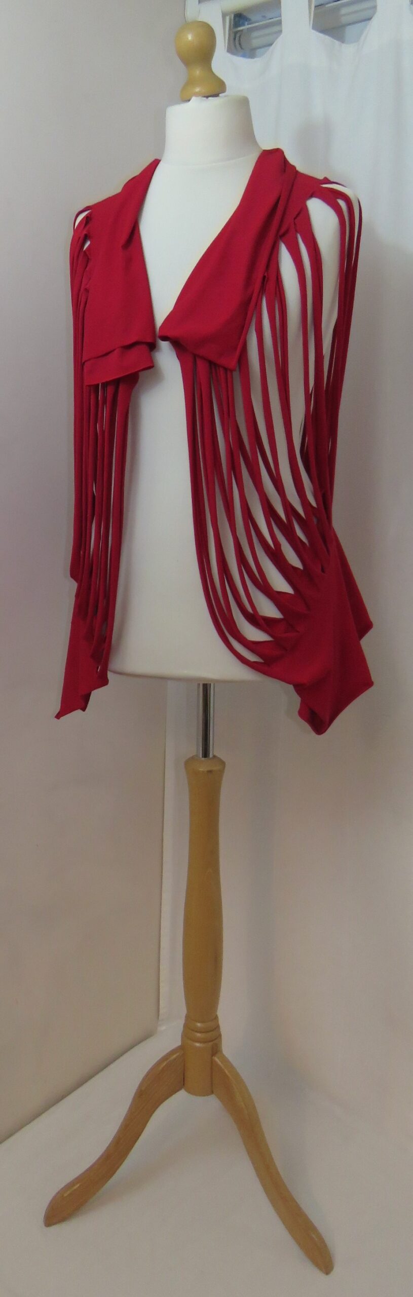 This is a fabulous, dark red Lagenlook, jersey, ladder scarf. It measures approx. 197cms x 71cms (measurements may vary slightly – if you want to know exact measurements, please contact me) and can be worn in many different ways. You can: