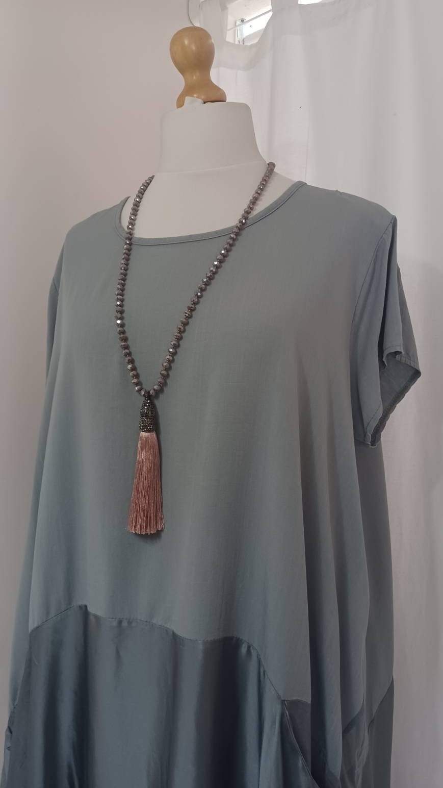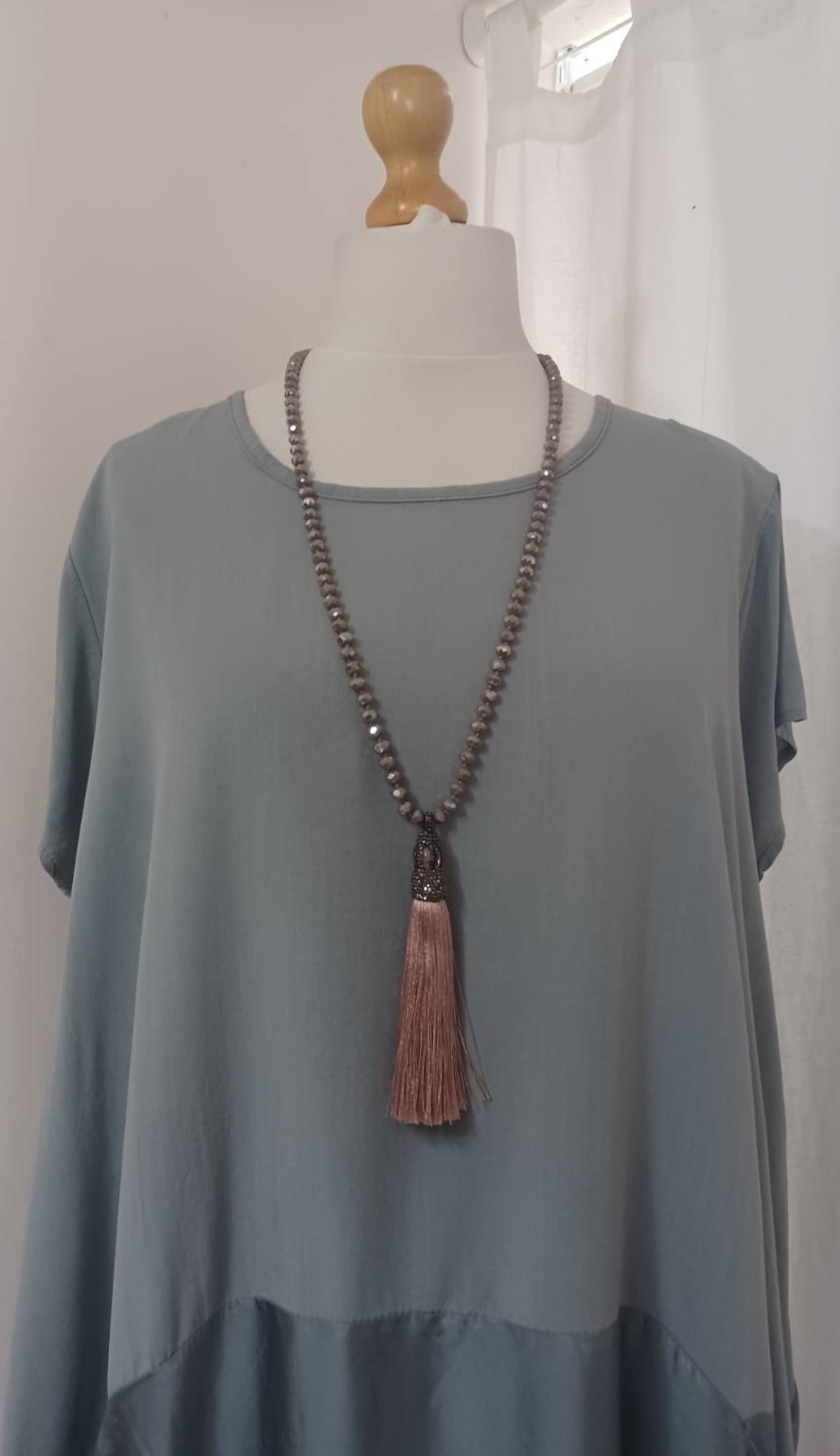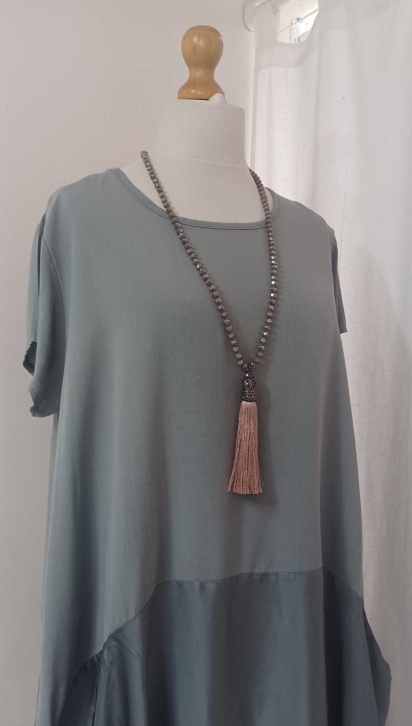 • Lagenlook, statement necklace, made of faceted, taupe-coloured beads and a fabulous, silky, dusky pink tassel