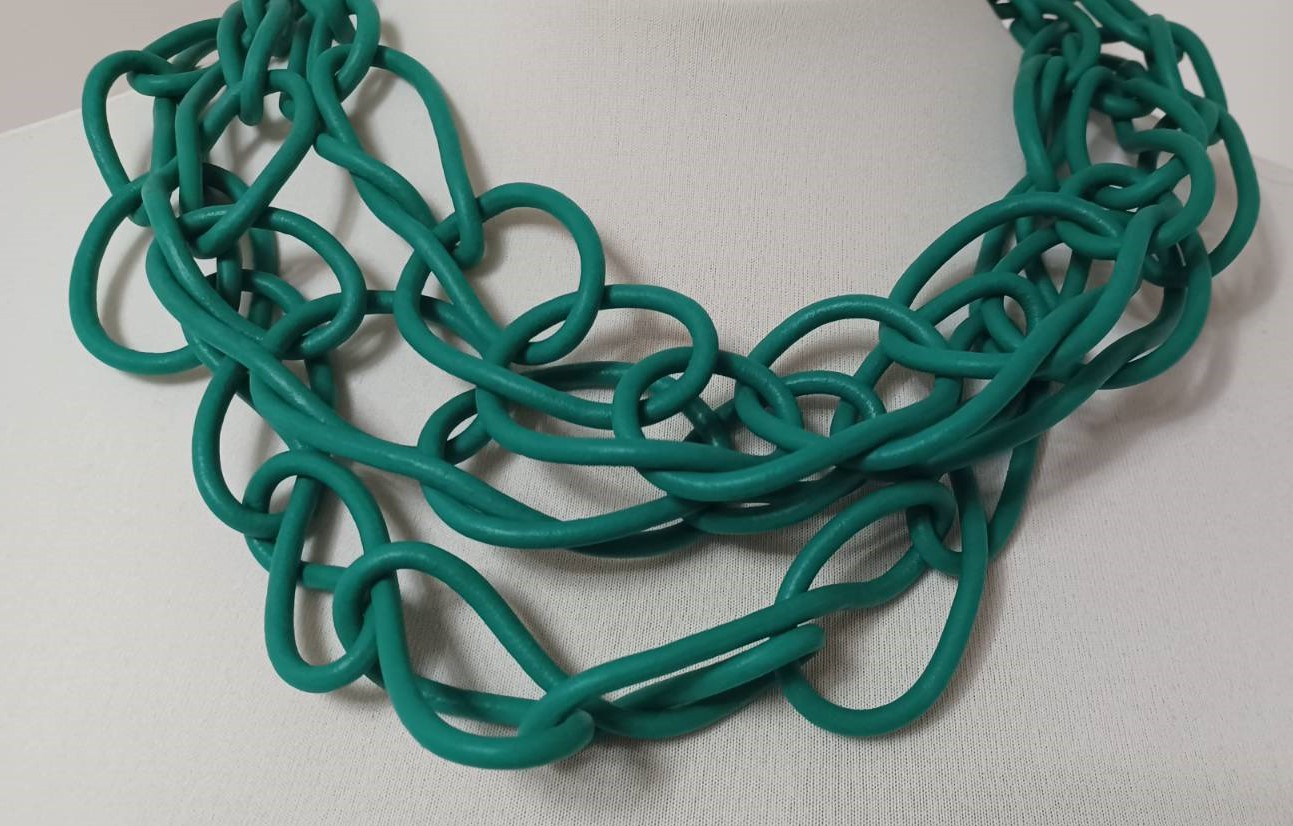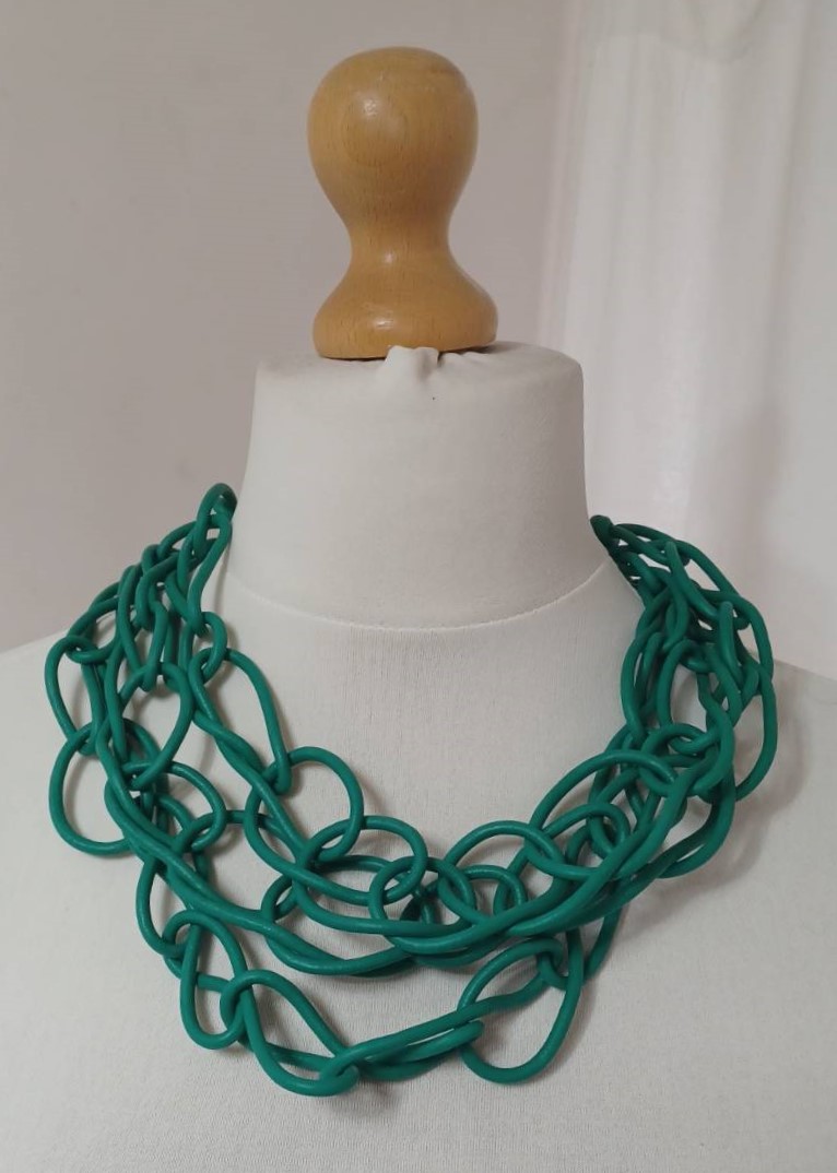 • Lagenlook statement necklace, made of 3 strands of irregular, emerald green, rubber chain