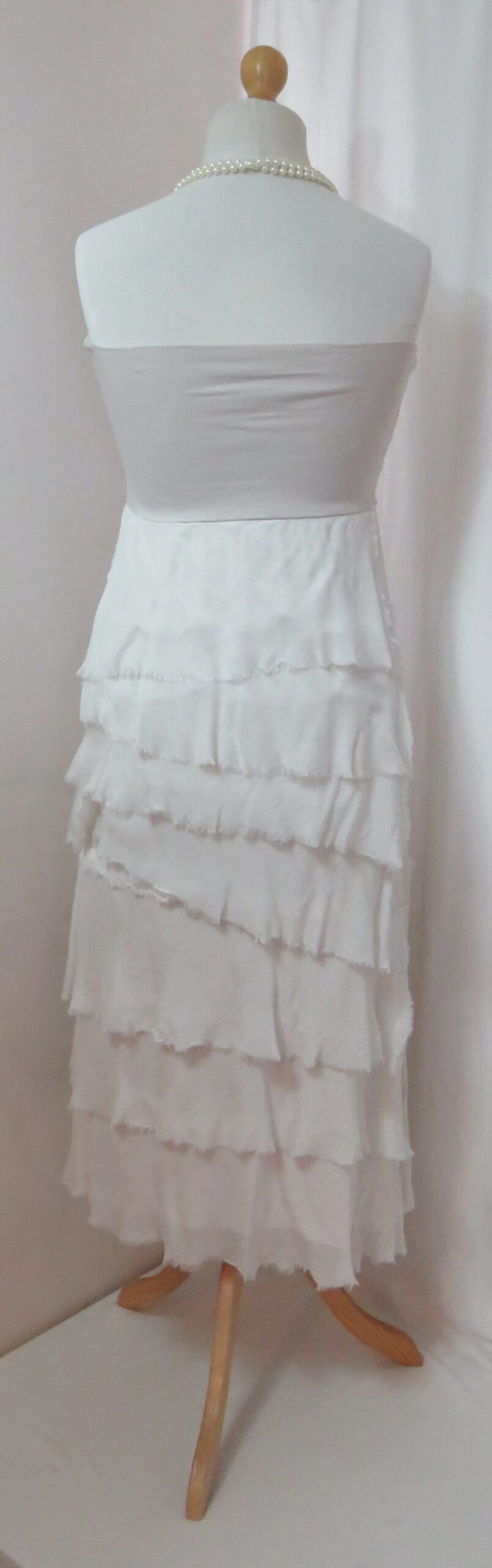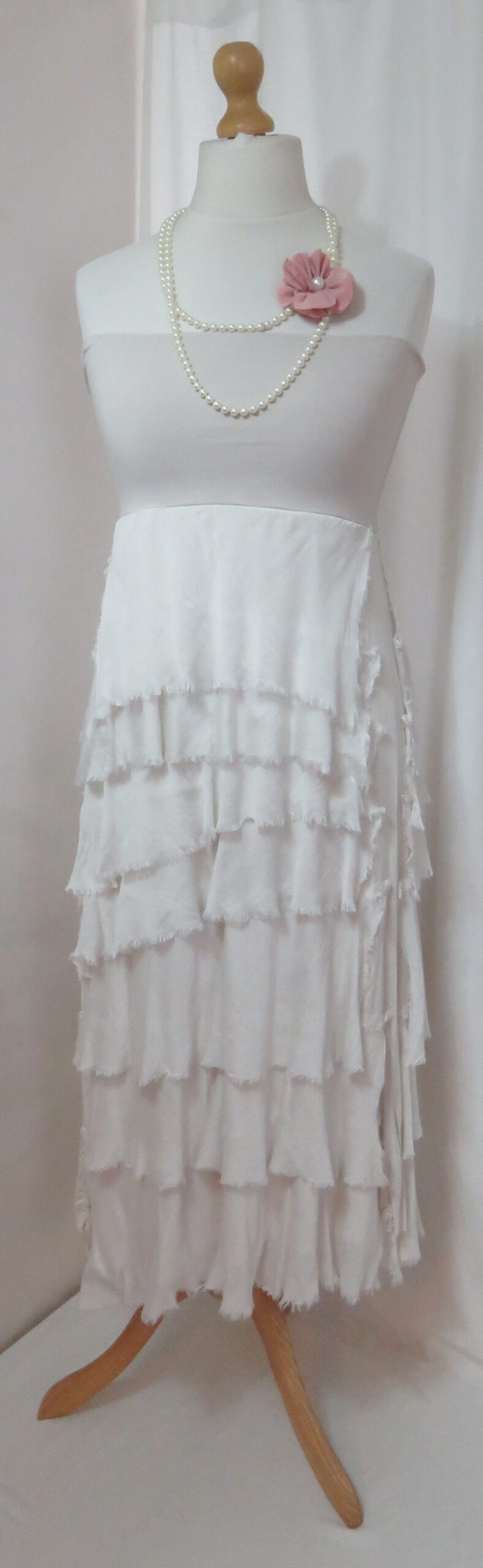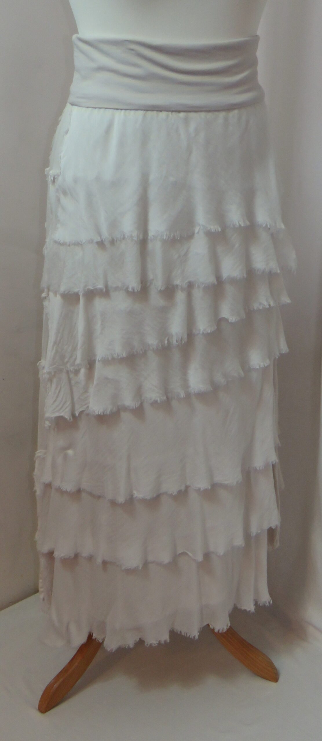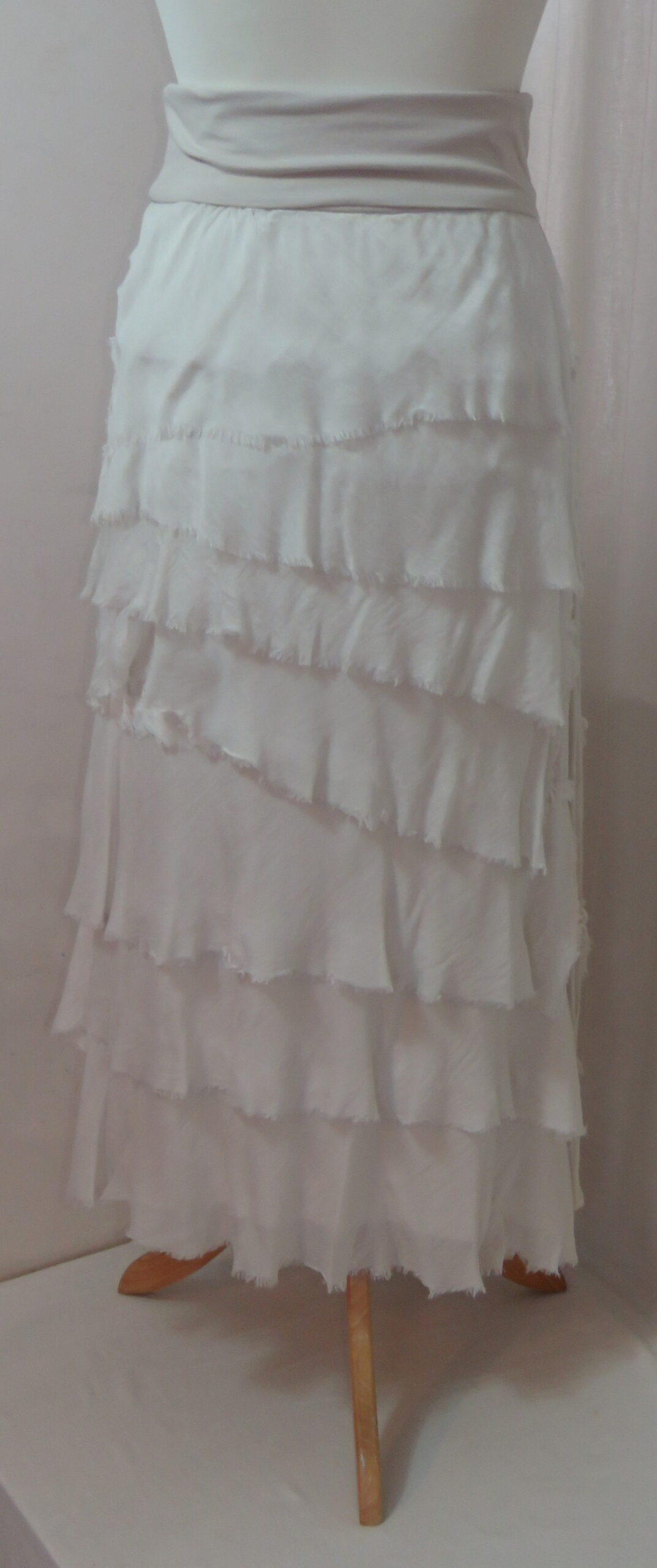 - Fine viscose jersey (95% viscose/5% elastane) with tiers of a silk-blend fabric sewn on asymmetrically back and front (40% cotton/30% viscose/30% silk) – these have a raw/frayed edge