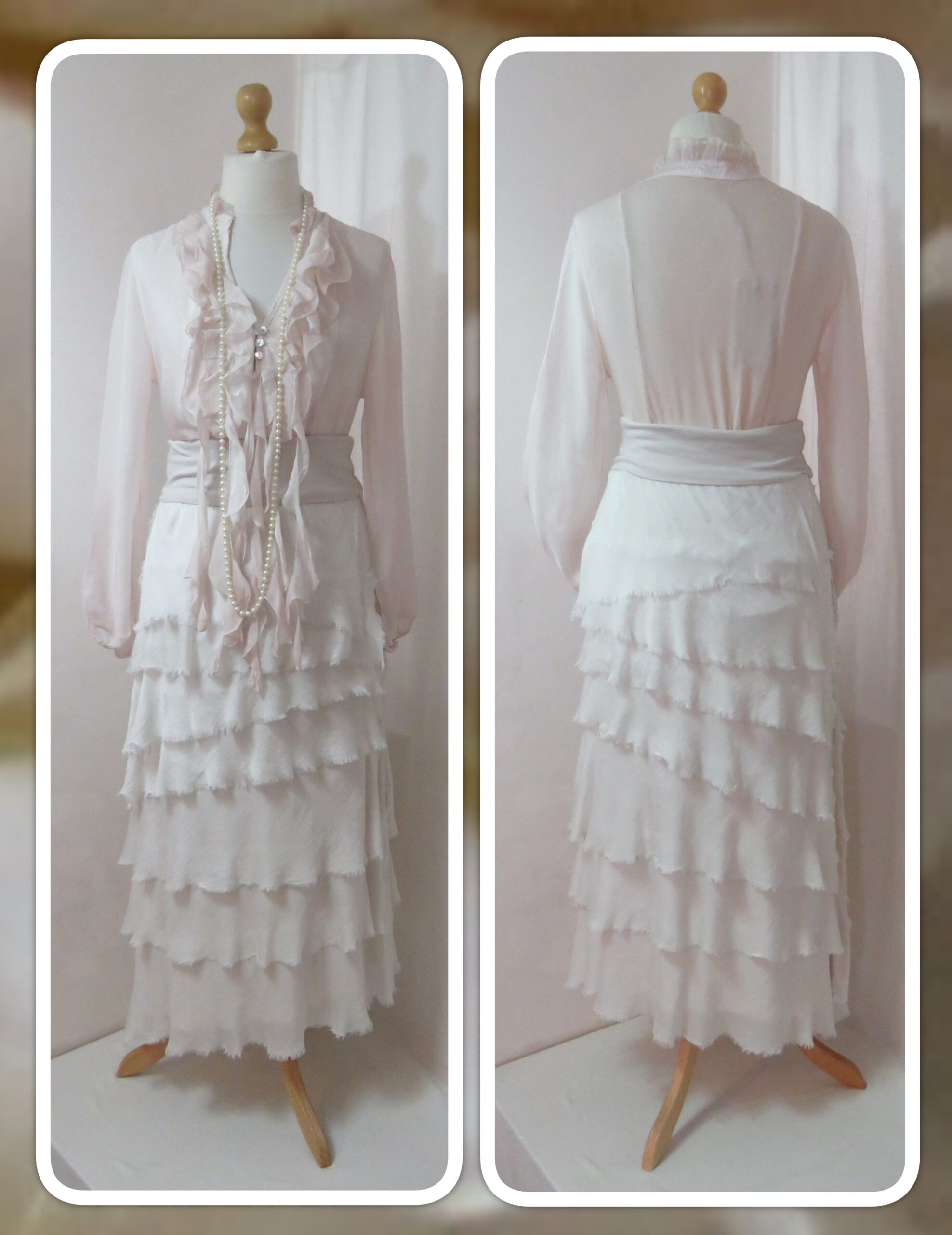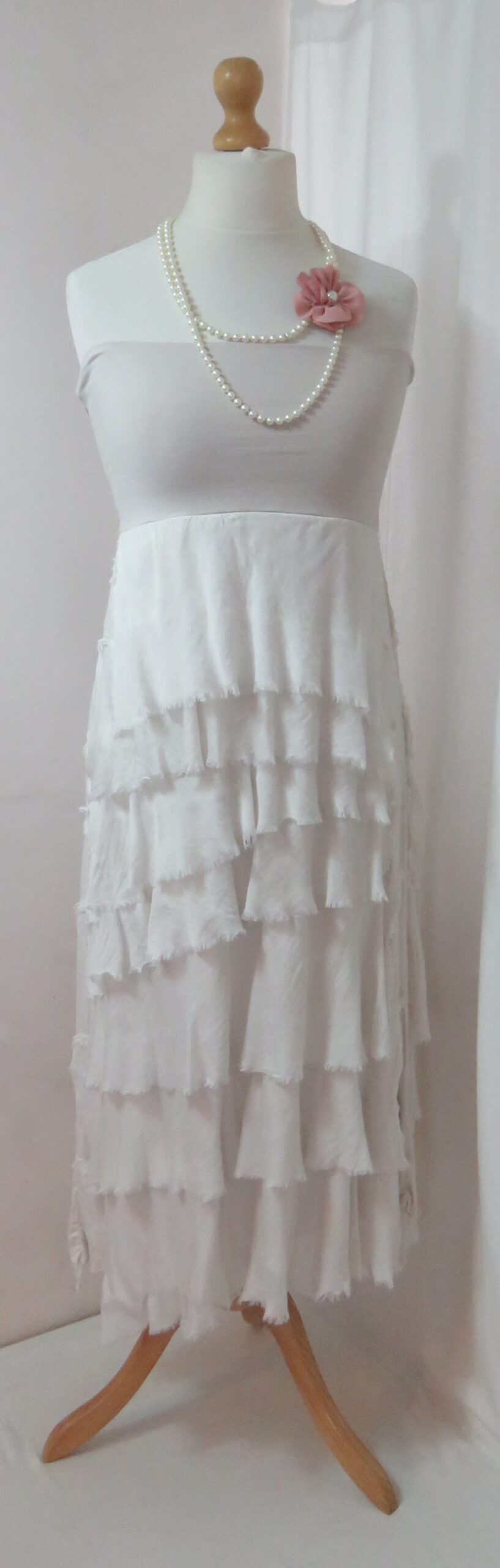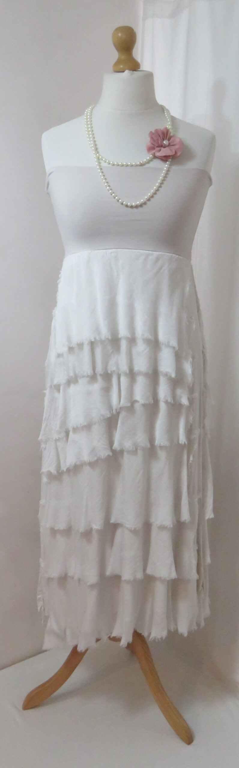 - Fine viscose jersey (95% viscose/5% elastane) with tiers of a silk-blend fabric sewn on asymmetrically back and front (40% cotton/30% viscose/30% silk) – these have a raw/frayed edge