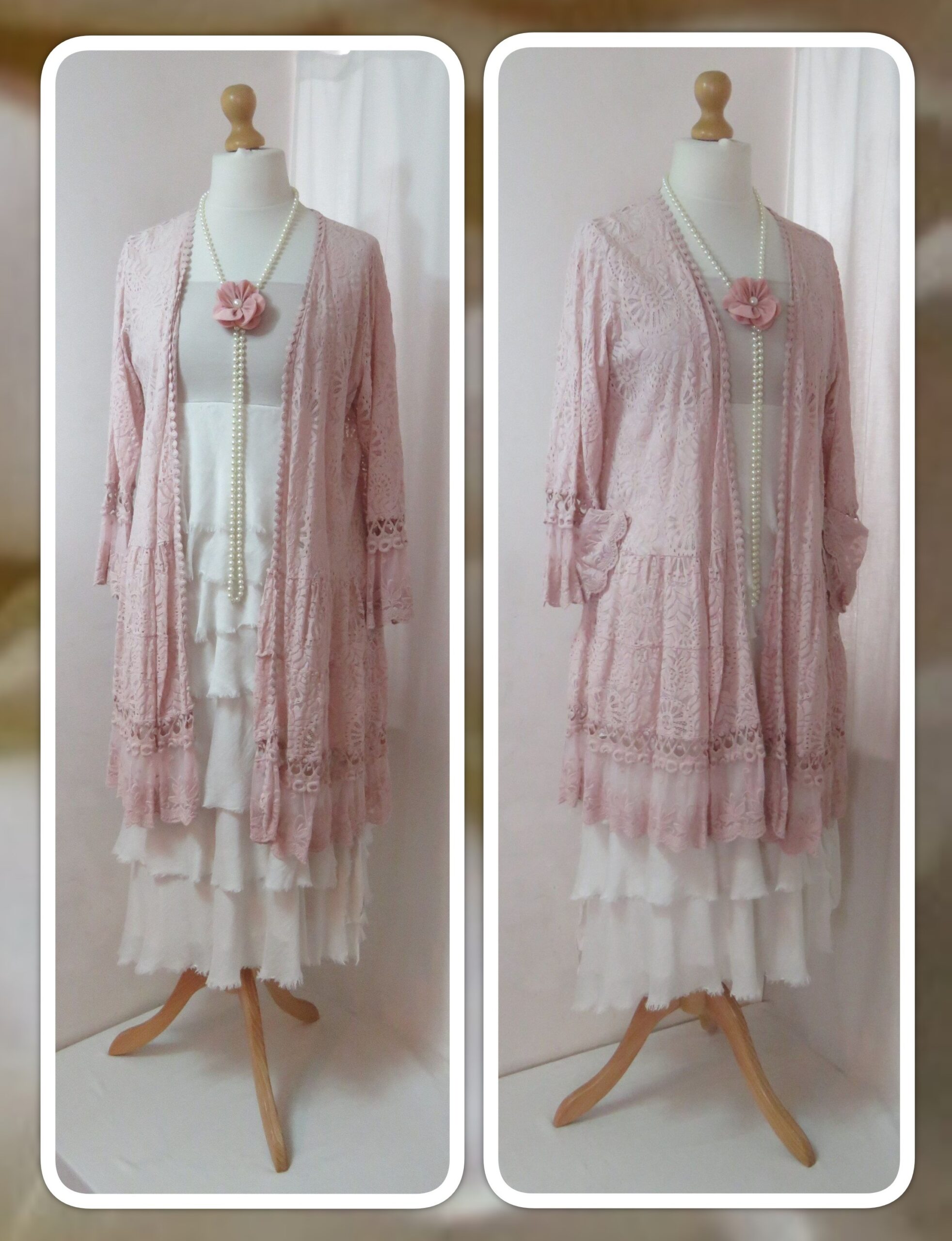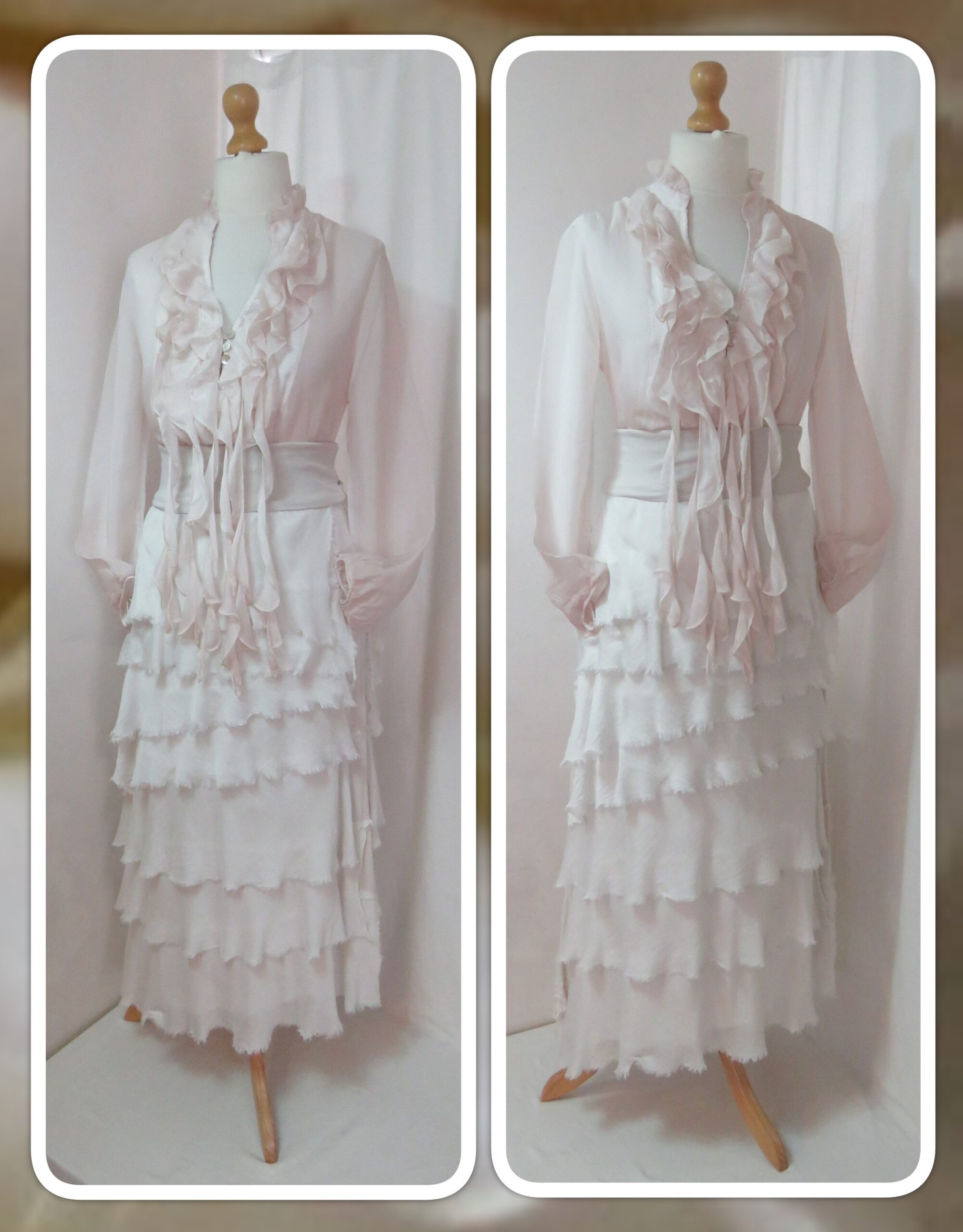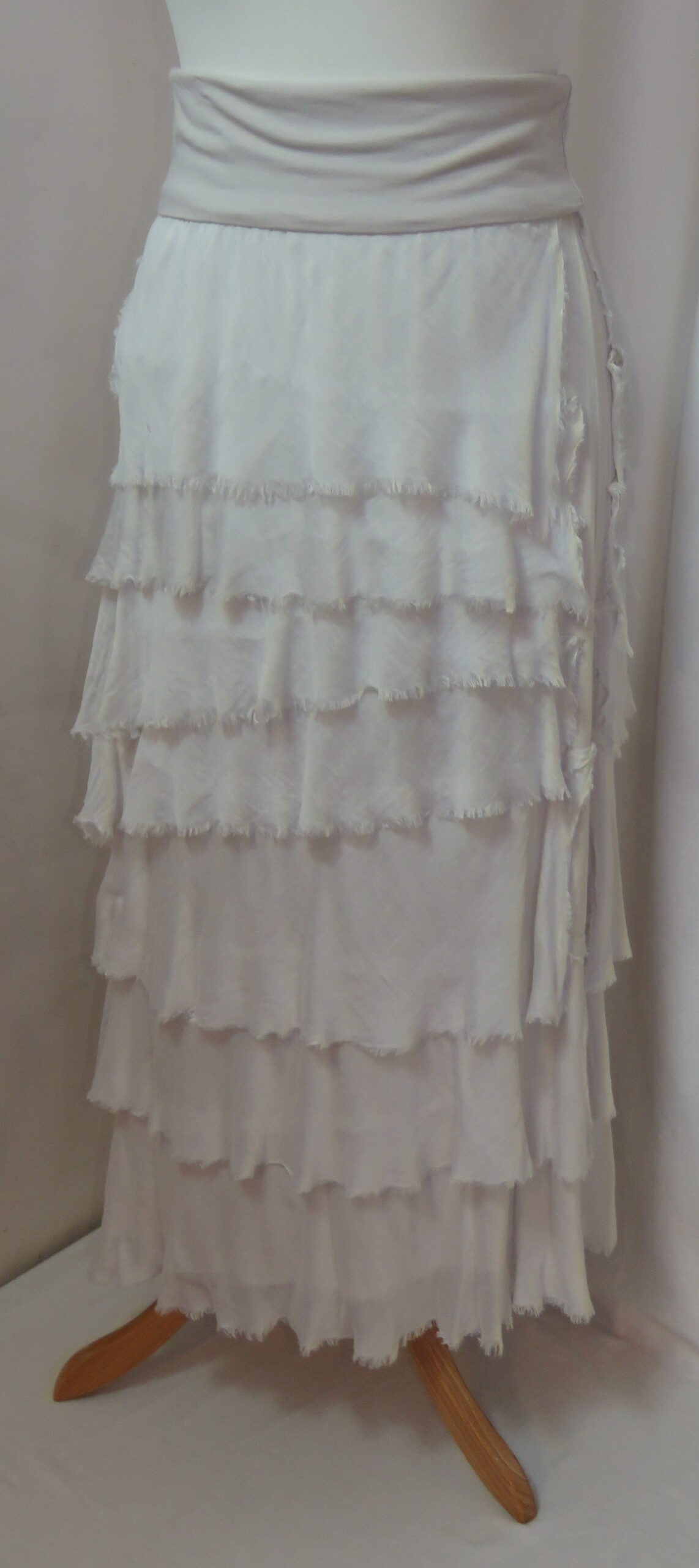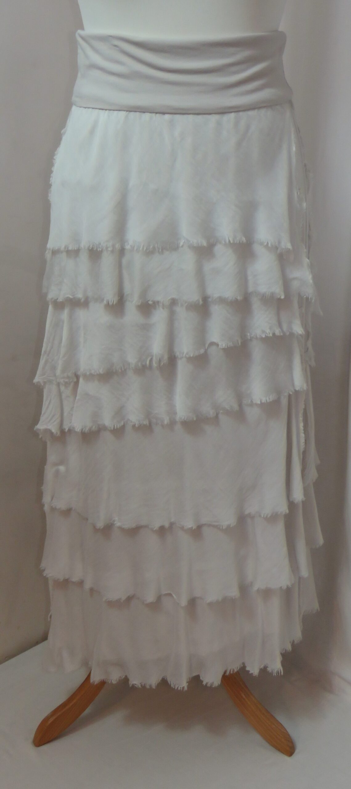 - Fine viscose jersey (95% viscose/5% elastane) with tiers of a silk-blend fabric sewn on asymmetrically back and front (40% cotton/30% viscose/30% silk) – these have a raw/frayed edge