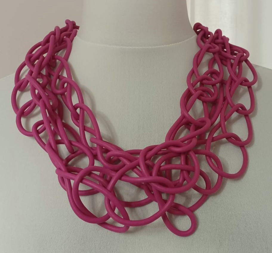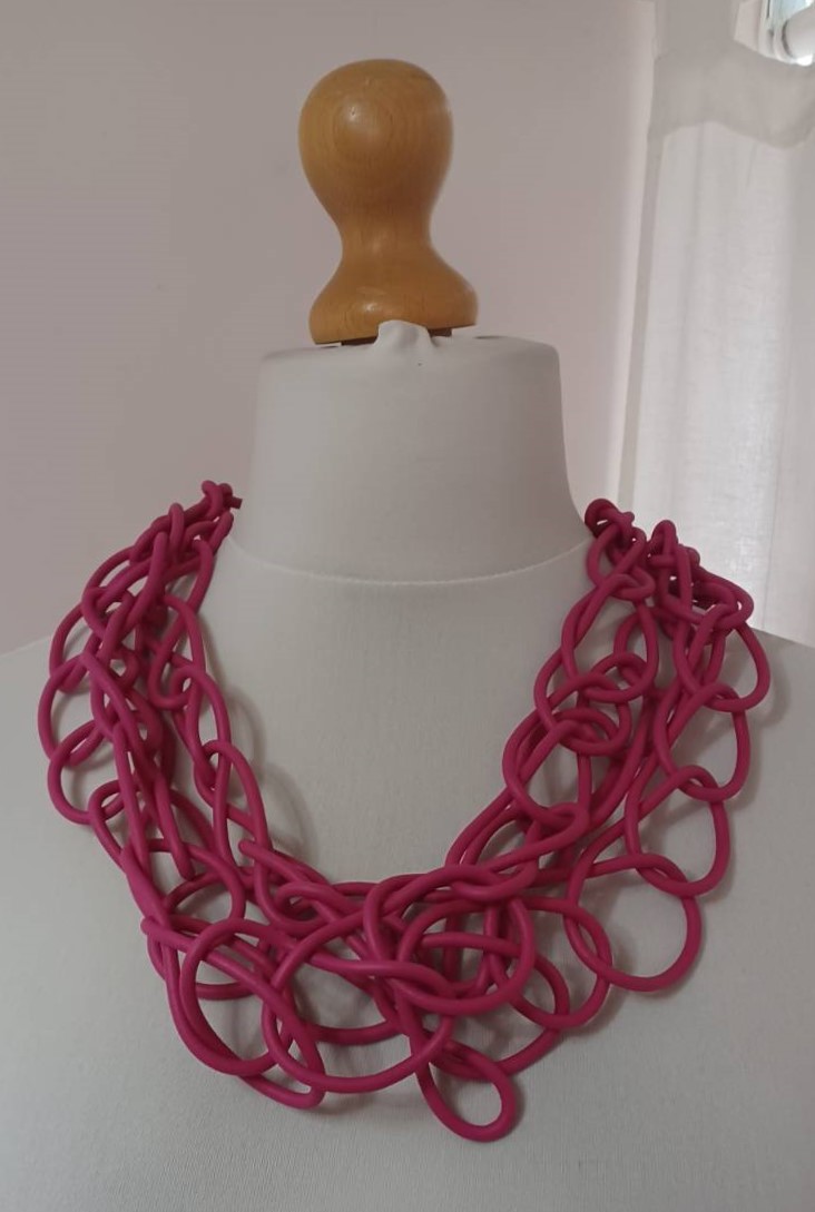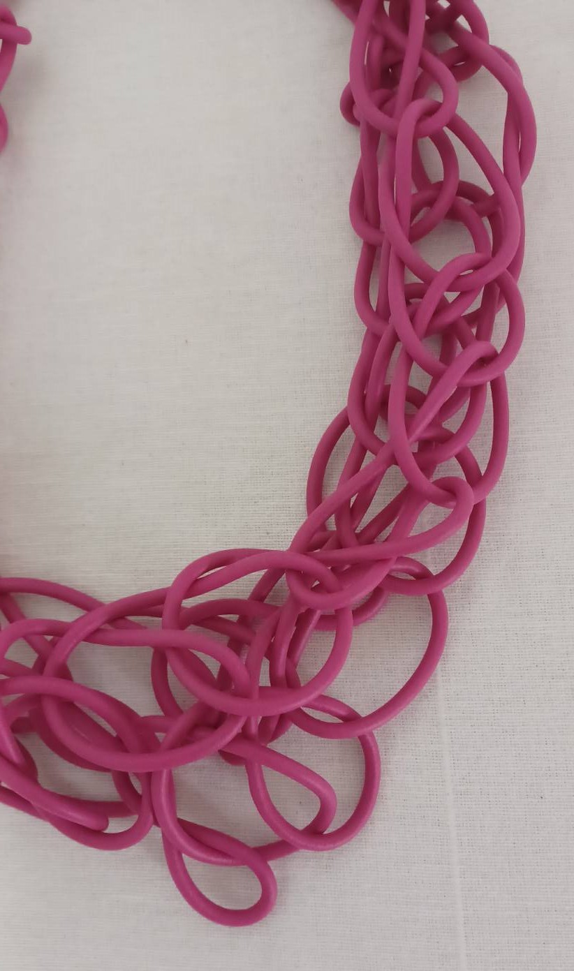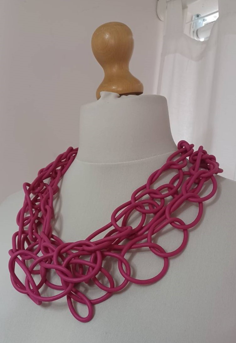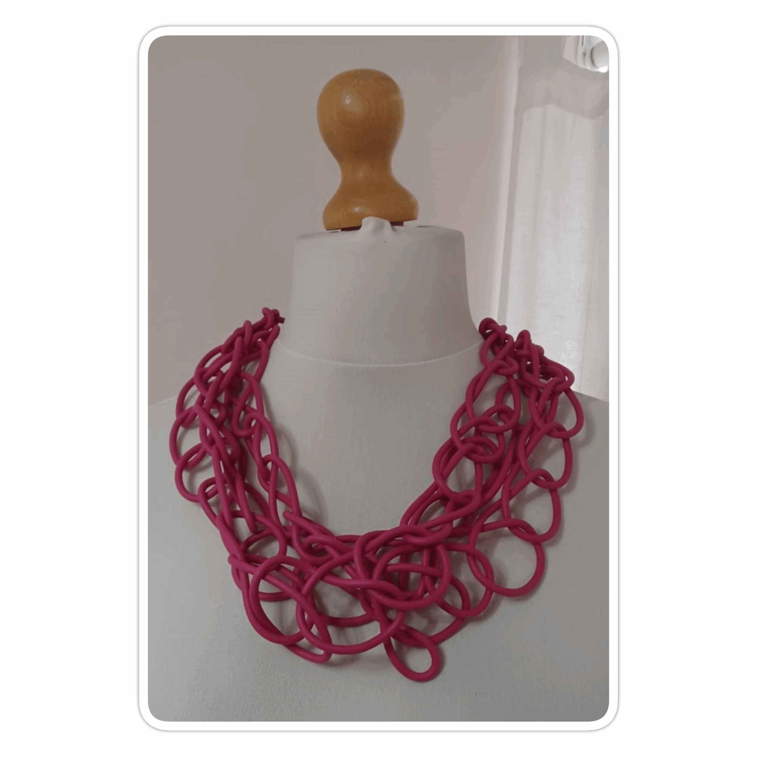 • Lagenlook statement necklace, made of 3 strands of irregular, fuchsia, rubber chain