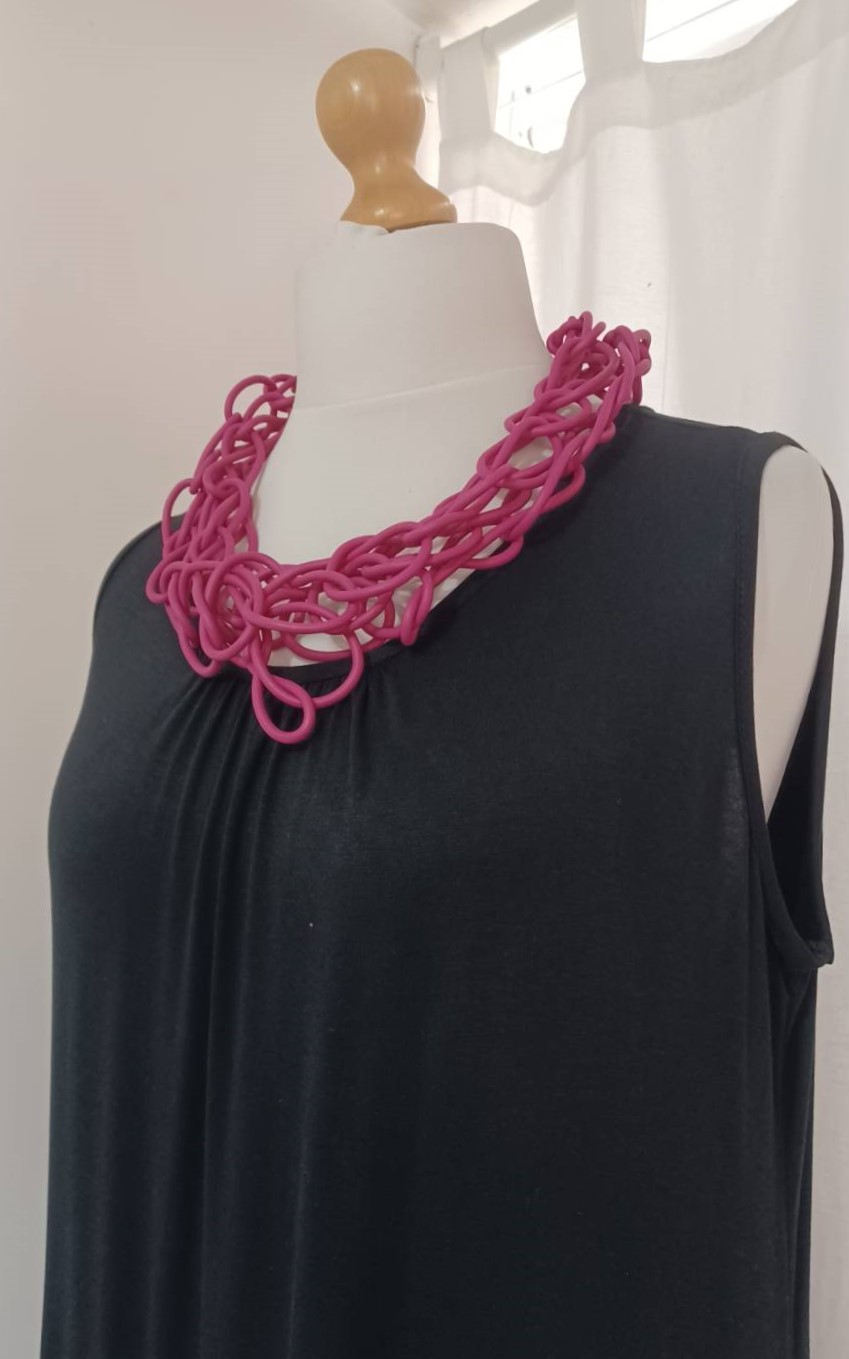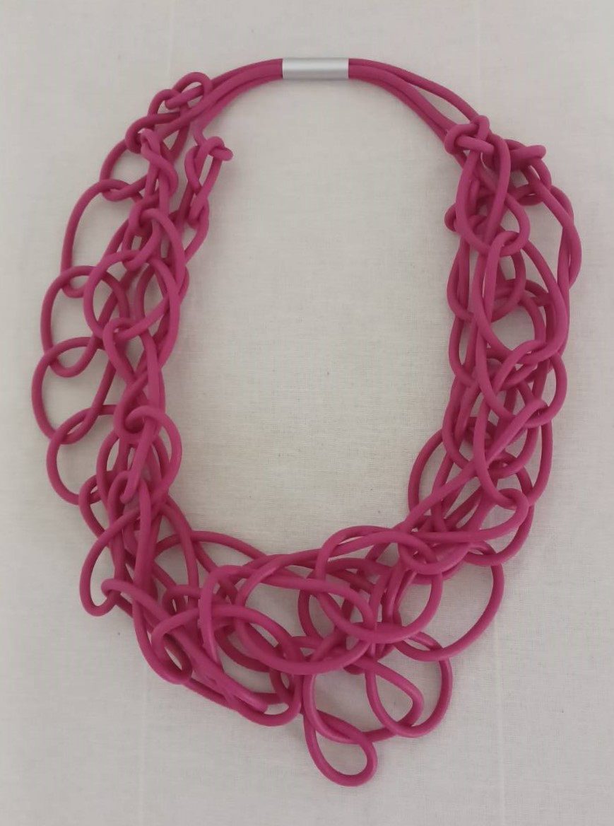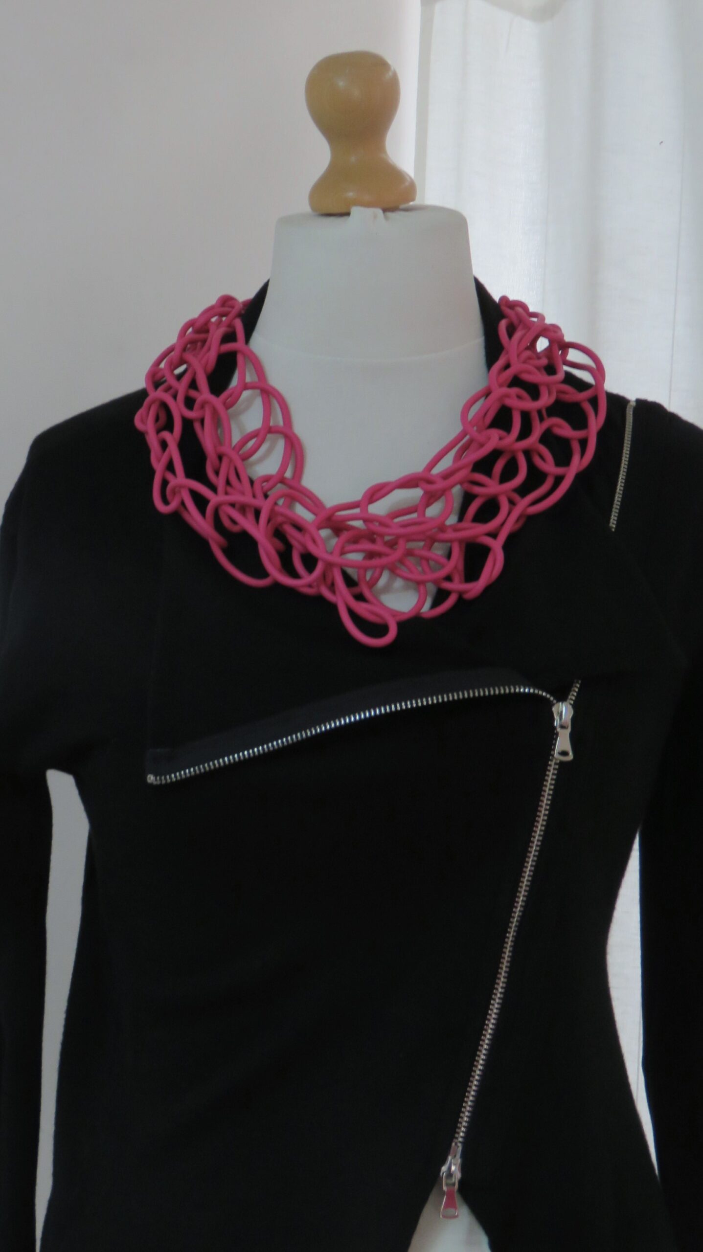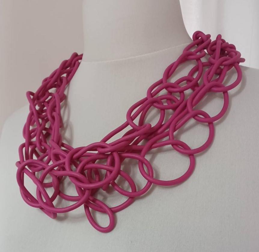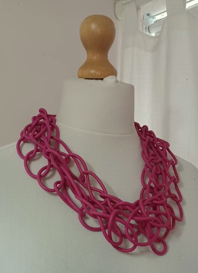 • Lagenlook statement necklace, made of 3 strands of irregular, fuchsia, rubber chain
