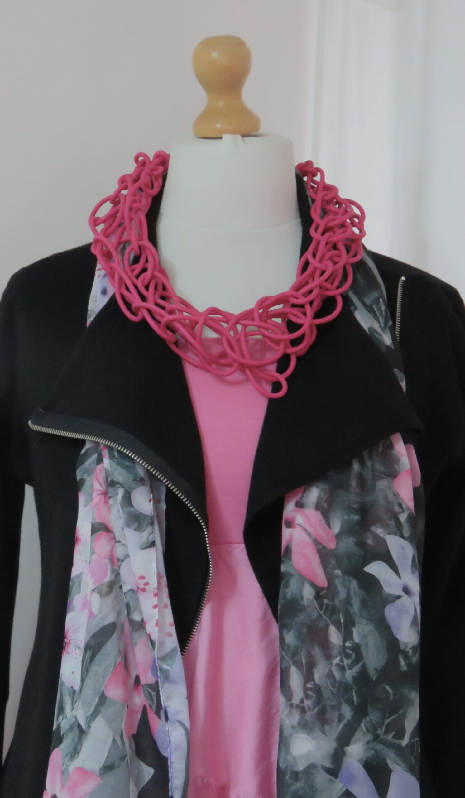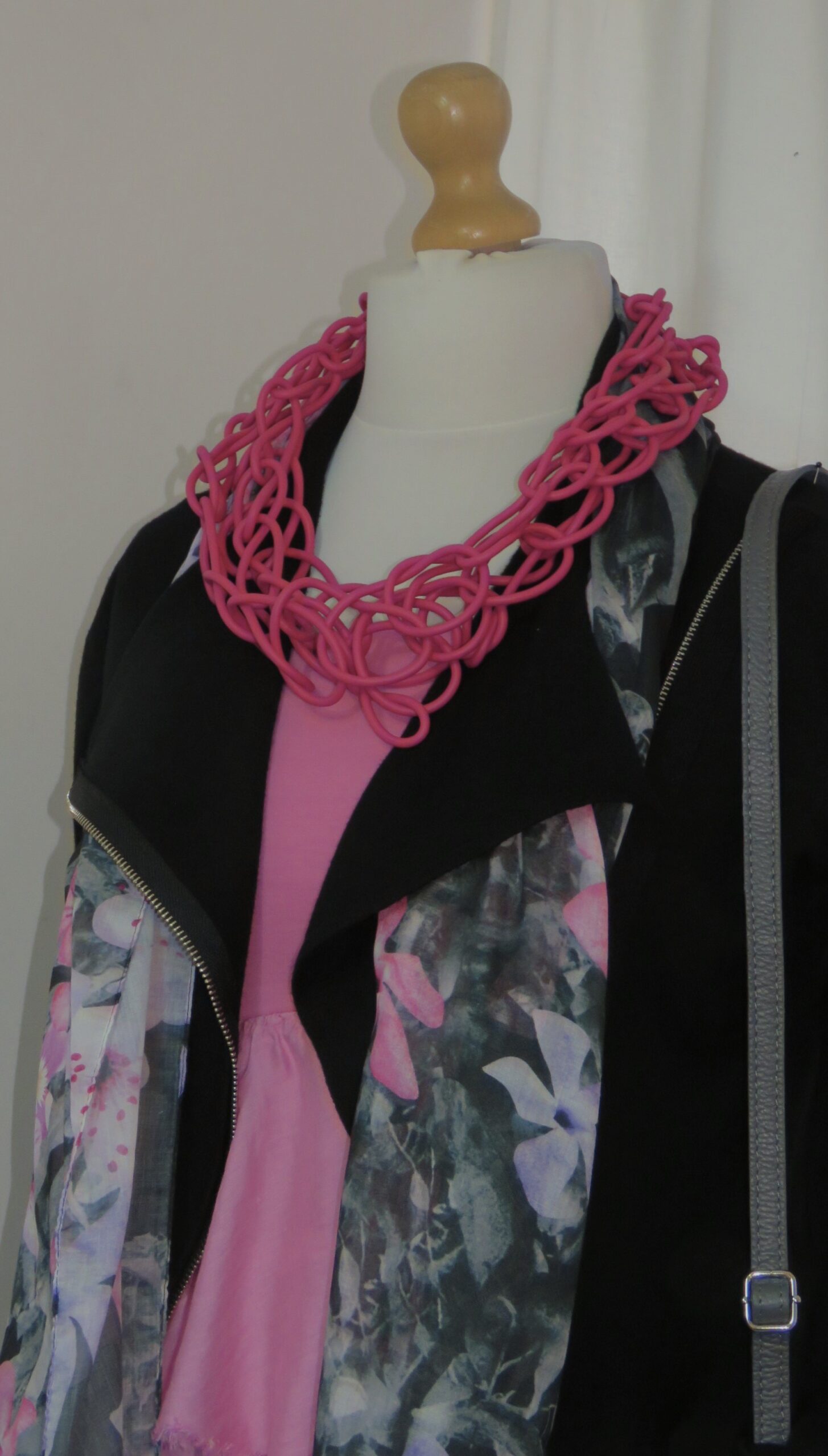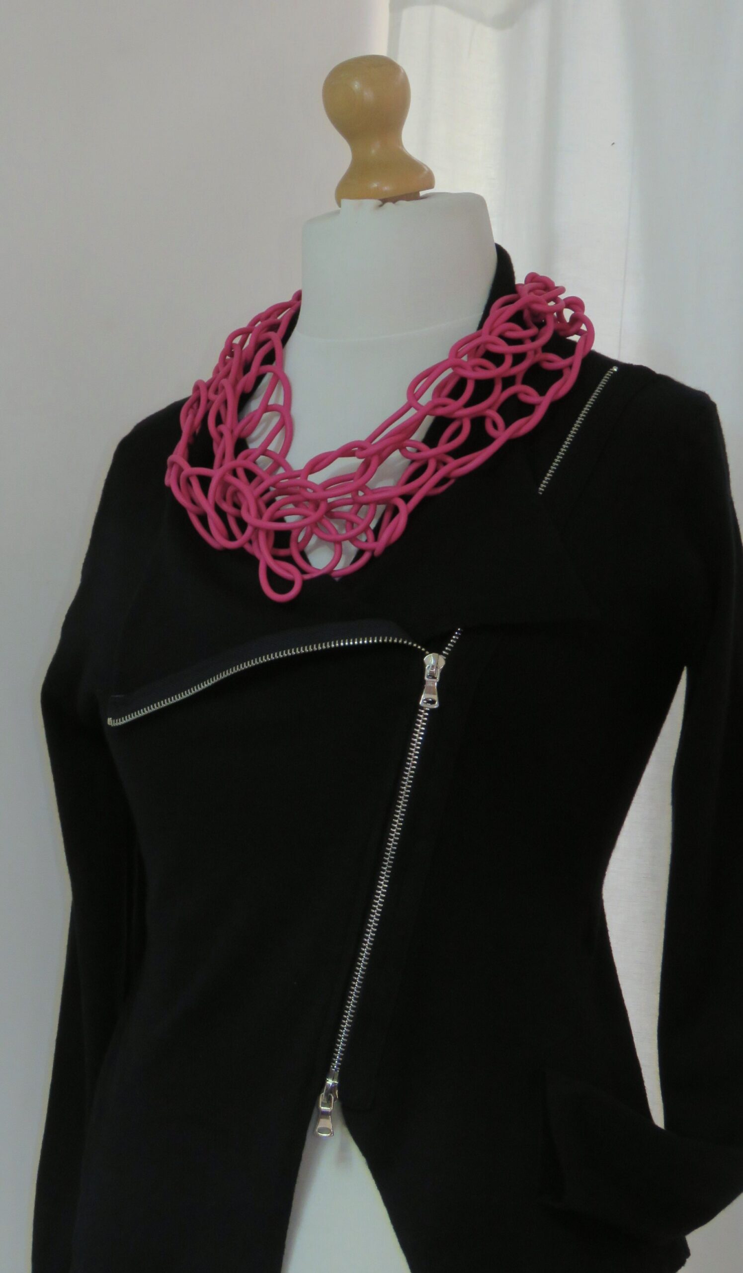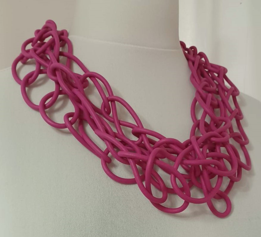 • Lagenlook statement necklace, made of 3 strands of irregular, fuchsia, rubber chain