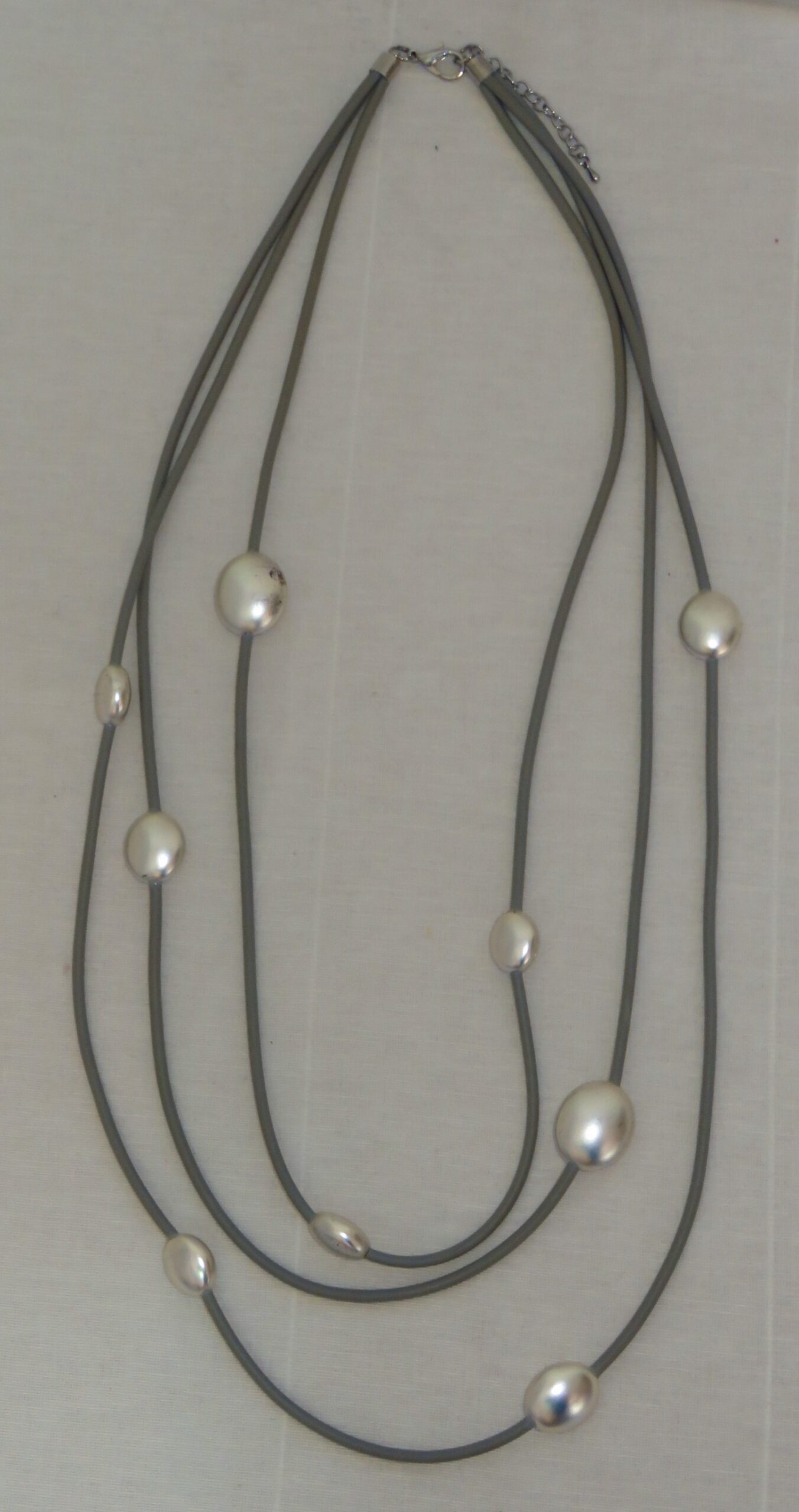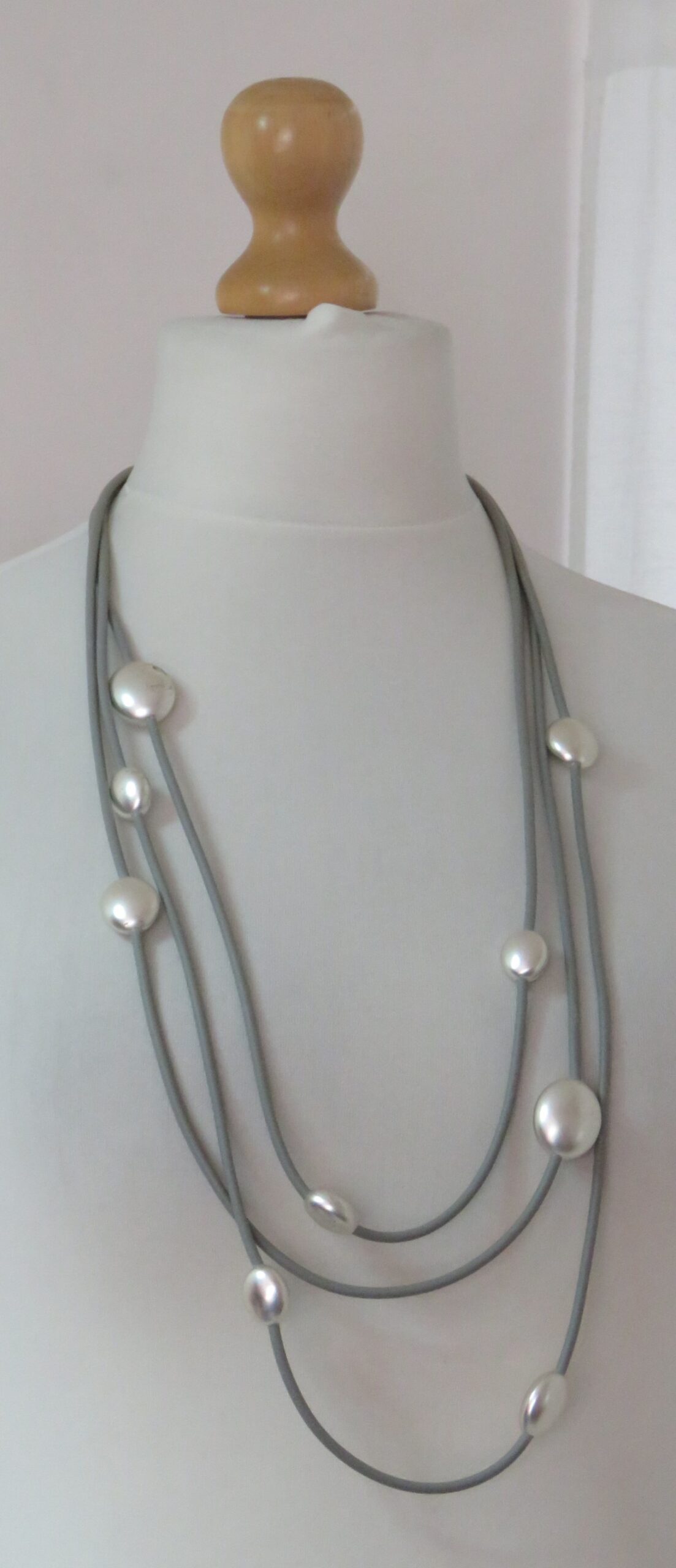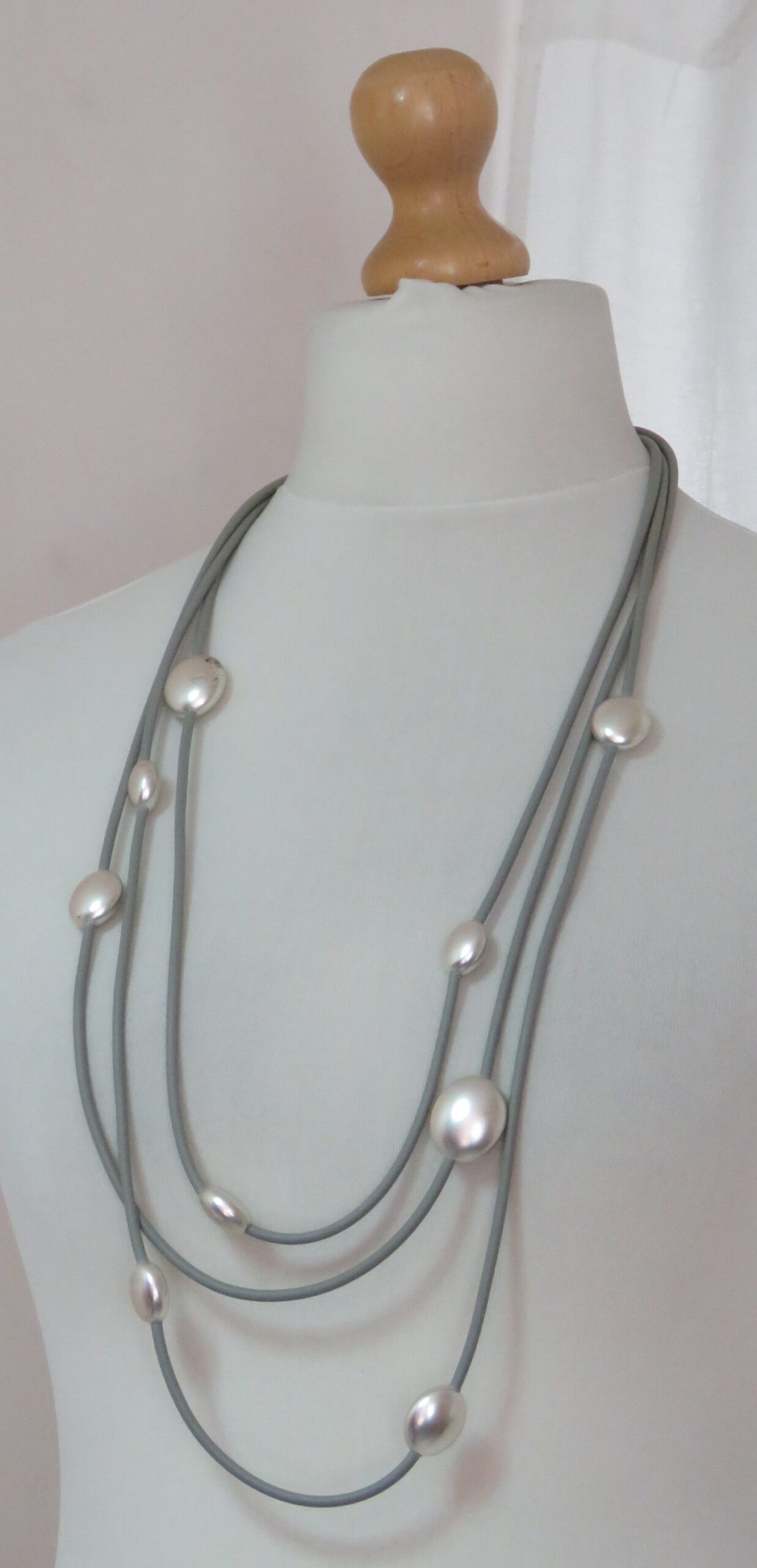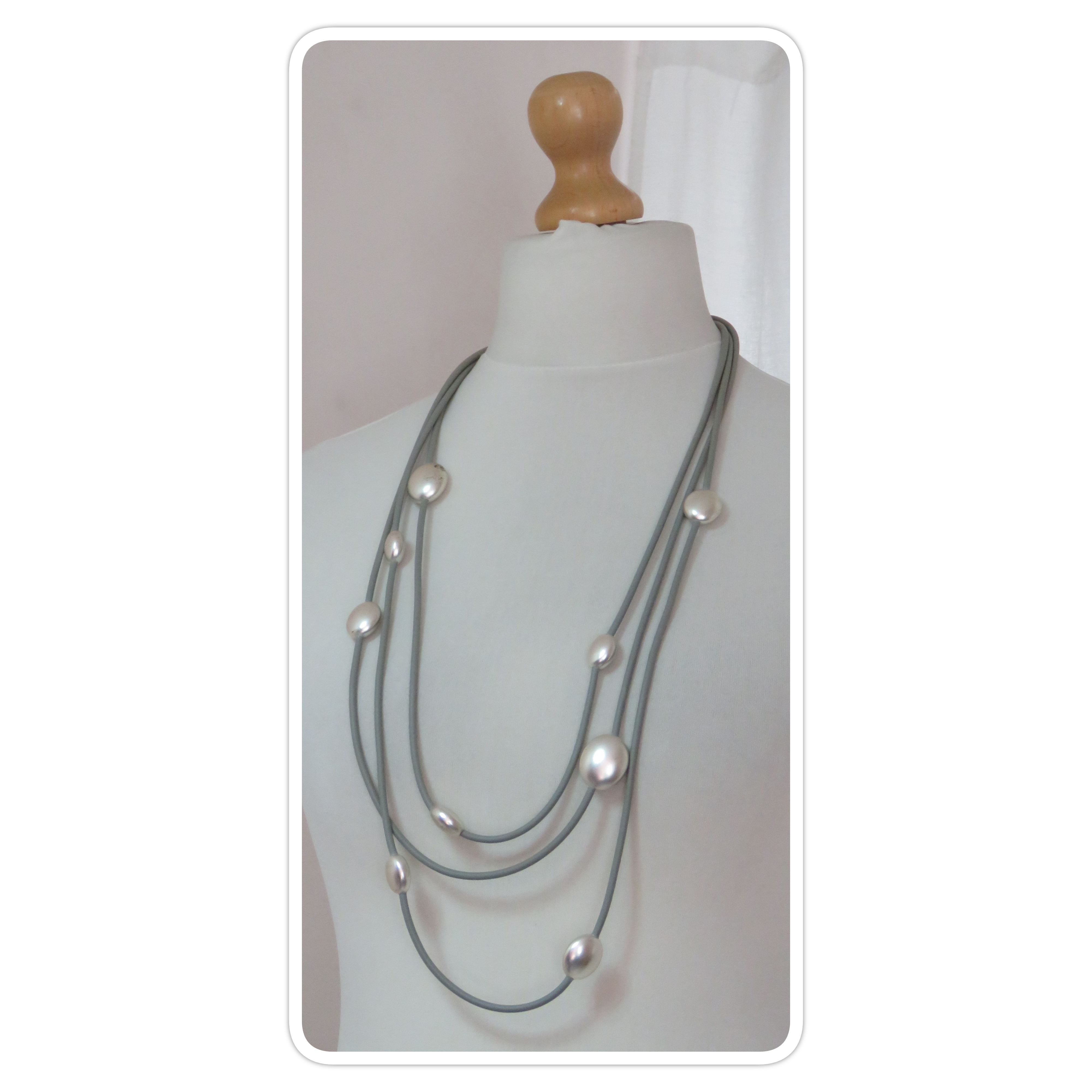 • Beautiful, Lagenlook, necklace, made from 3 strands of grey, rubber, threaded with silver-coloured beads