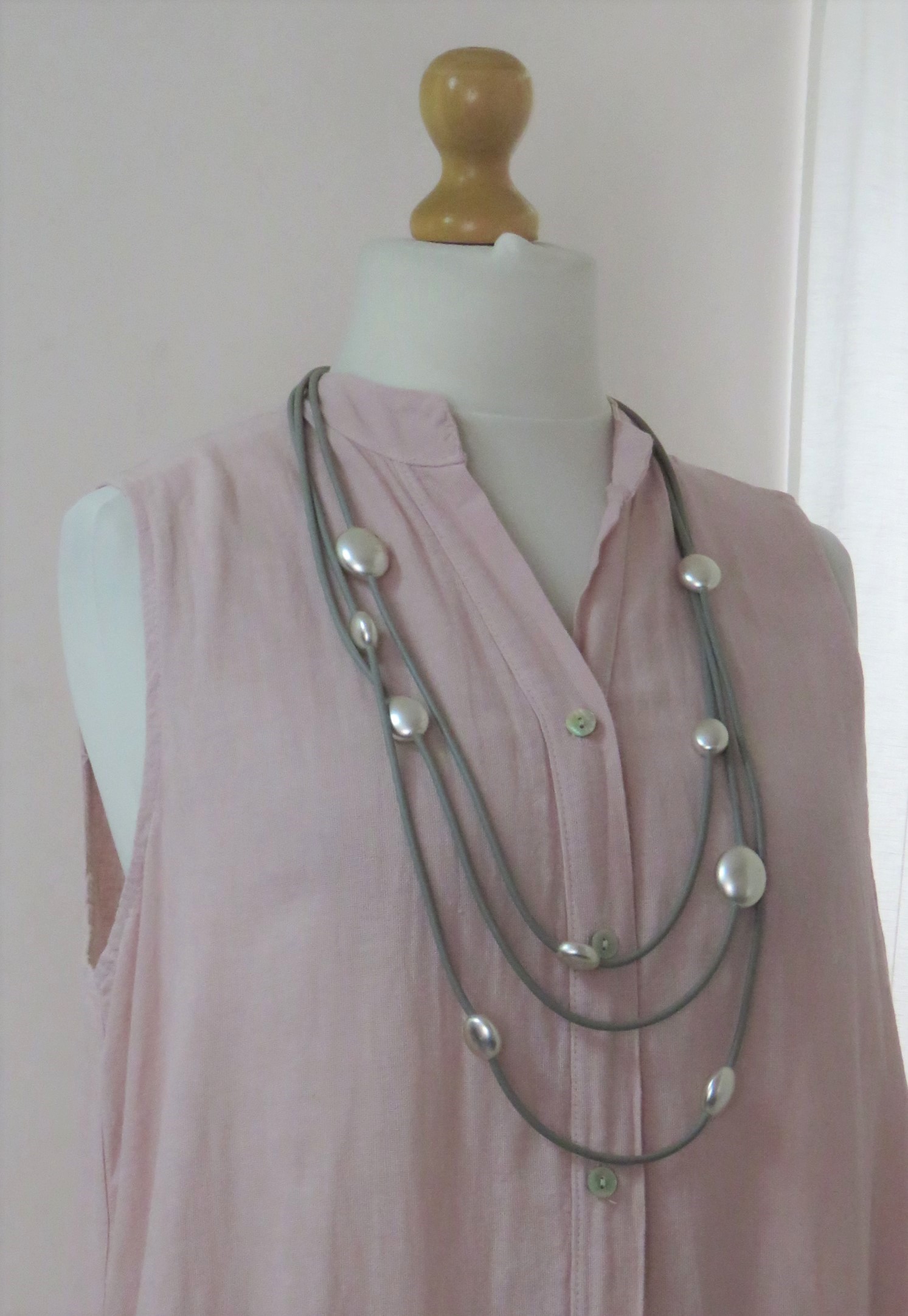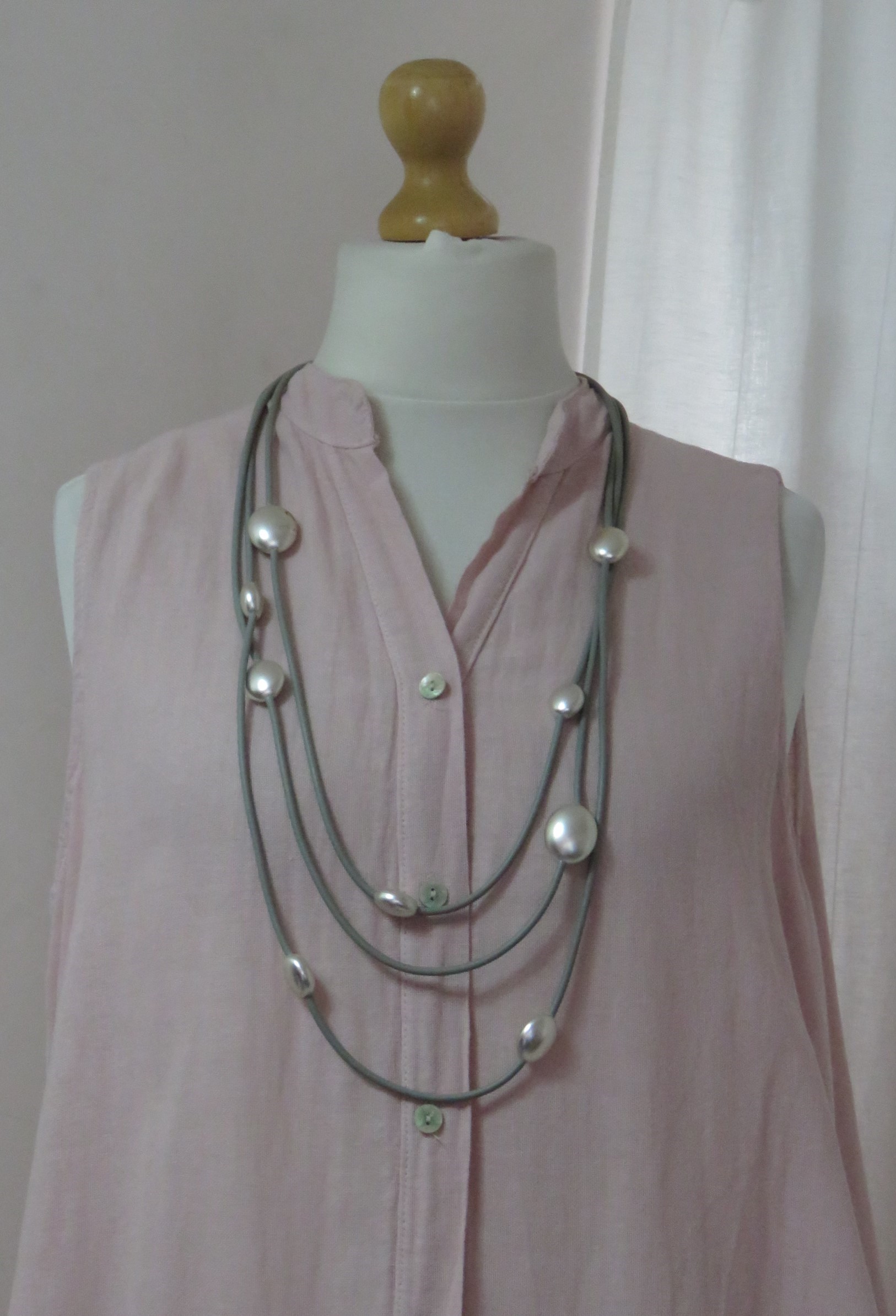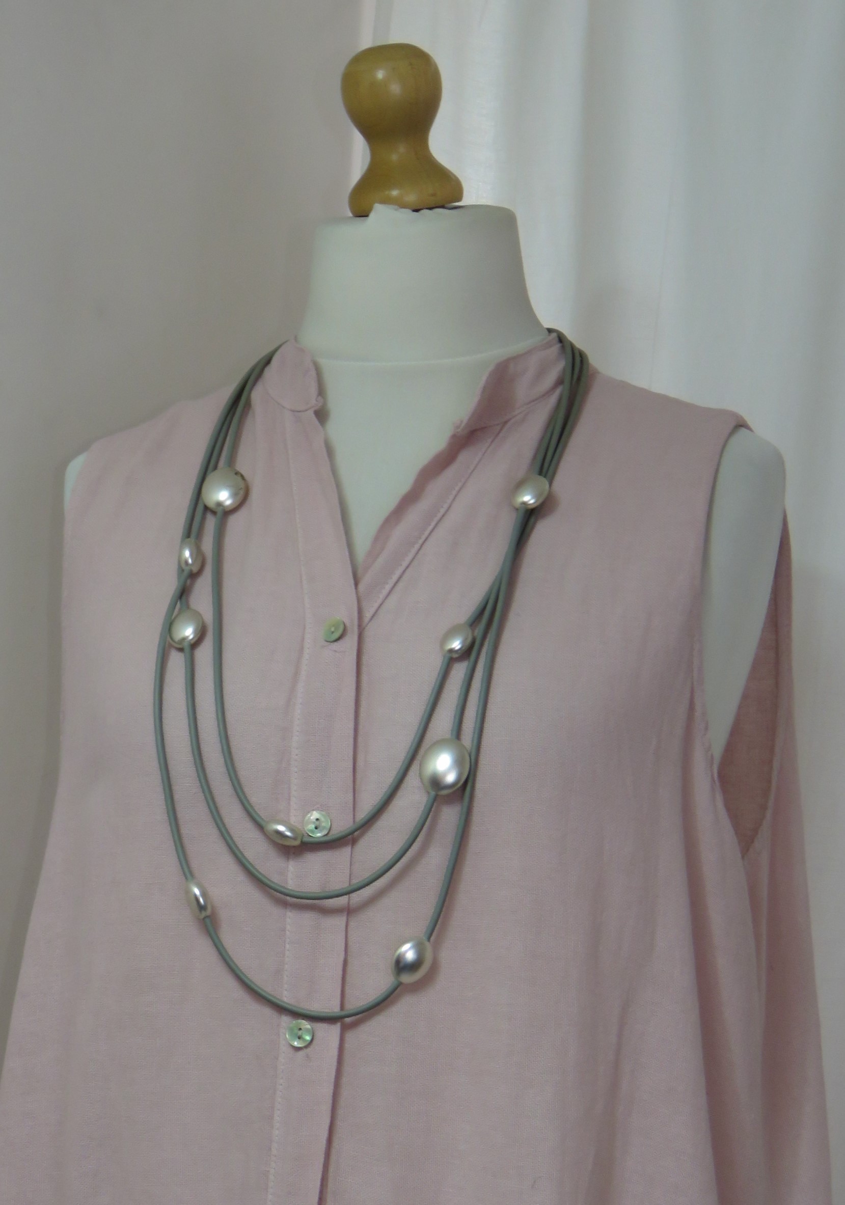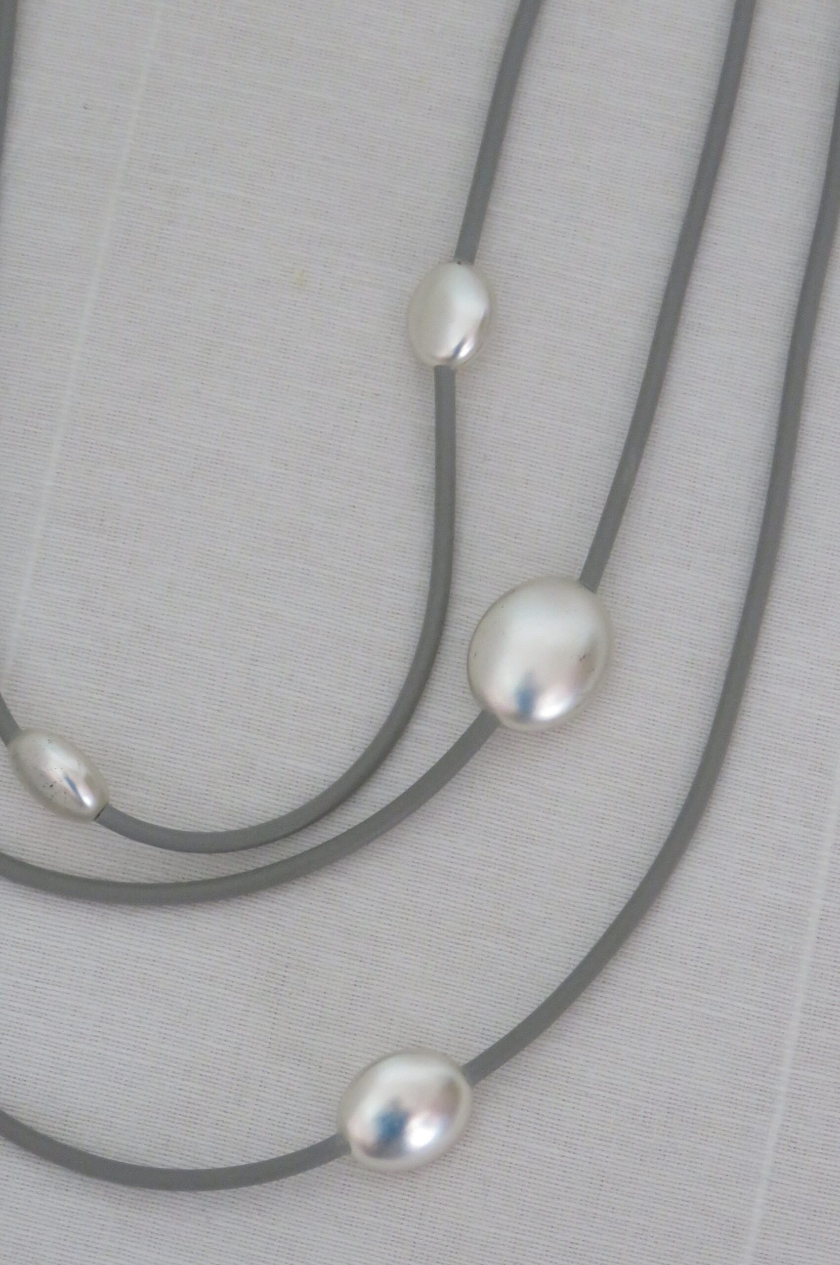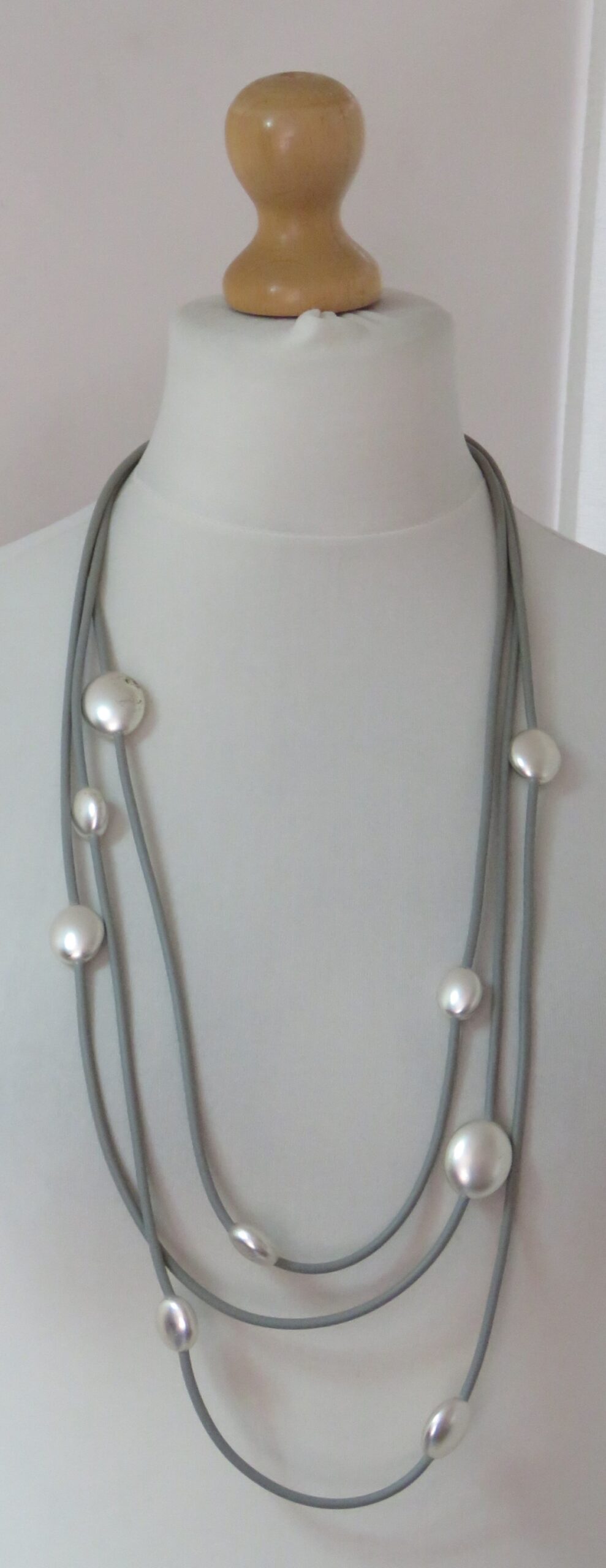 • Beautiful, Lagenlook, necklace, made from 3 strands of grey, rubber, threaded with silver-coloured beads