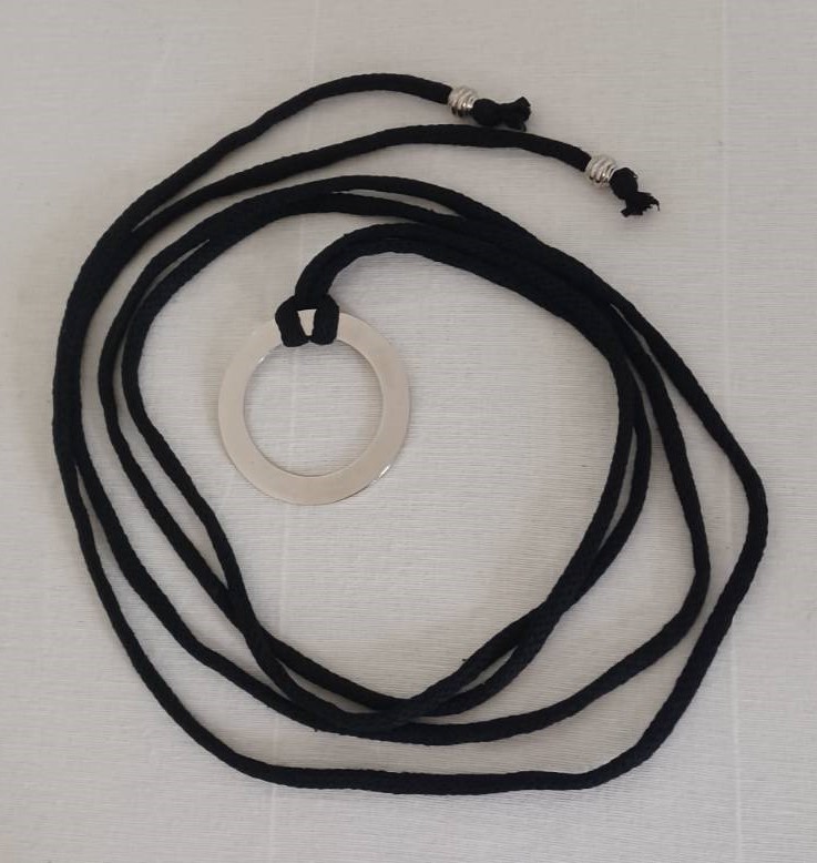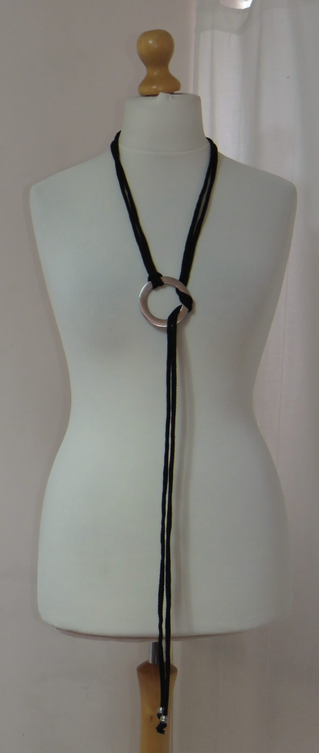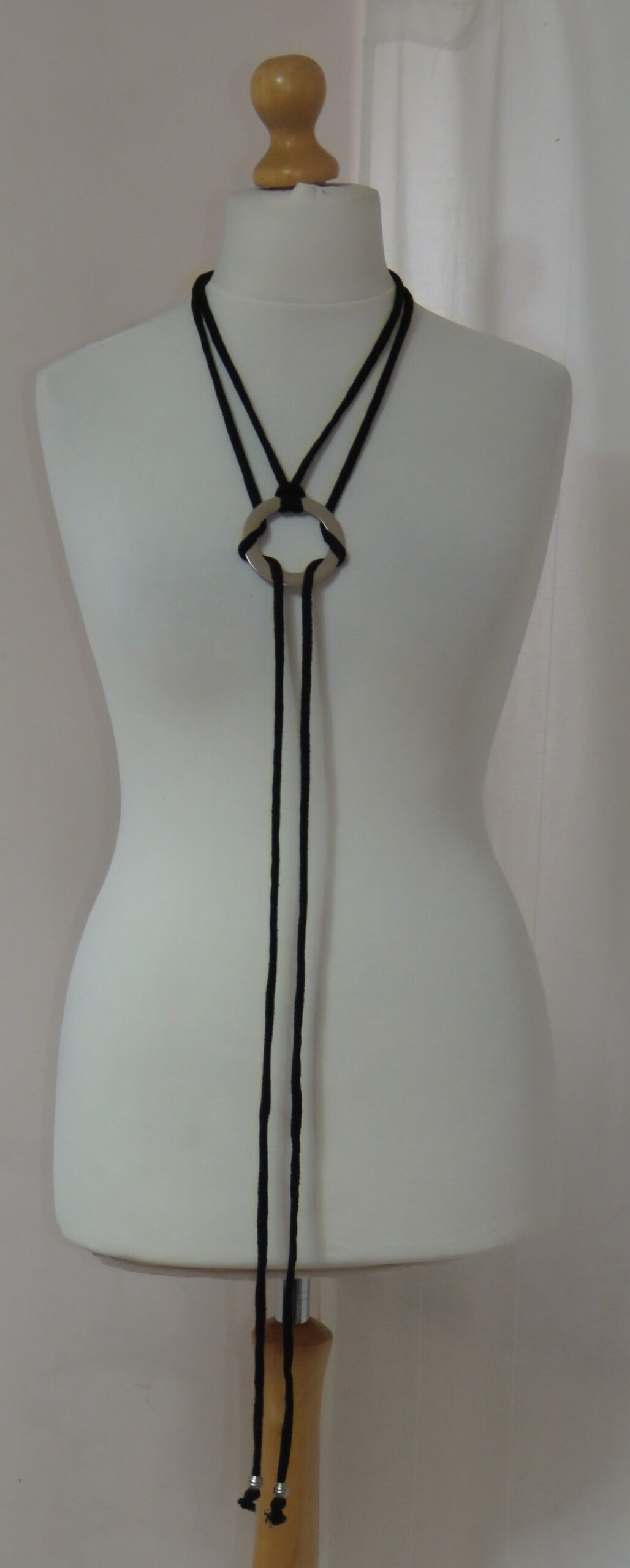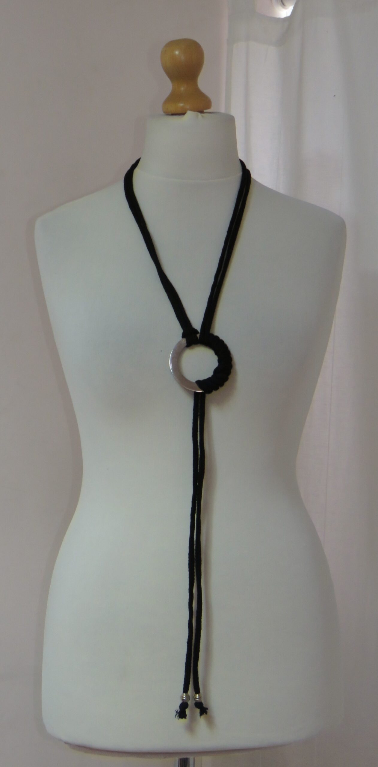 • Handmade, using black, recycled-cotton, i-cord (80% cotton/20% polyester) and a silver-coloured, metal ring