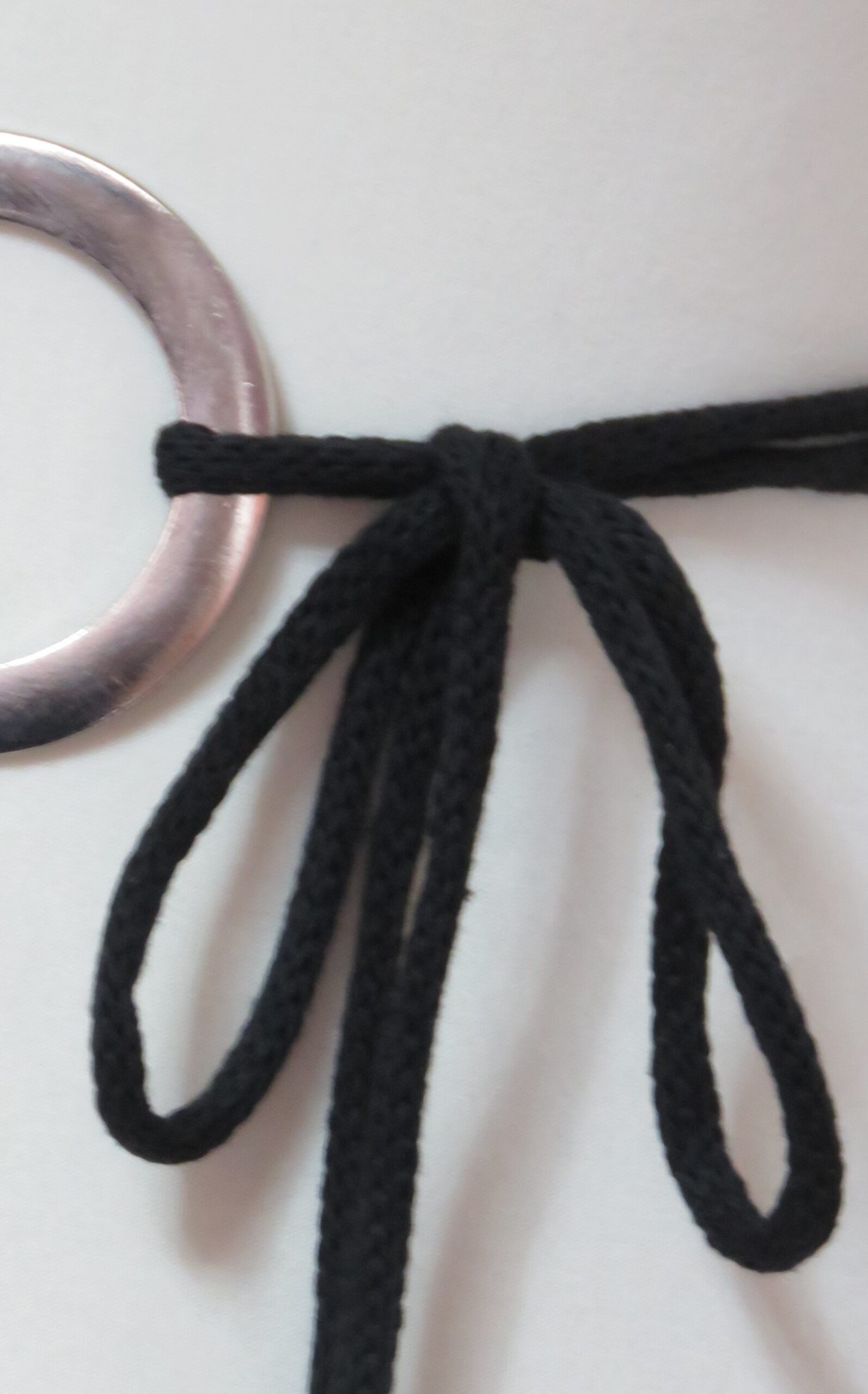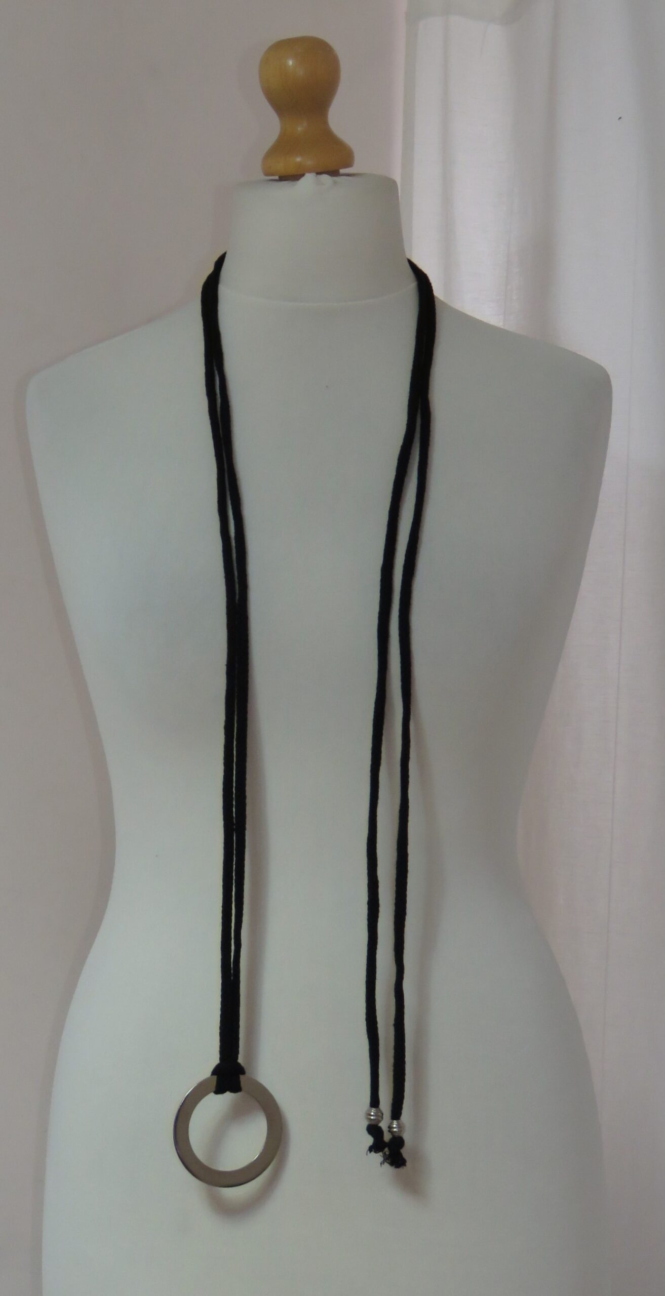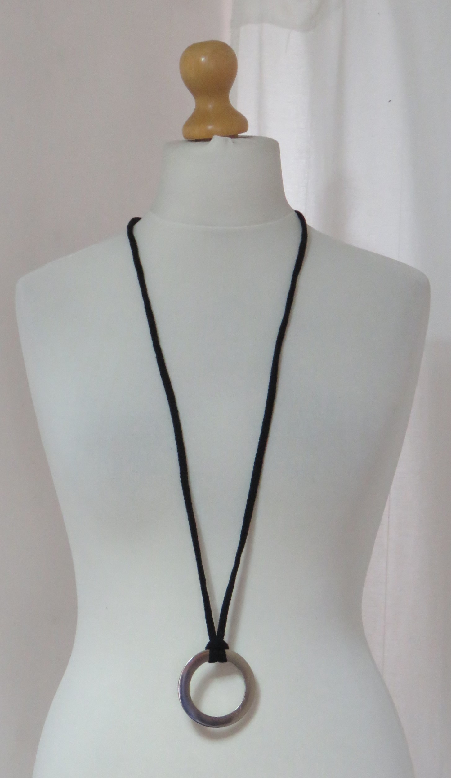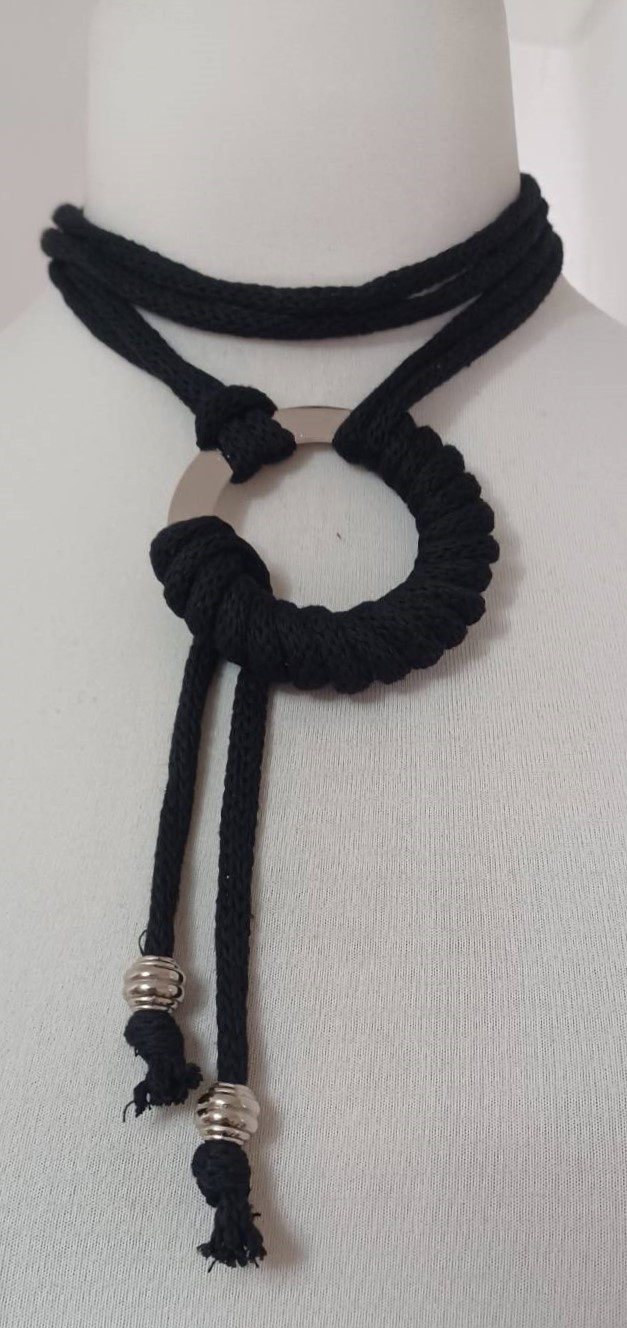 • Handmade, using black, recycled-cotton, i-cord (80% cotton/20% polyester) and a silver-coloured, metal ring