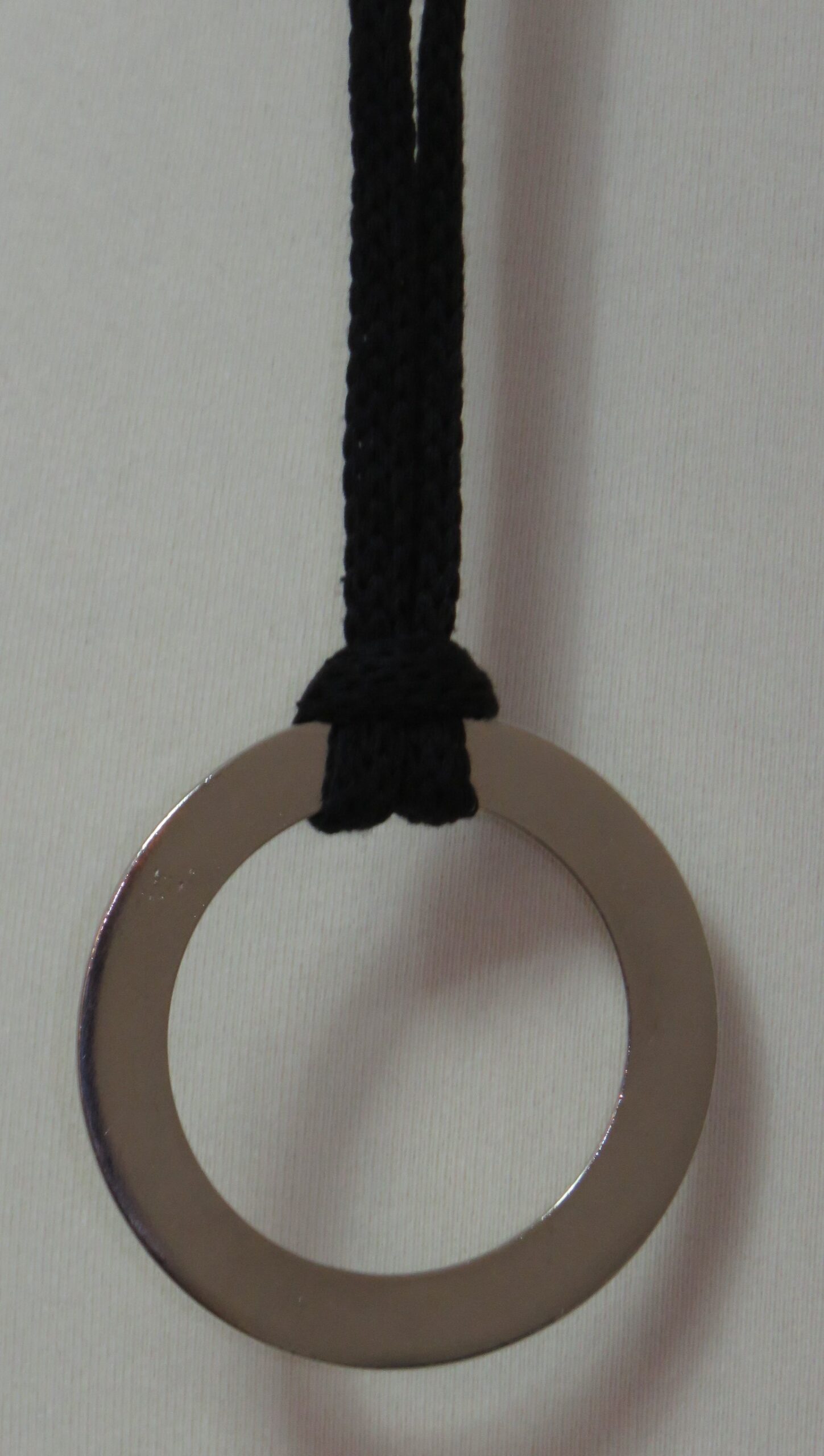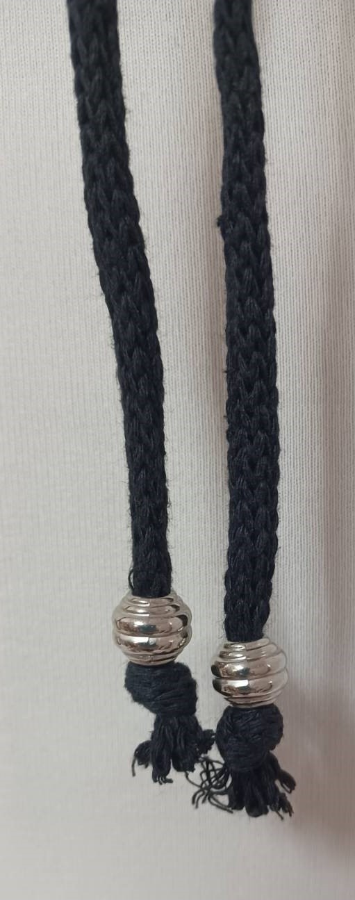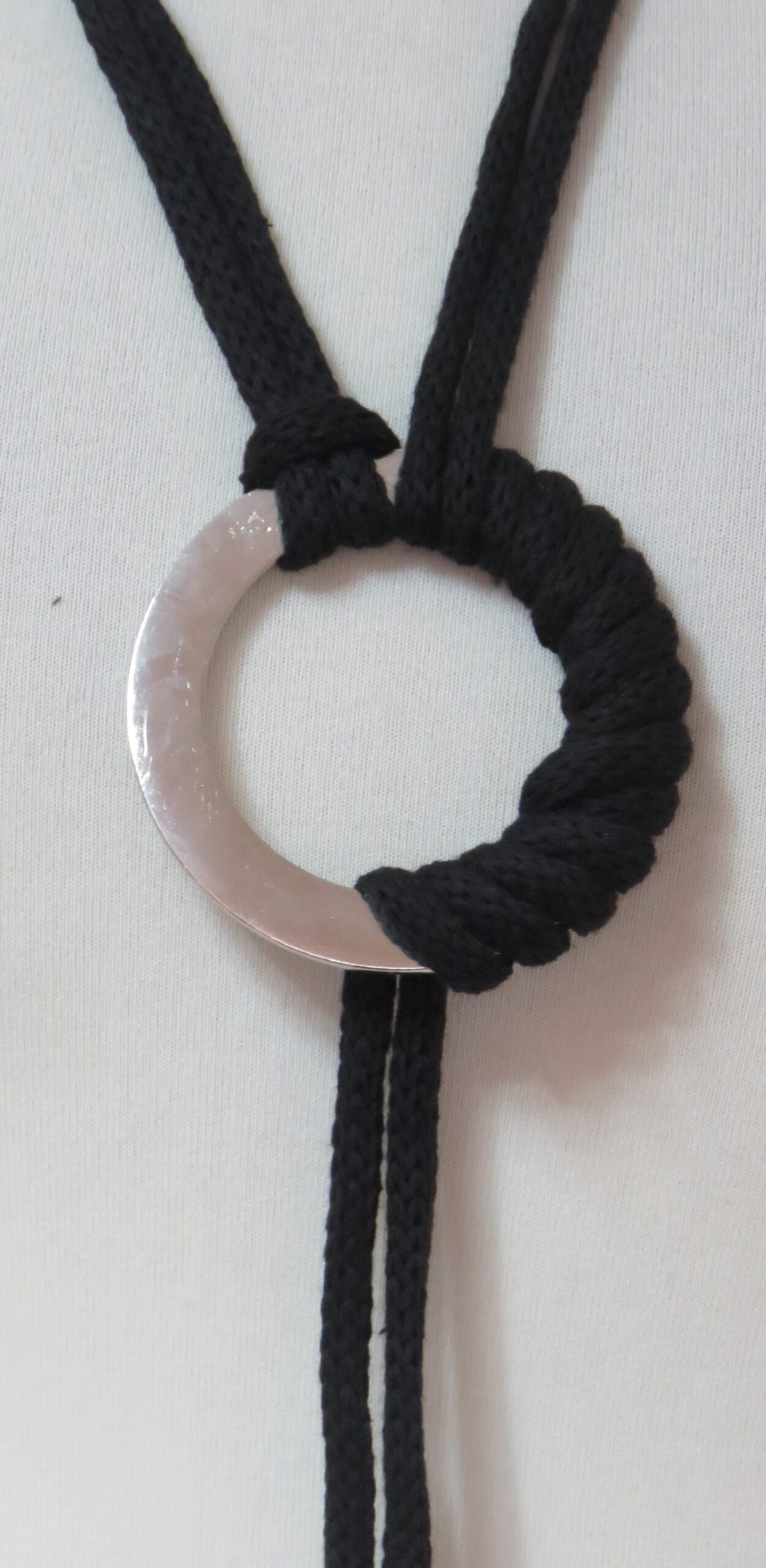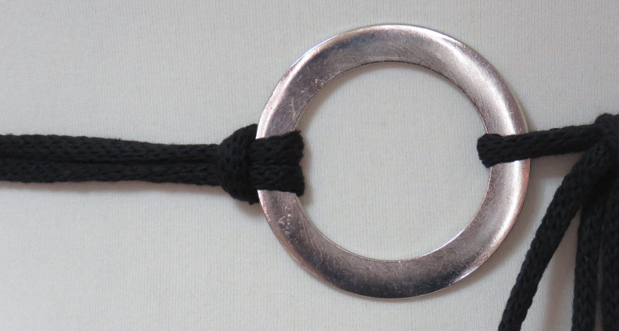 • Handmade, using black, recycled-cotton, i-cord (80% cotton/20% polyester) and a silver-coloured, metal ring