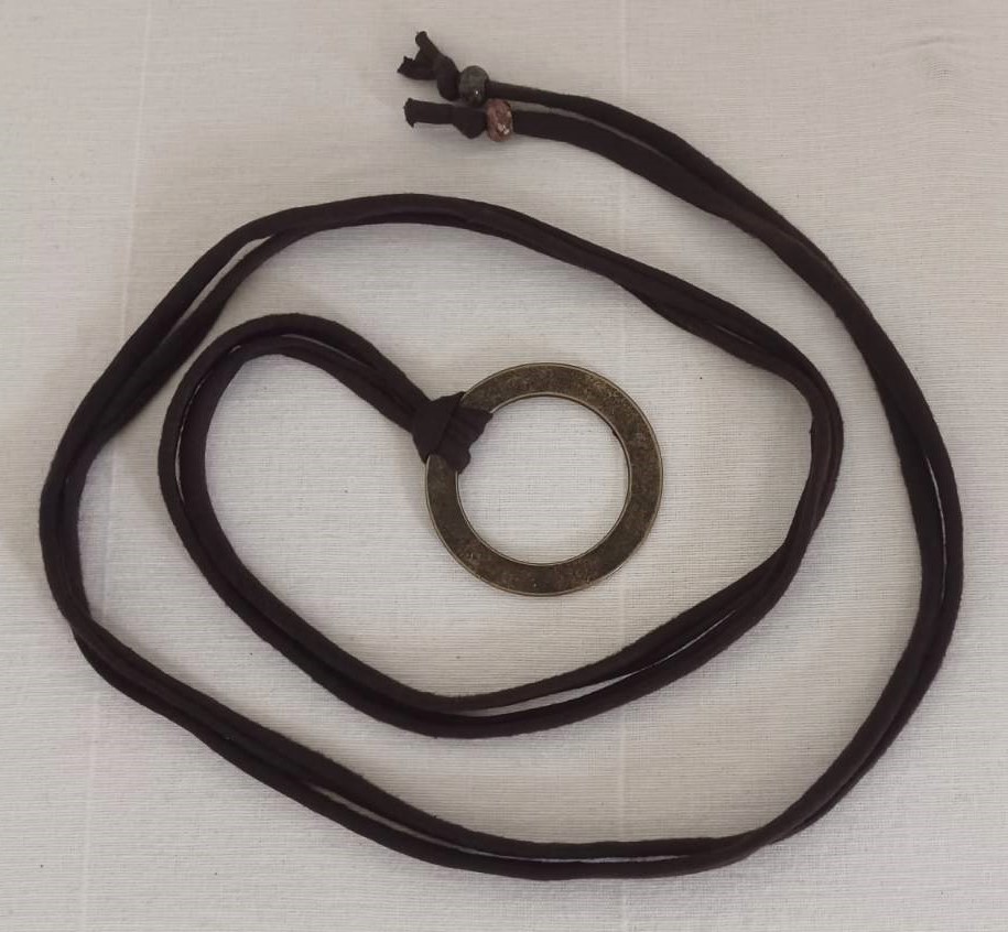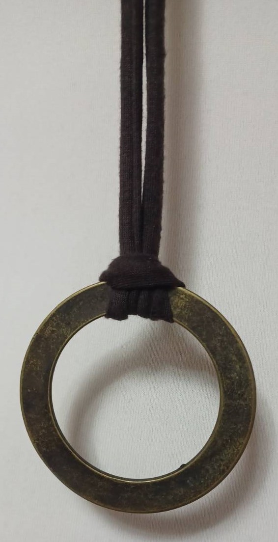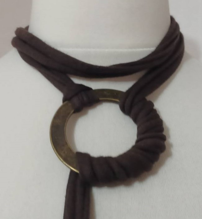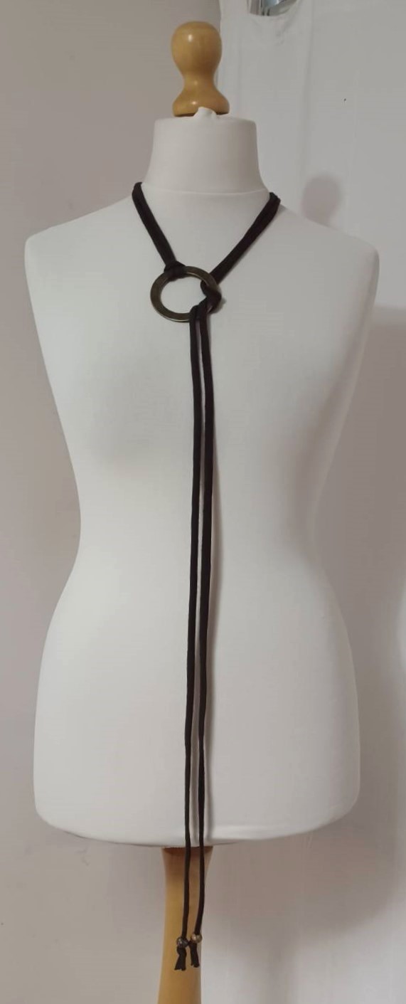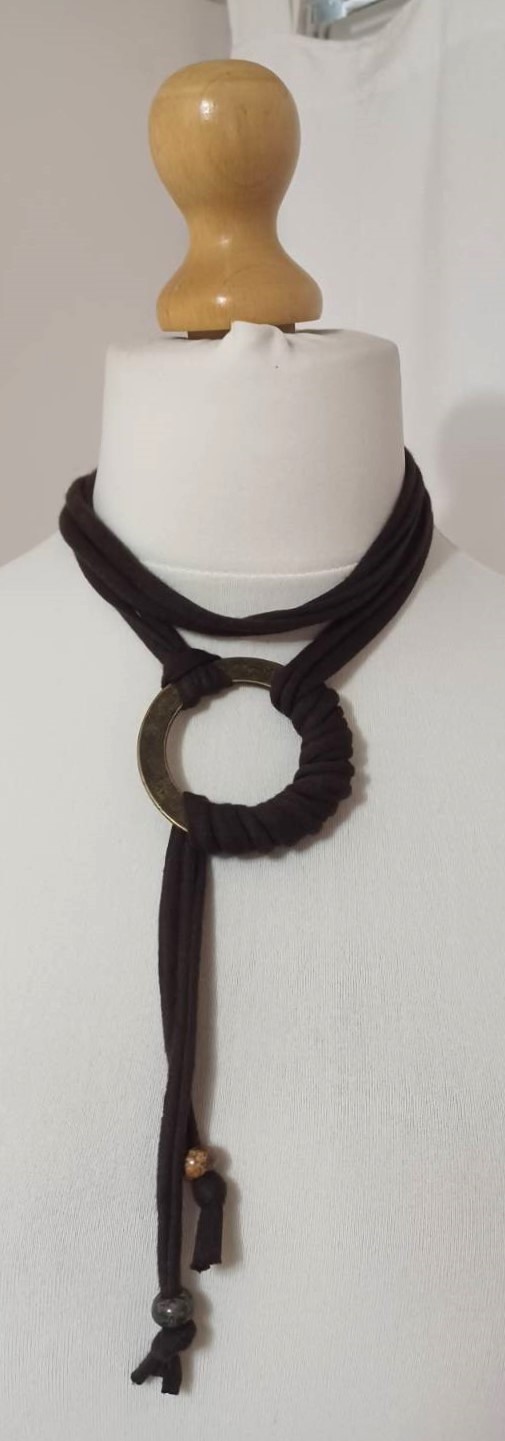 - Handmade, using brown, t-shirt yarn and a distressed, bronze-coloured, metal ring