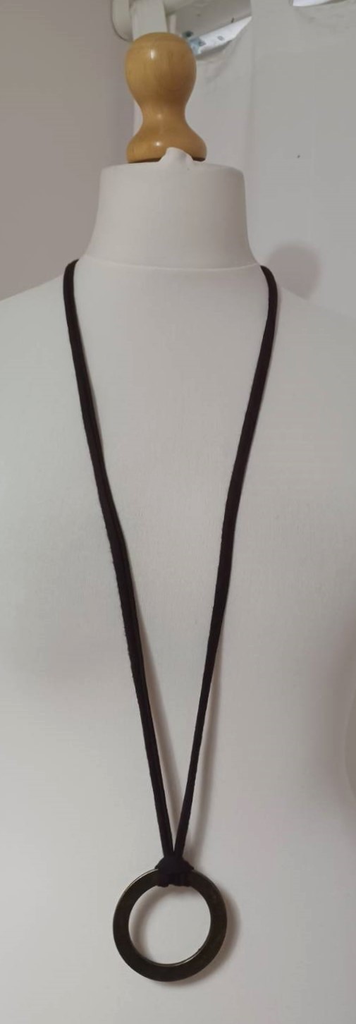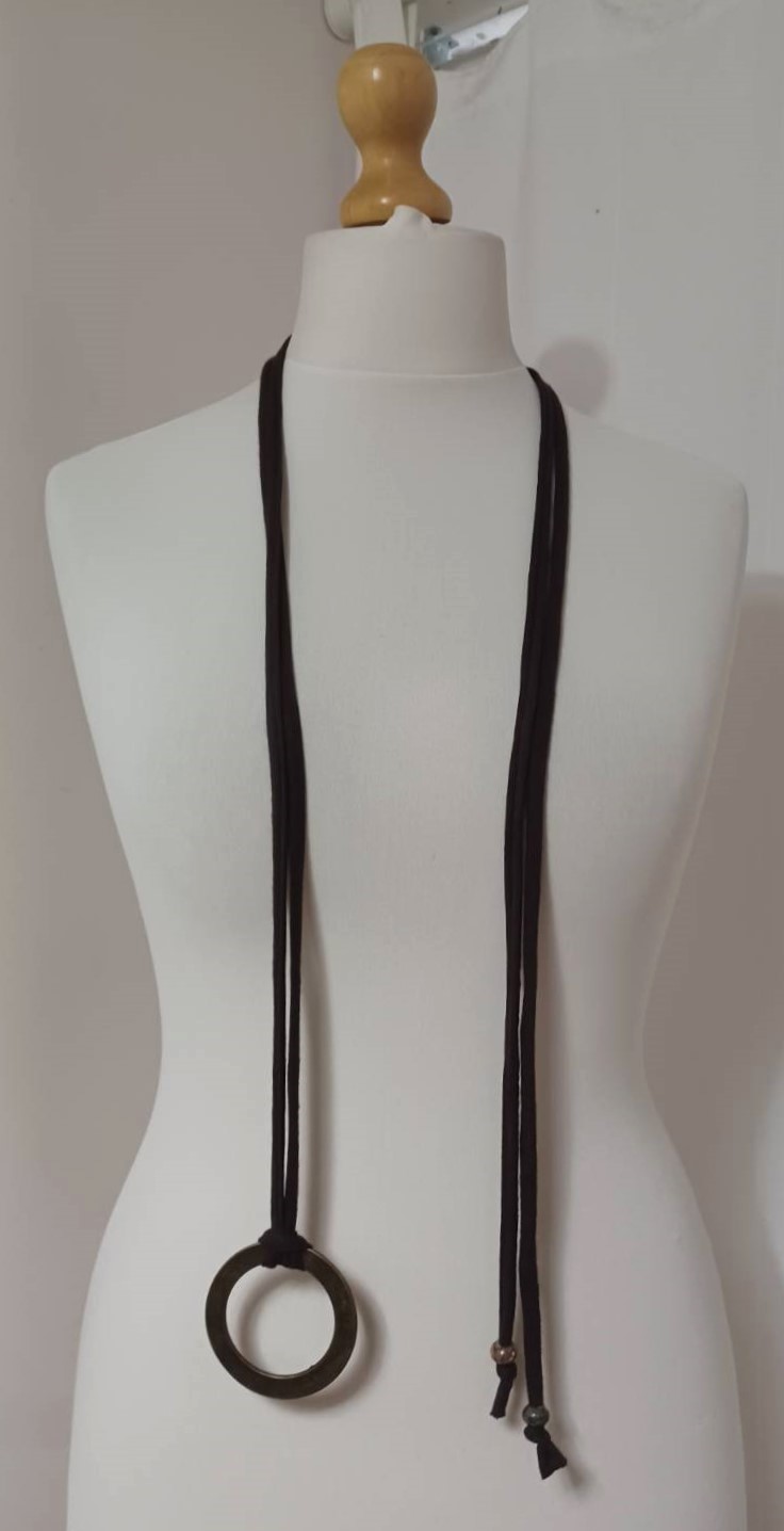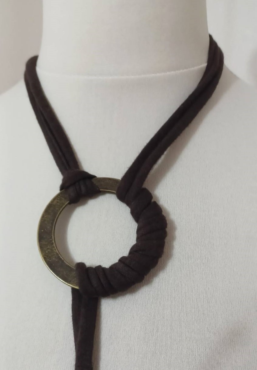 - Handmade, using brown, t-shirt yarn and a distressed, bronze-coloured, metal ring