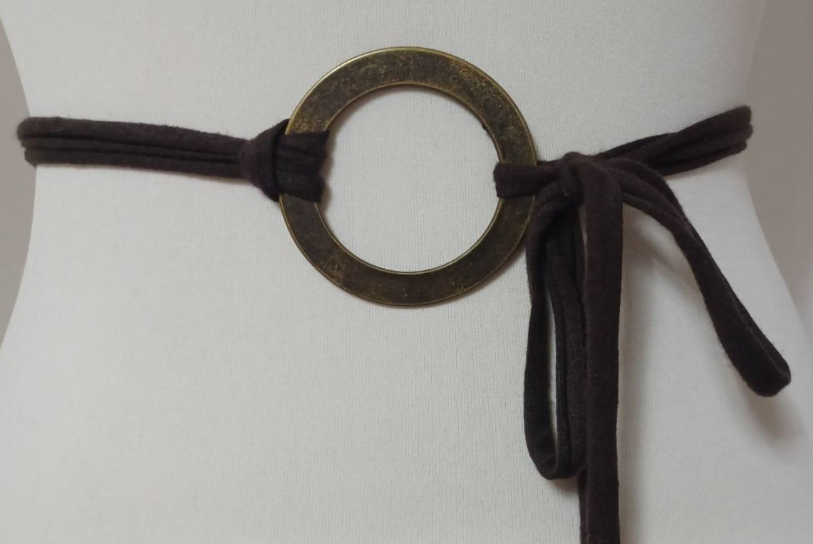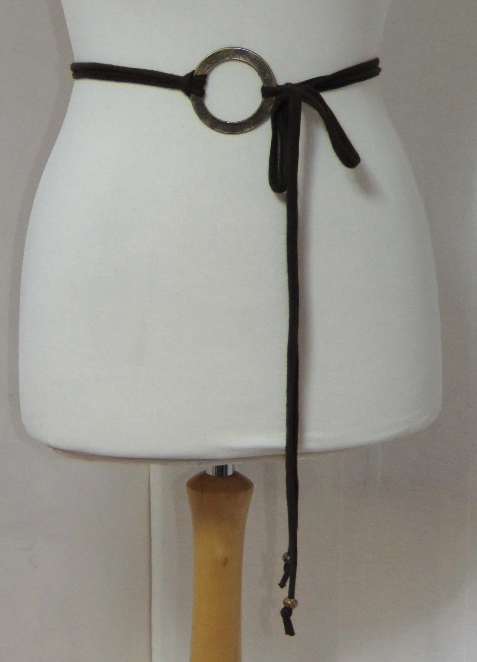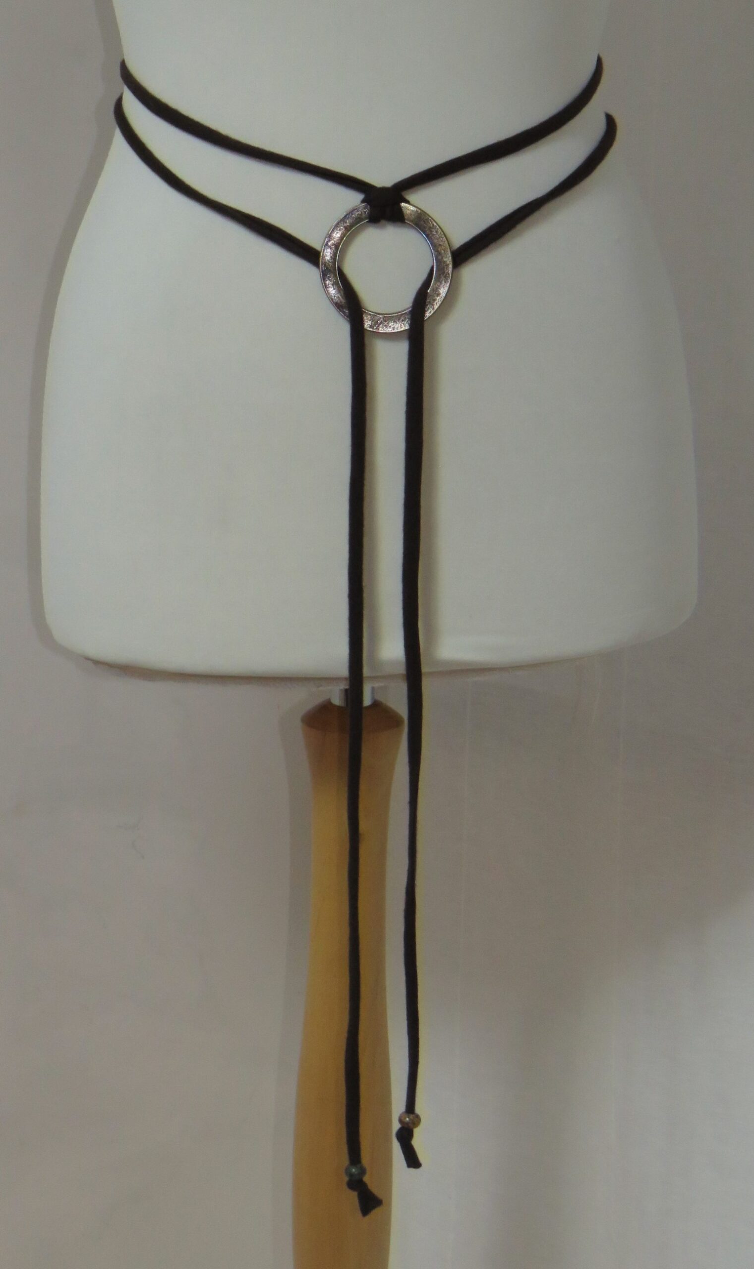 - Lariat style – you simply wrap it around the waist, thread through the ring and tie