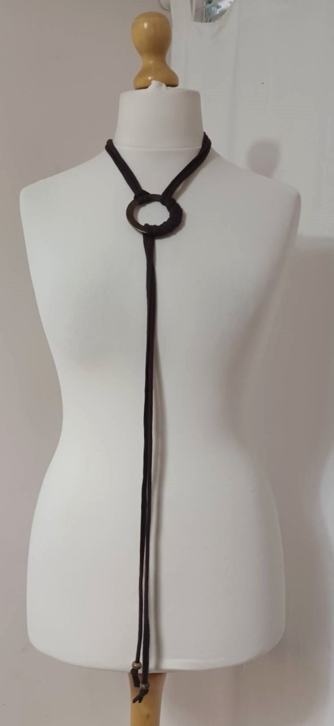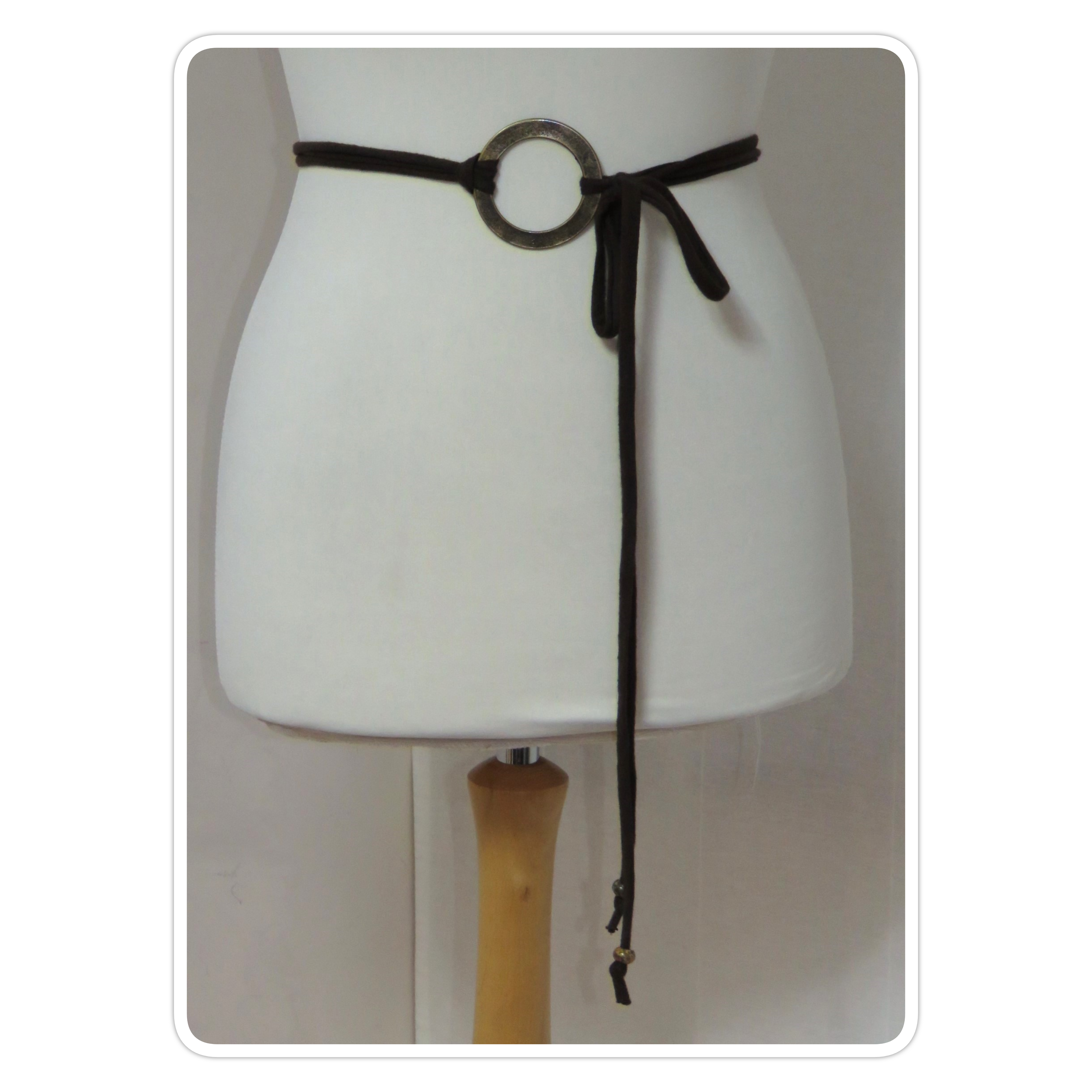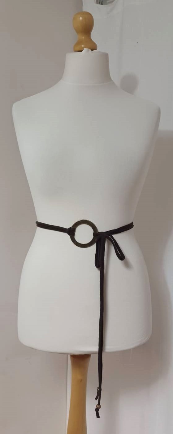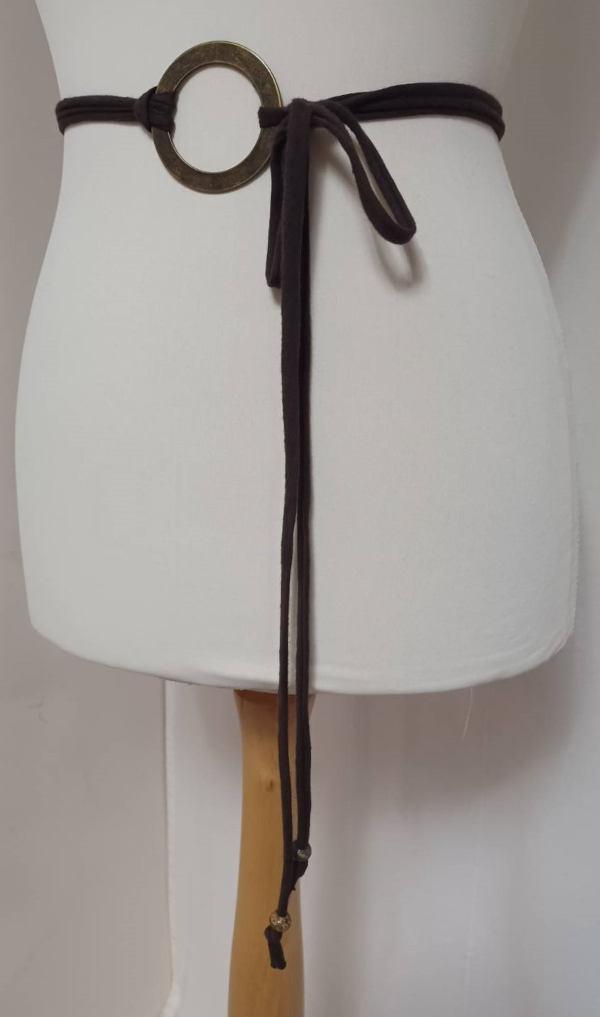 - Lariat style – you simply wrap it around the waist, thread through the ring and tie