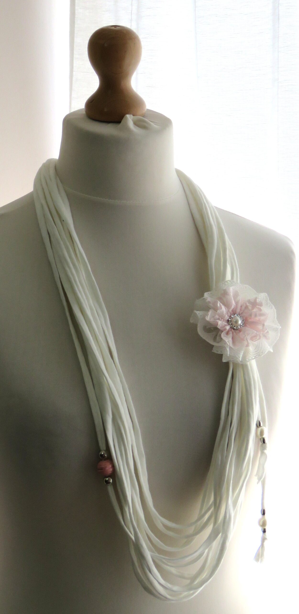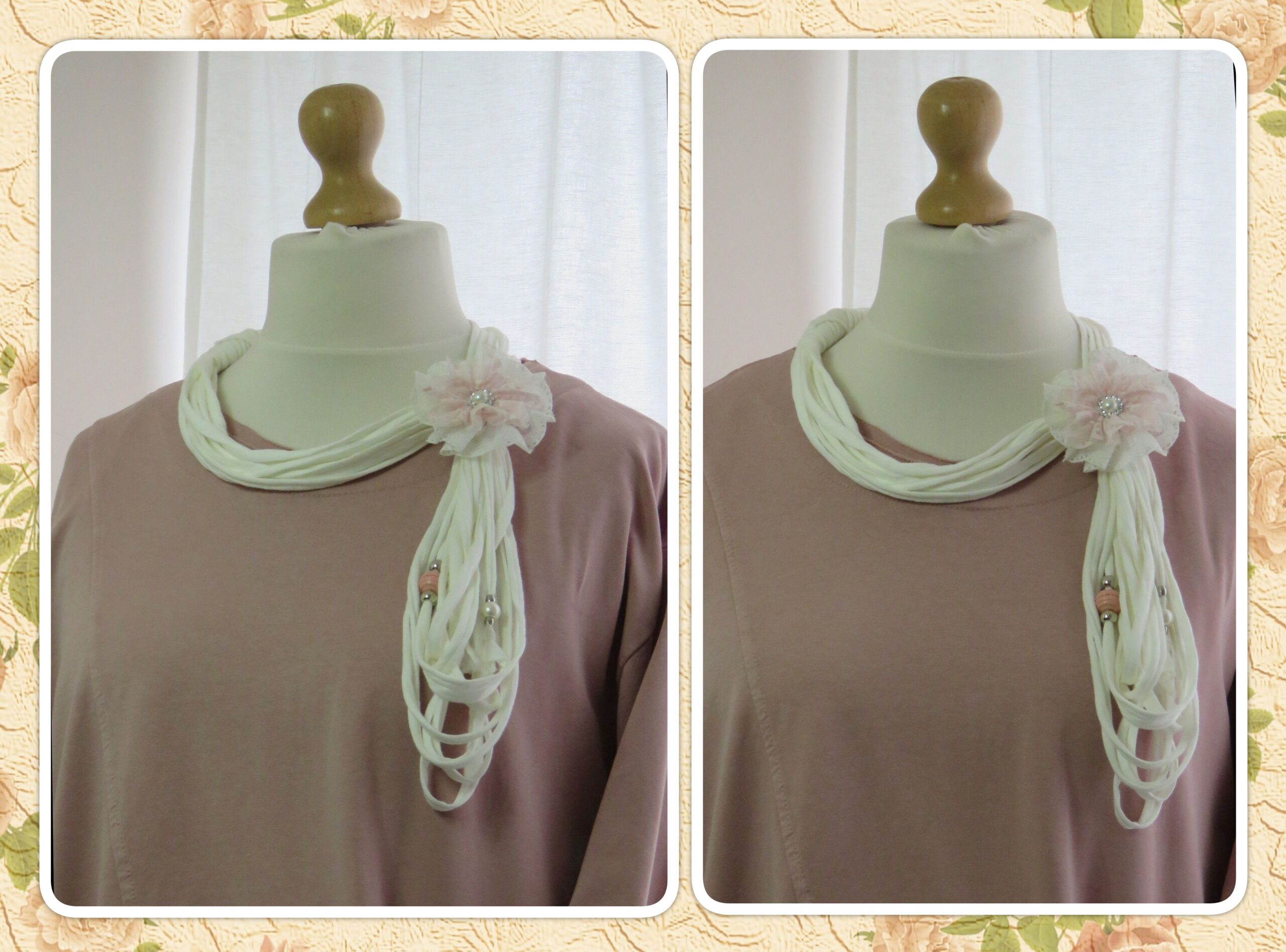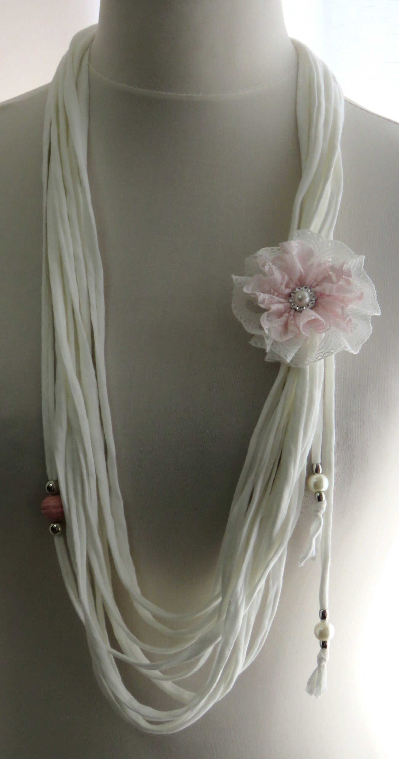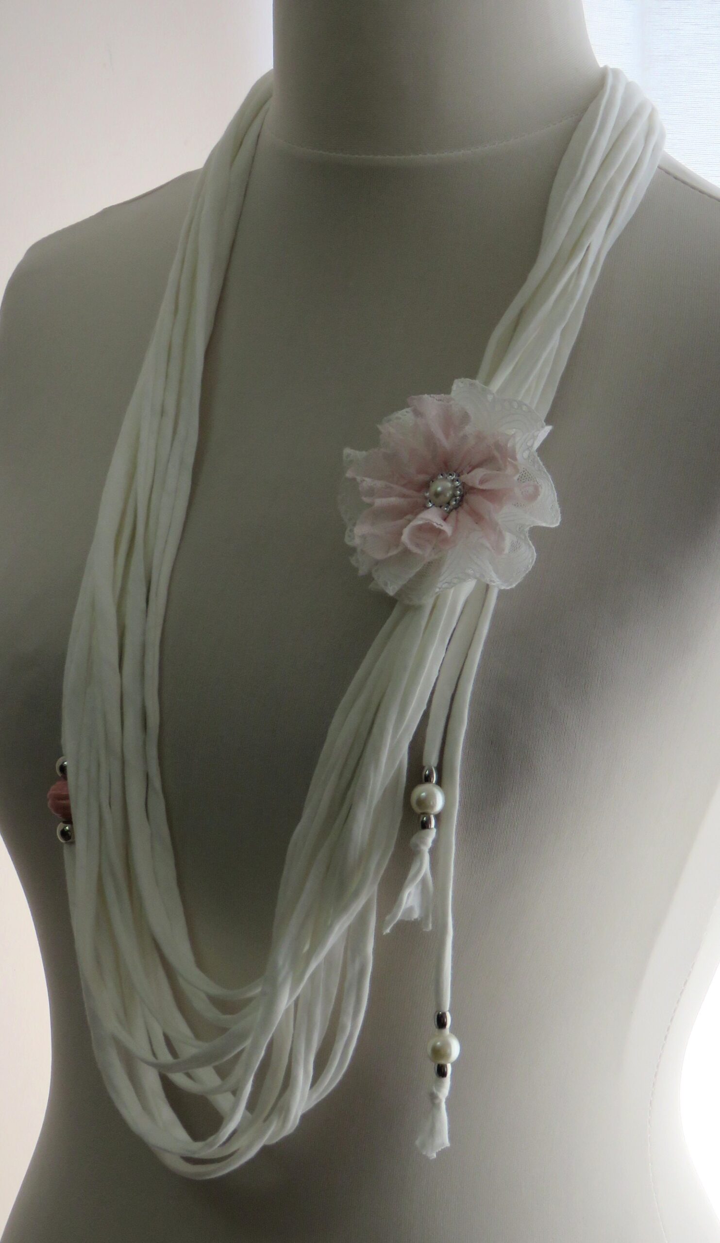 - Comes with a loose strand of the yarn, with faux-pearls and silver-coloured beads on the ends, and a “flower” brooch, made of pale pink and cream lace – these can either be simply attached to the necklace or be used to fasten the necklace in different ways