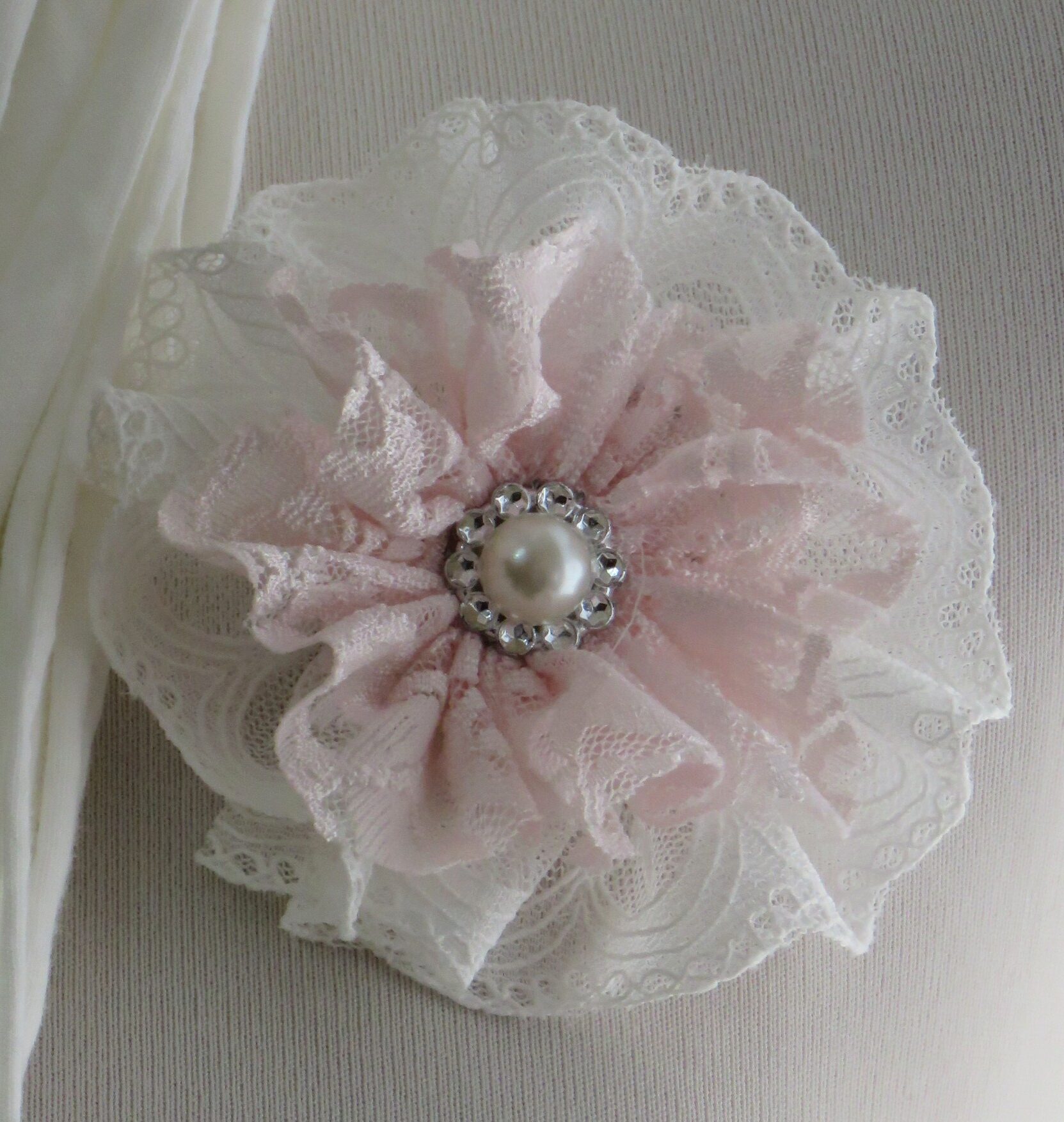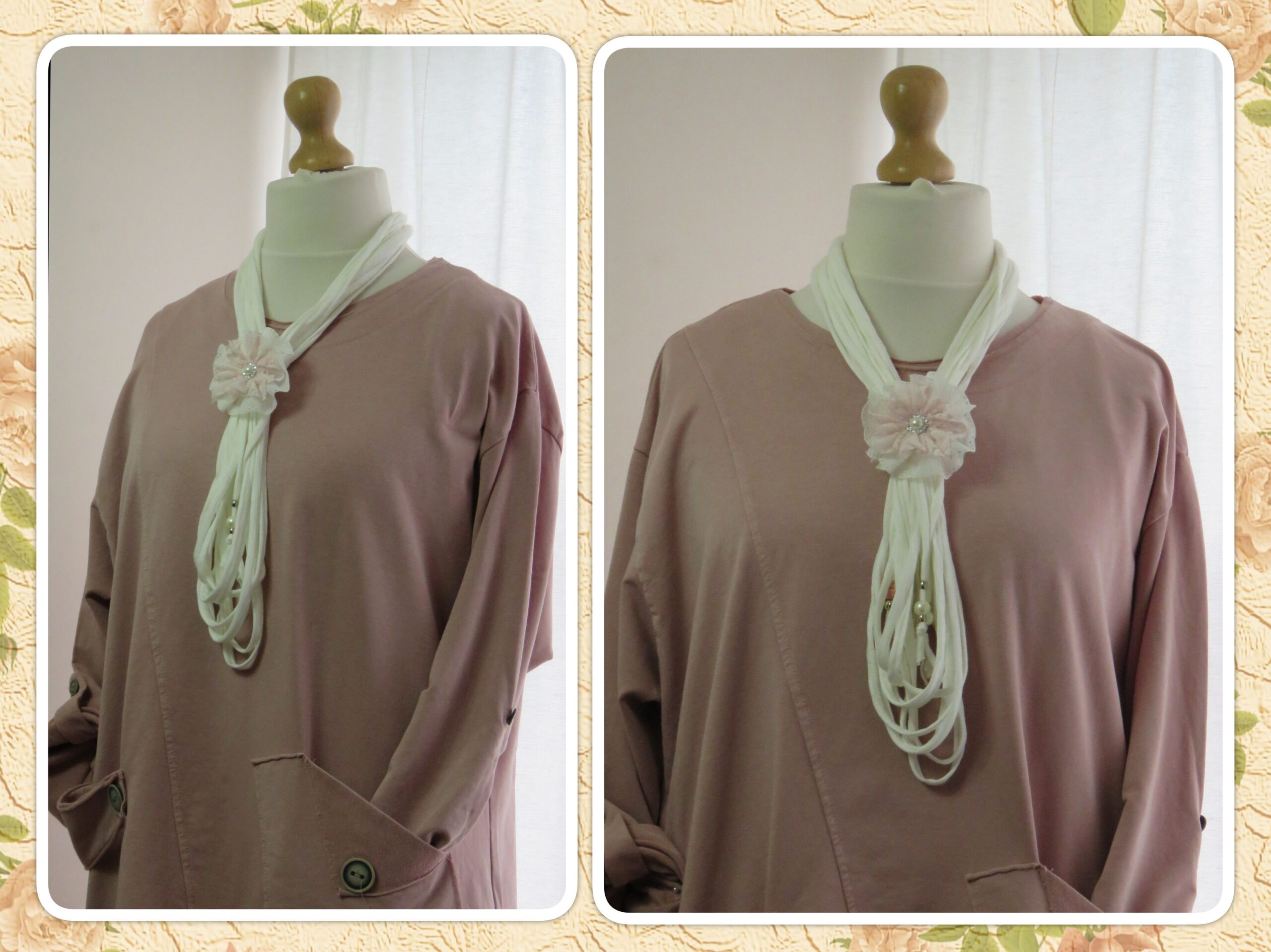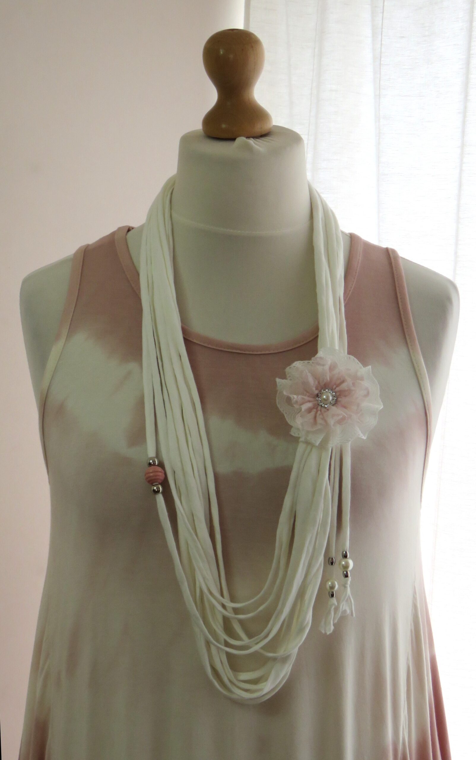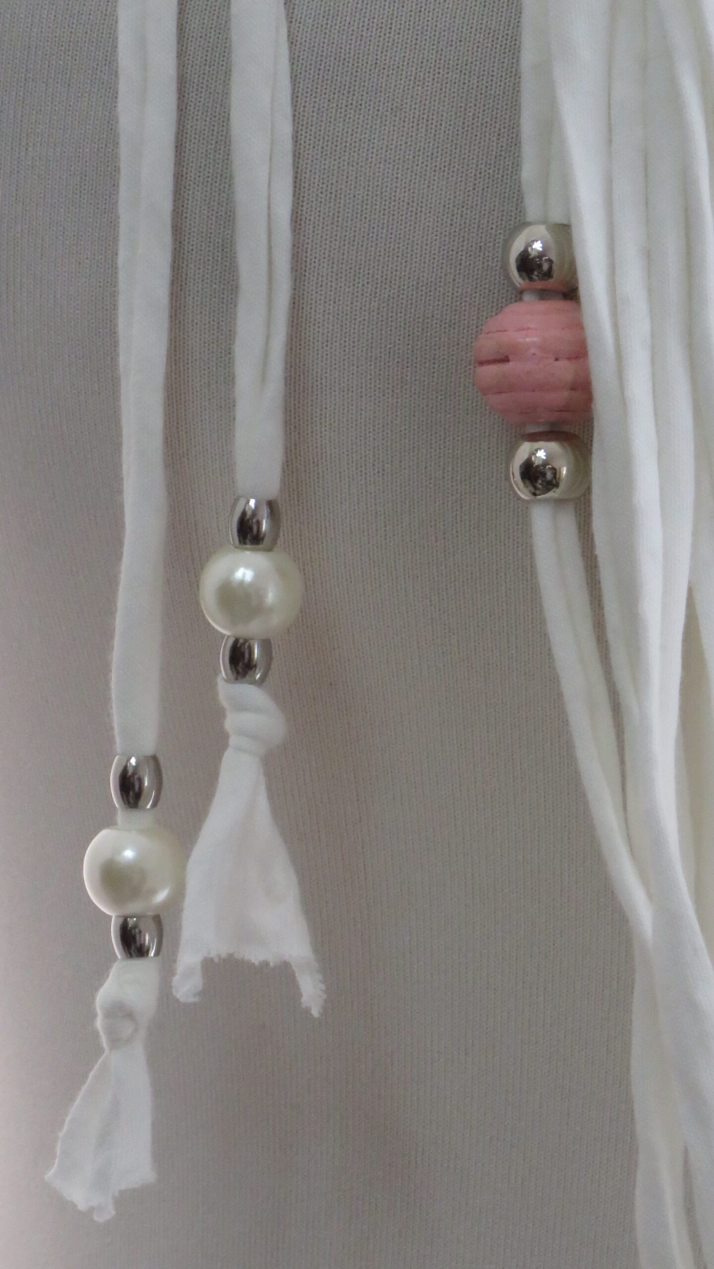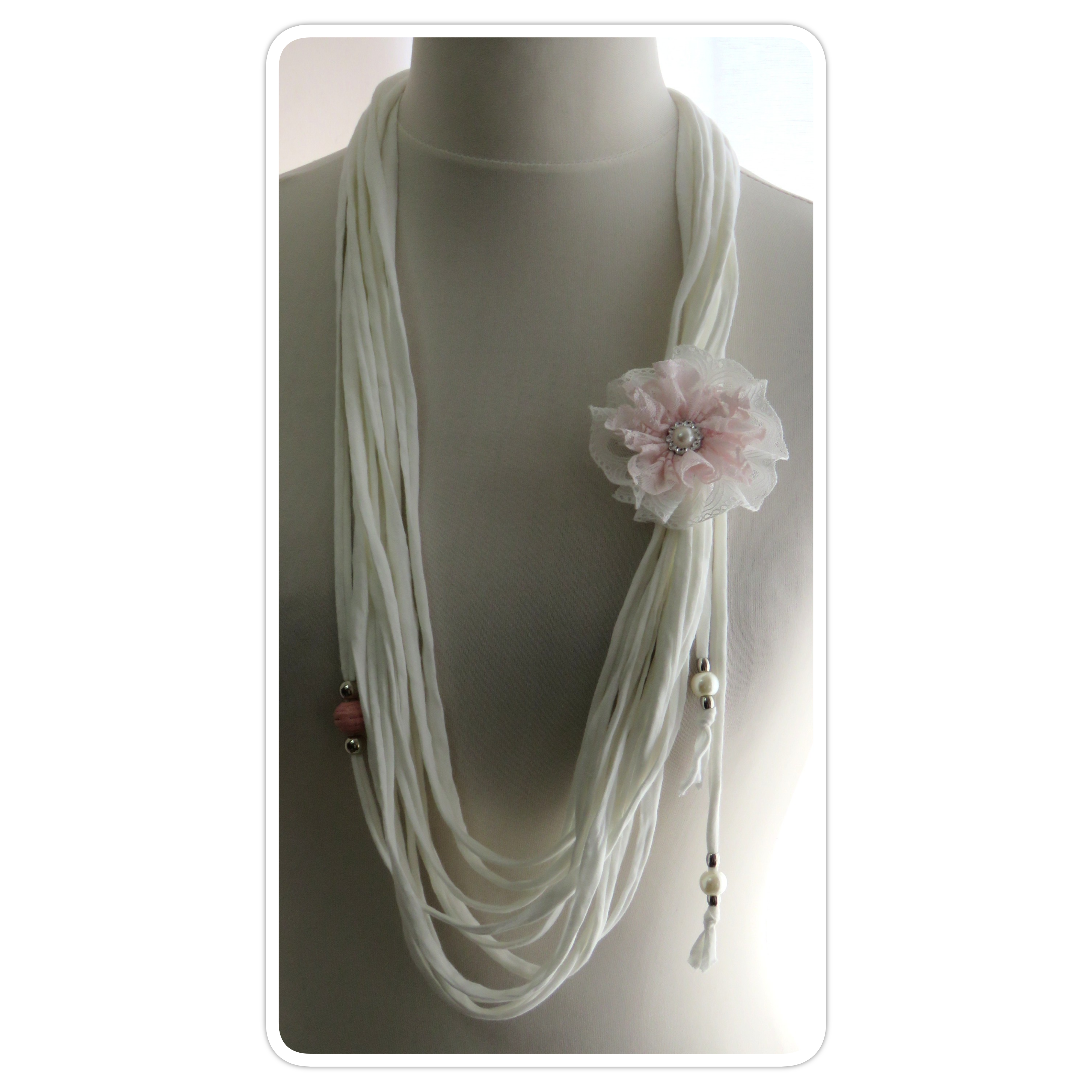 - Comes with a loose strand of the yarn, with faux-pearls and silver-coloured beads on the ends, and a “flower” brooch, made of pale pink and cream lace – these can either be simply attached to the necklace or be used to fasten the necklace in different ways