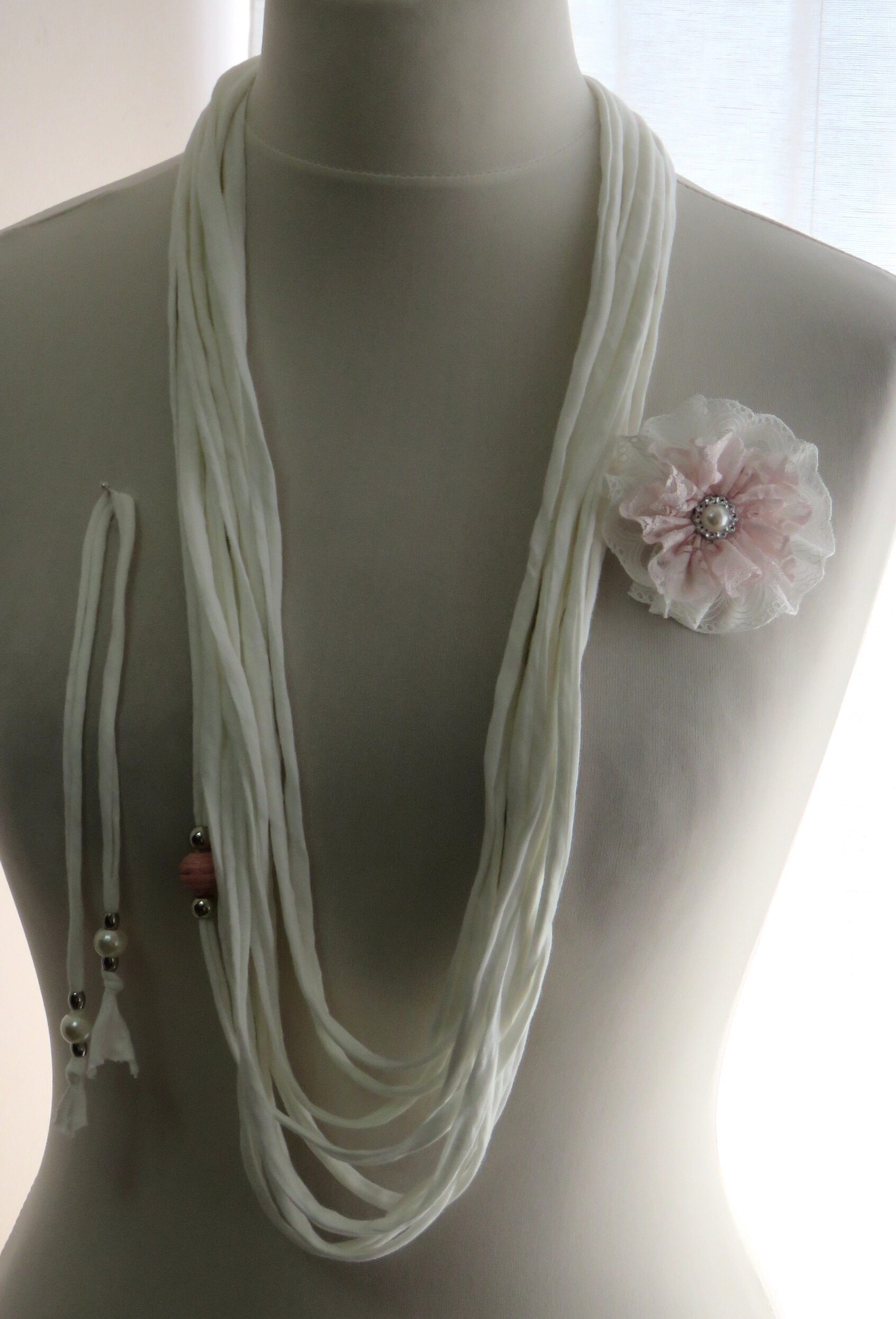 - If you wish to tie the brooch onto the necklace or use it to decorate something else (it looks lovely tied onto a bag or scarf), you can pin it through the loose strand and then tie it on