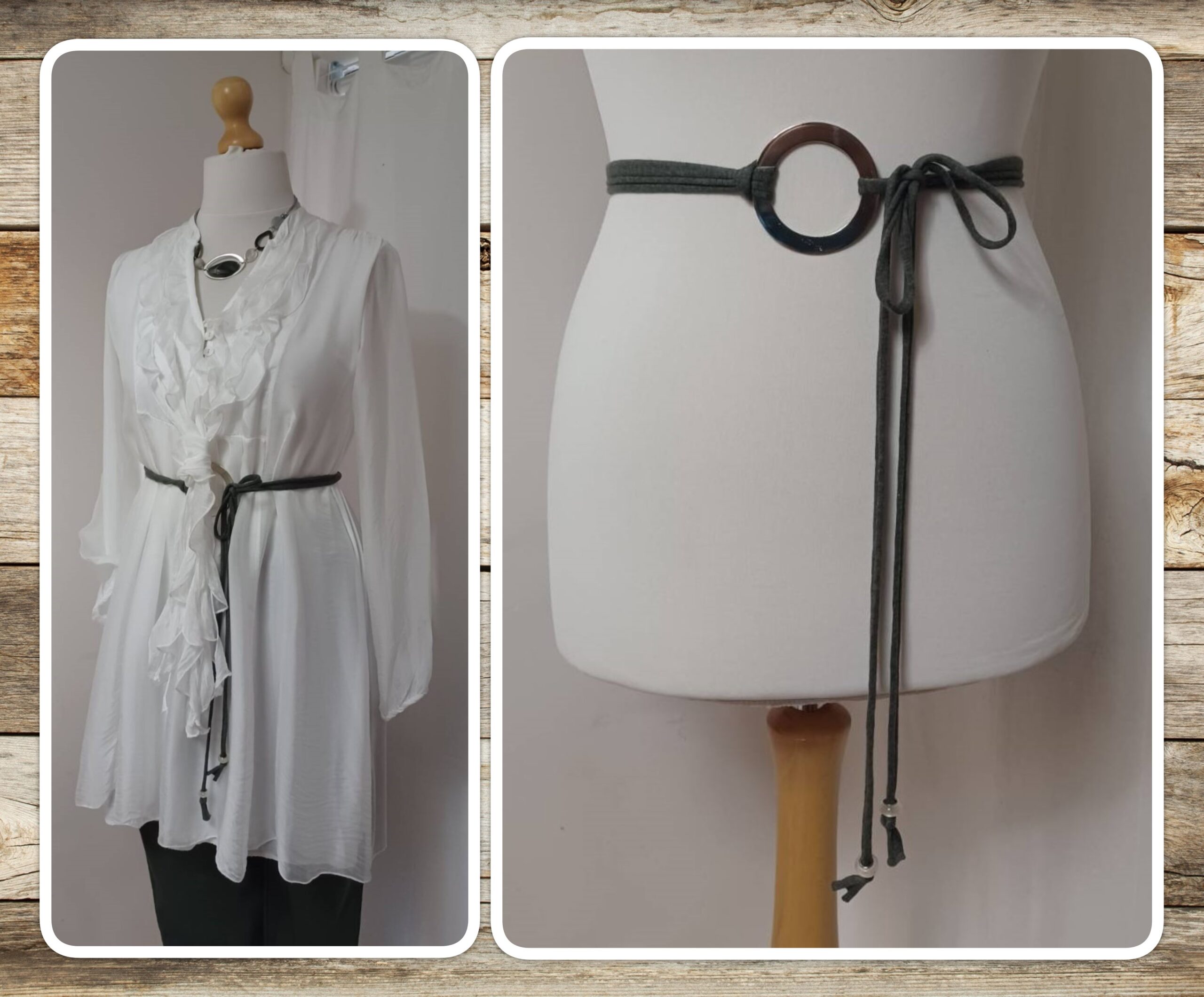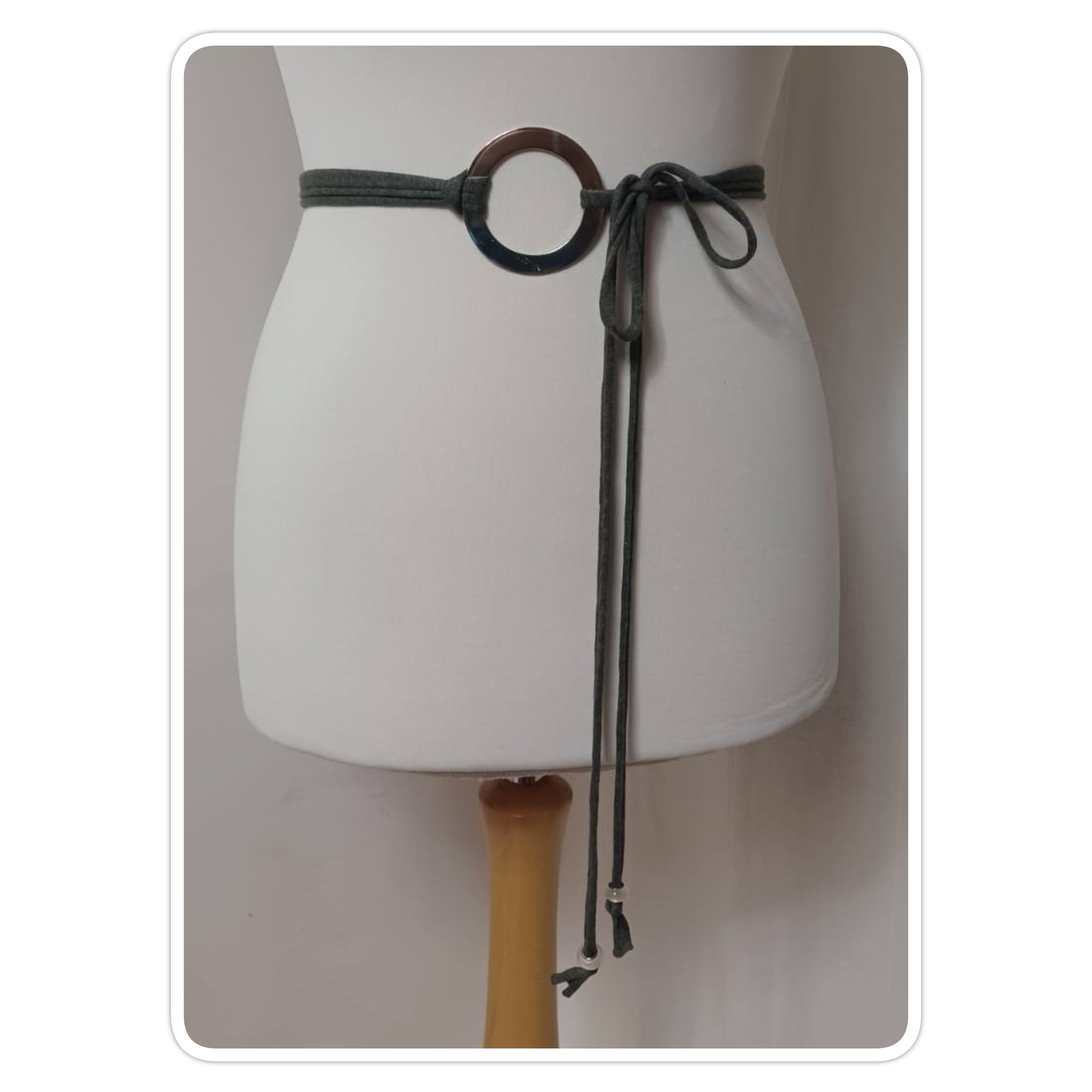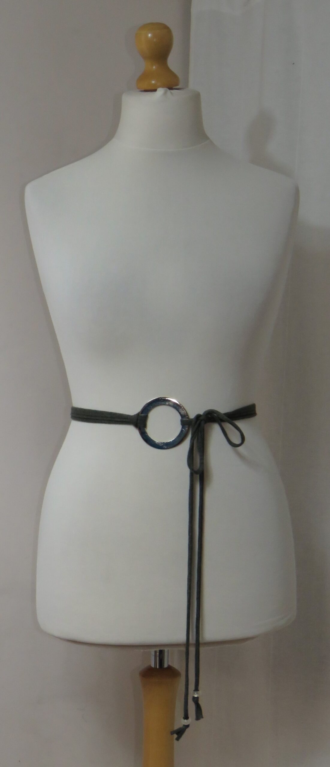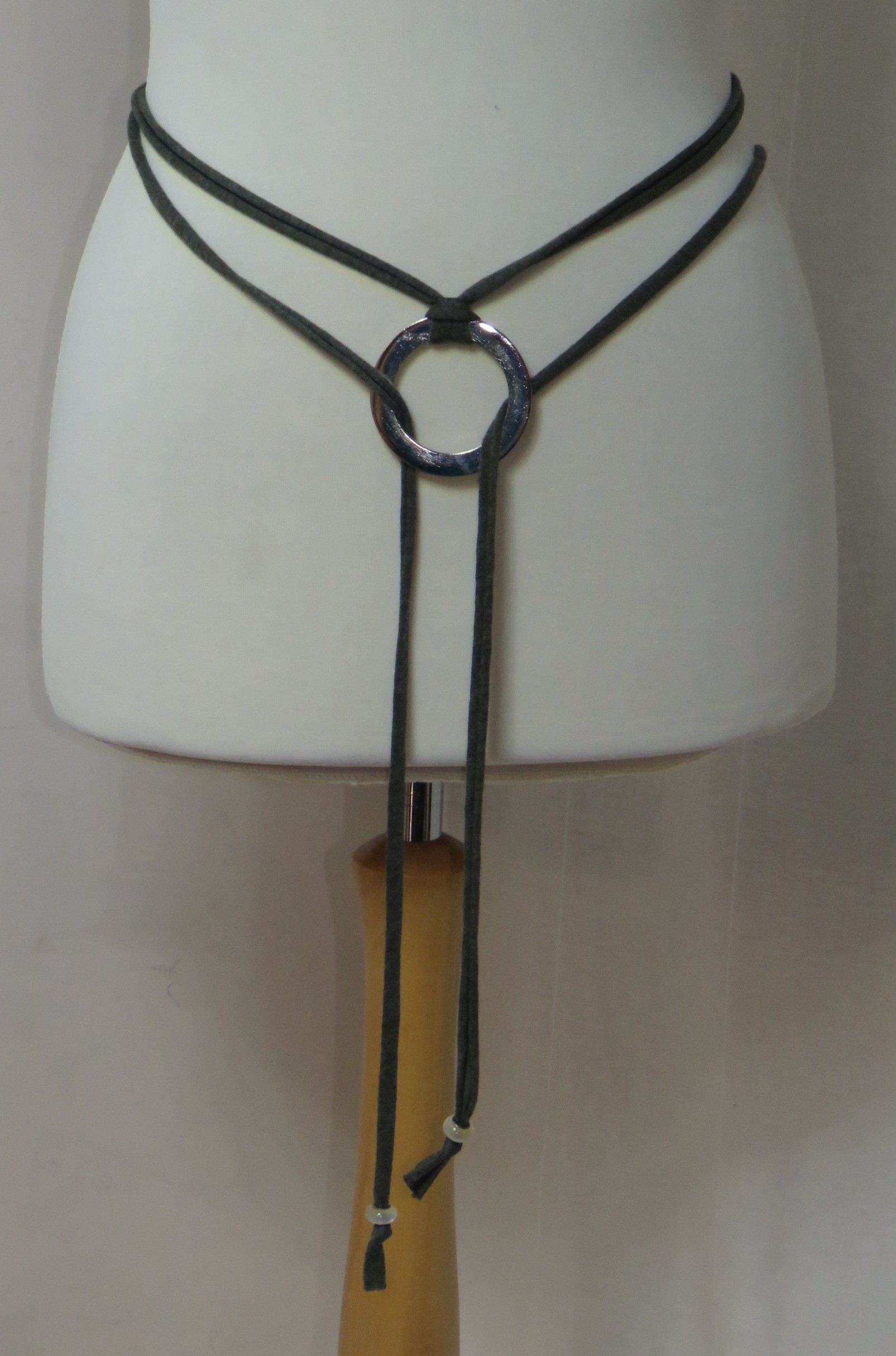 - Lariat style – you simply wrap it around the waist, thread through the ring and tie